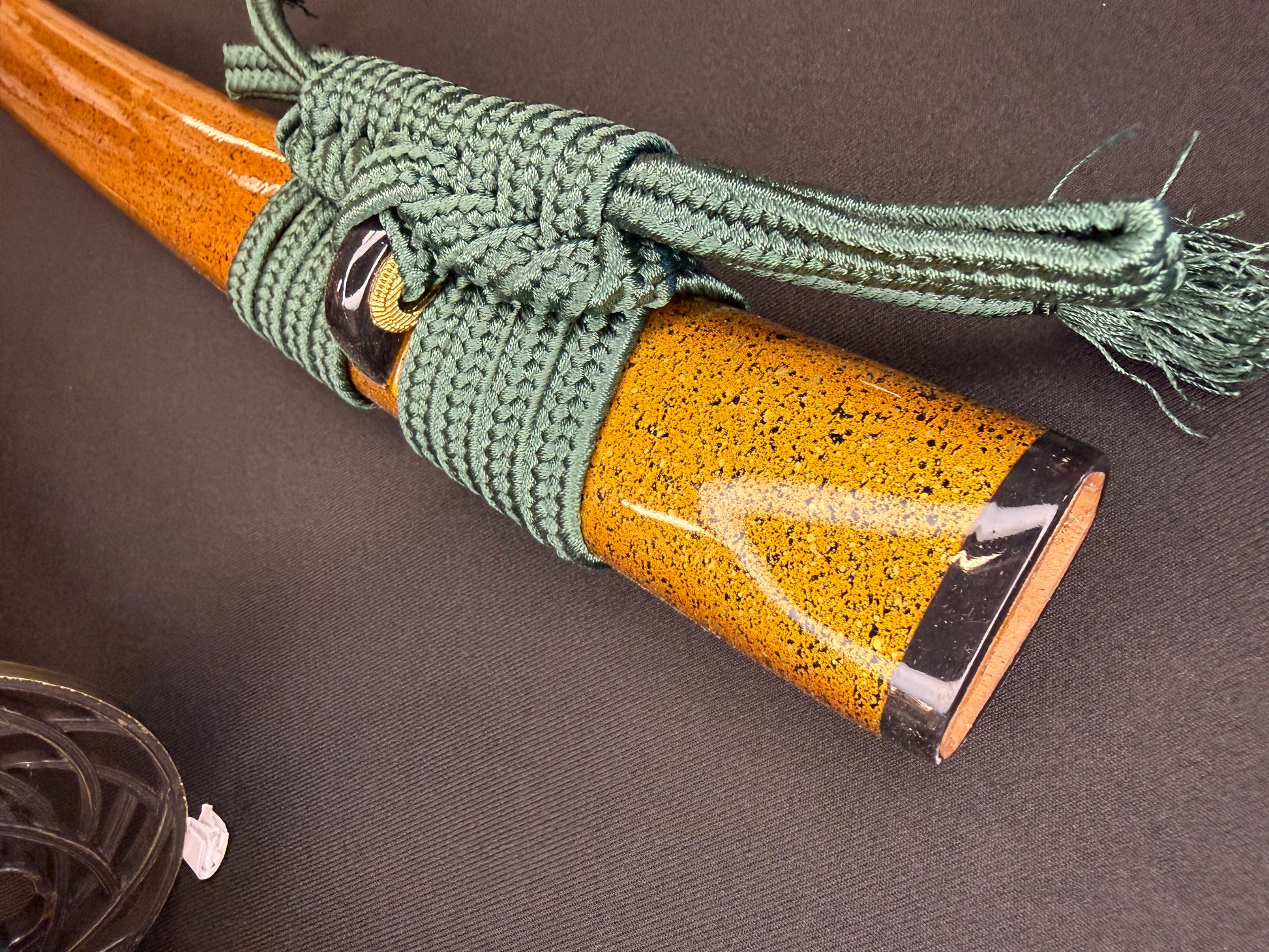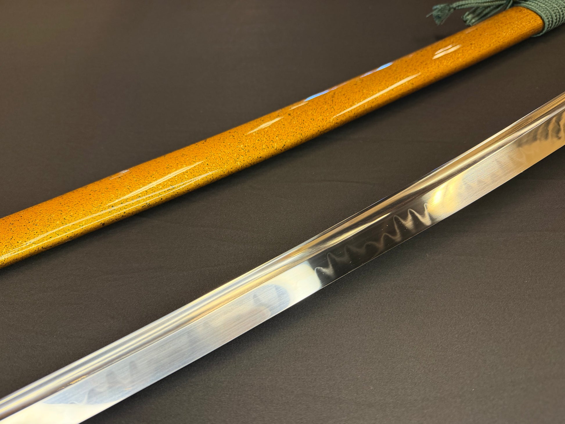 Forged by the master bladesmiths at Phoenix Armory, this katana blends traditional craftsmanship with modern performance. The 29.25" blade is hand-forged from resilient T10 tool steel and differentially hardened to reveal a natural hamon temper line, delivering exceptional edge retention and cutting power. A 12" handle wrapped in green synthetic silk provides a secure, balanced grip, while the striking orange scabbard with black fleck adds a bold visual contrast. Built for practitioners and collectors alike, this katana embodies precision, strength, and refined artistry.