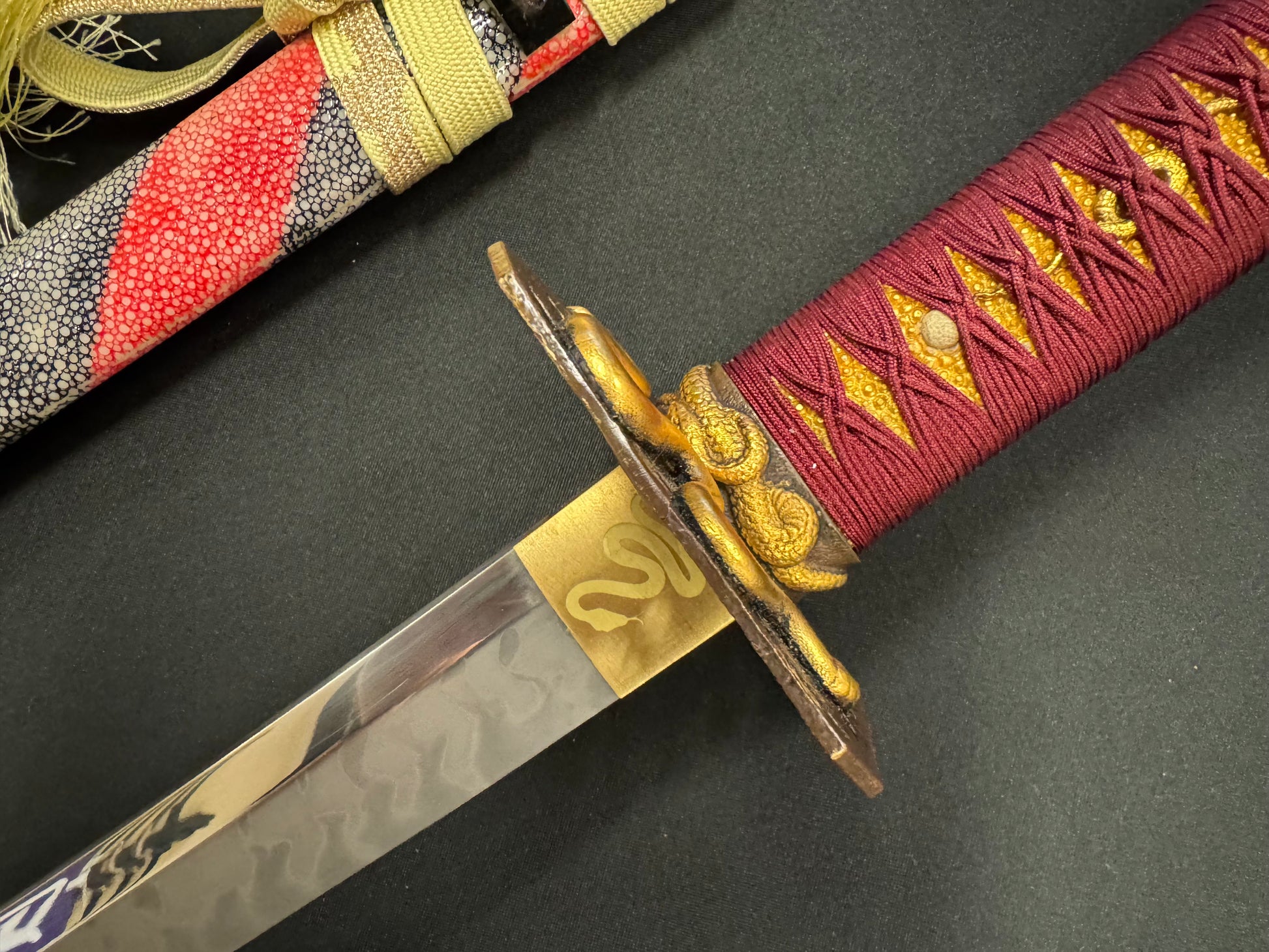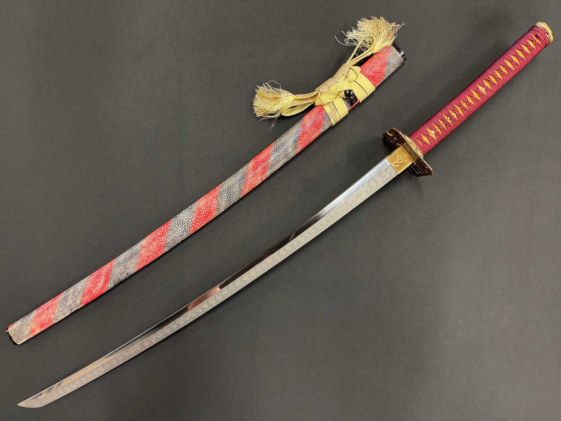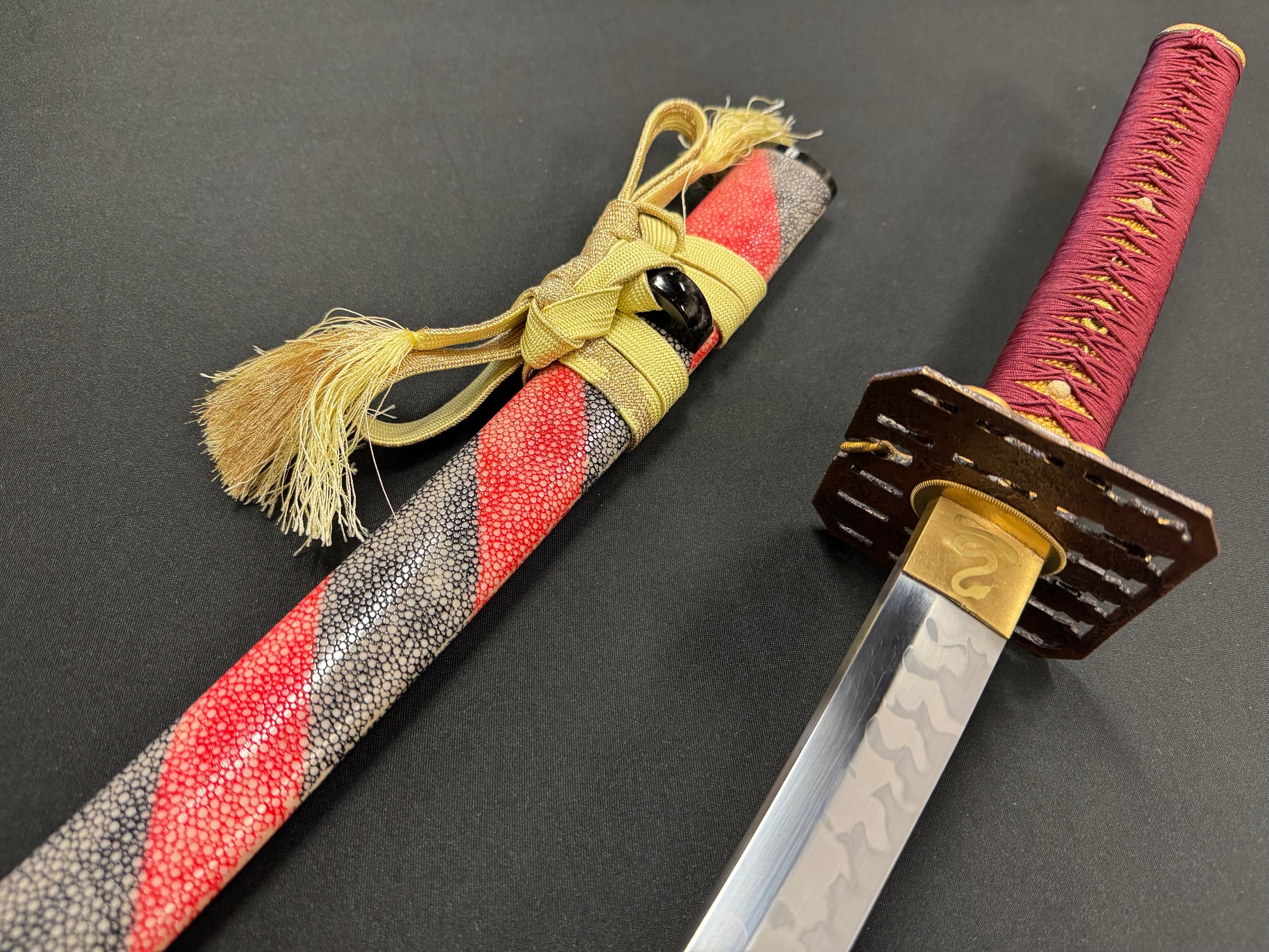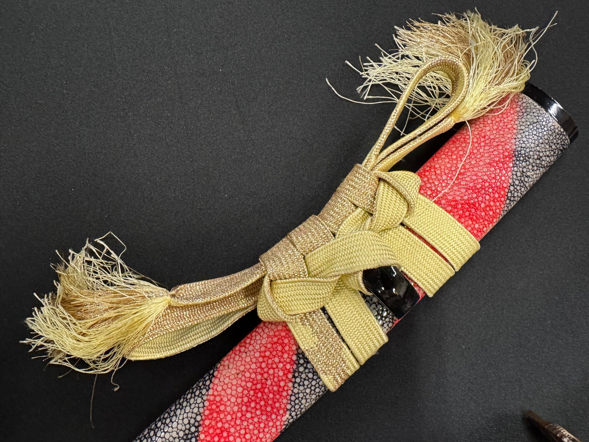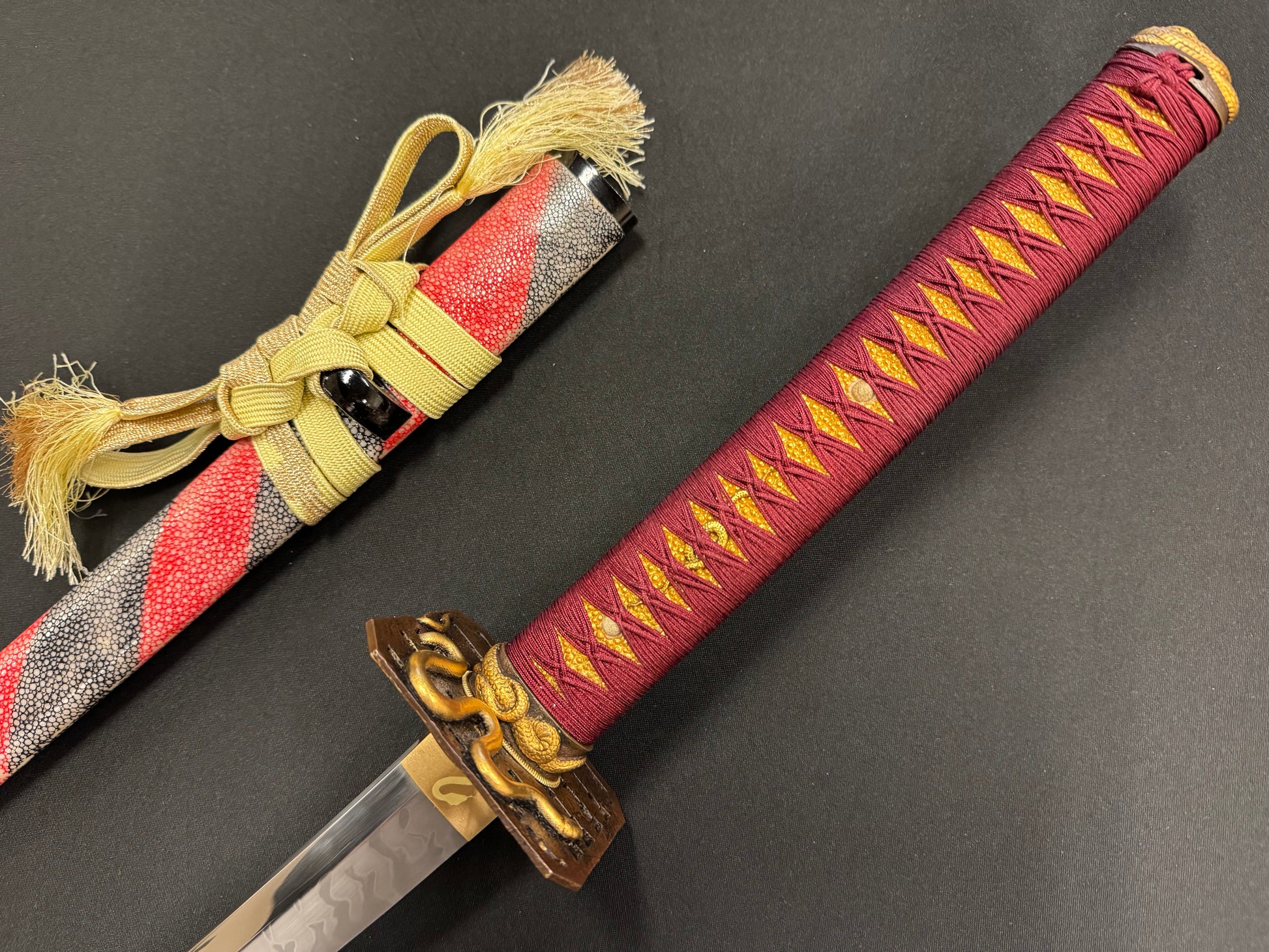 Handle details: Hardwood with authentic golden dyed ray skin, crimson red genuine silk Ito, jabaramaki wrap