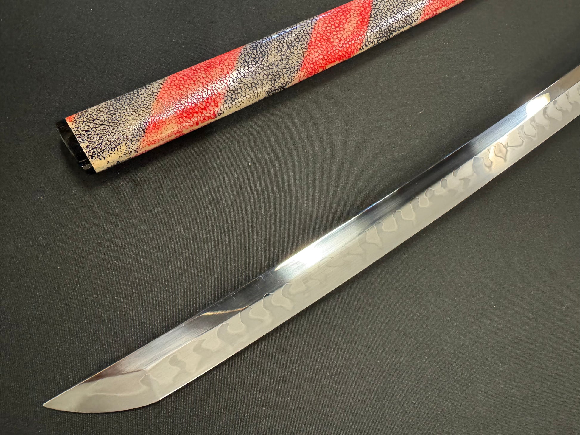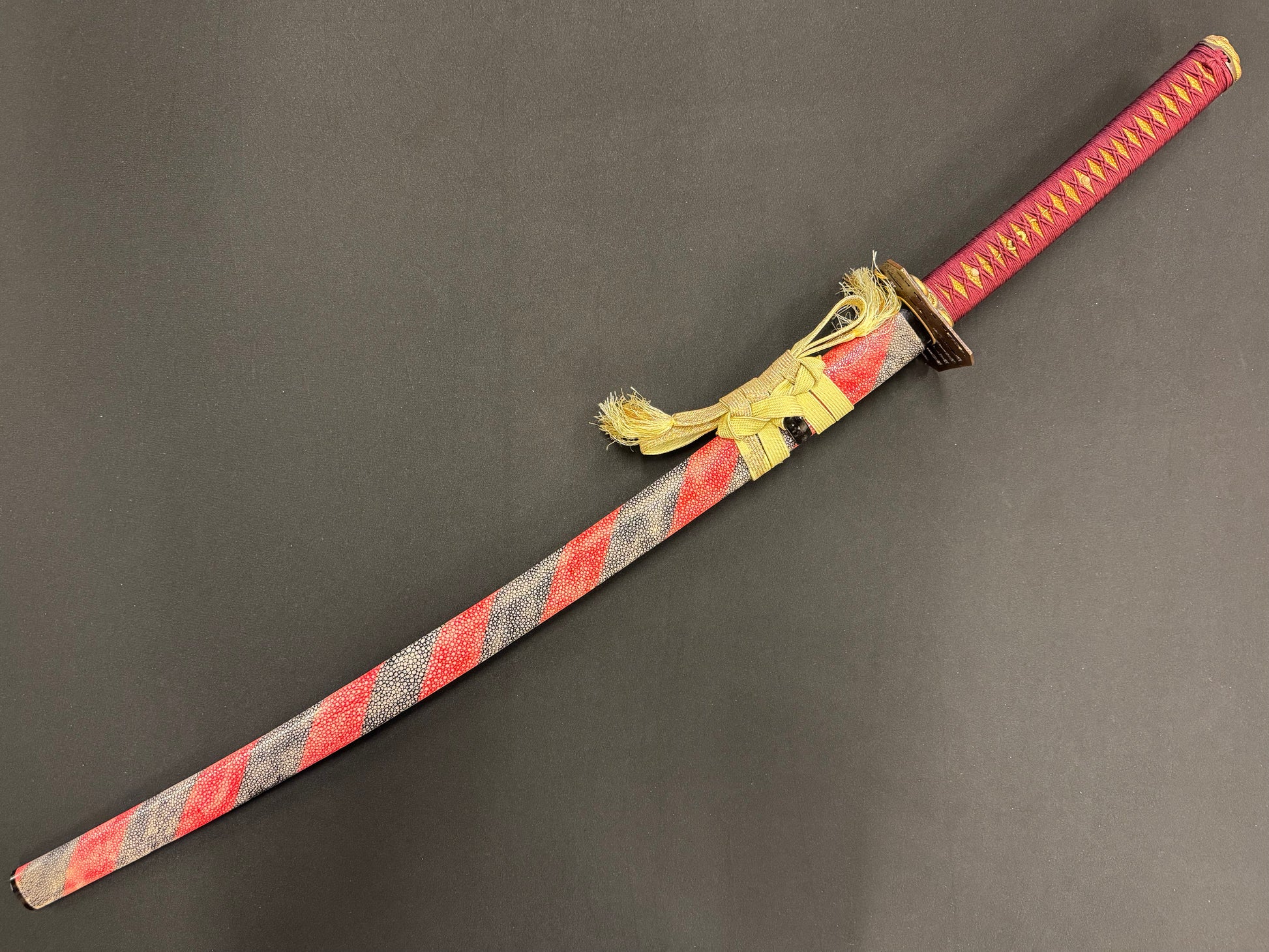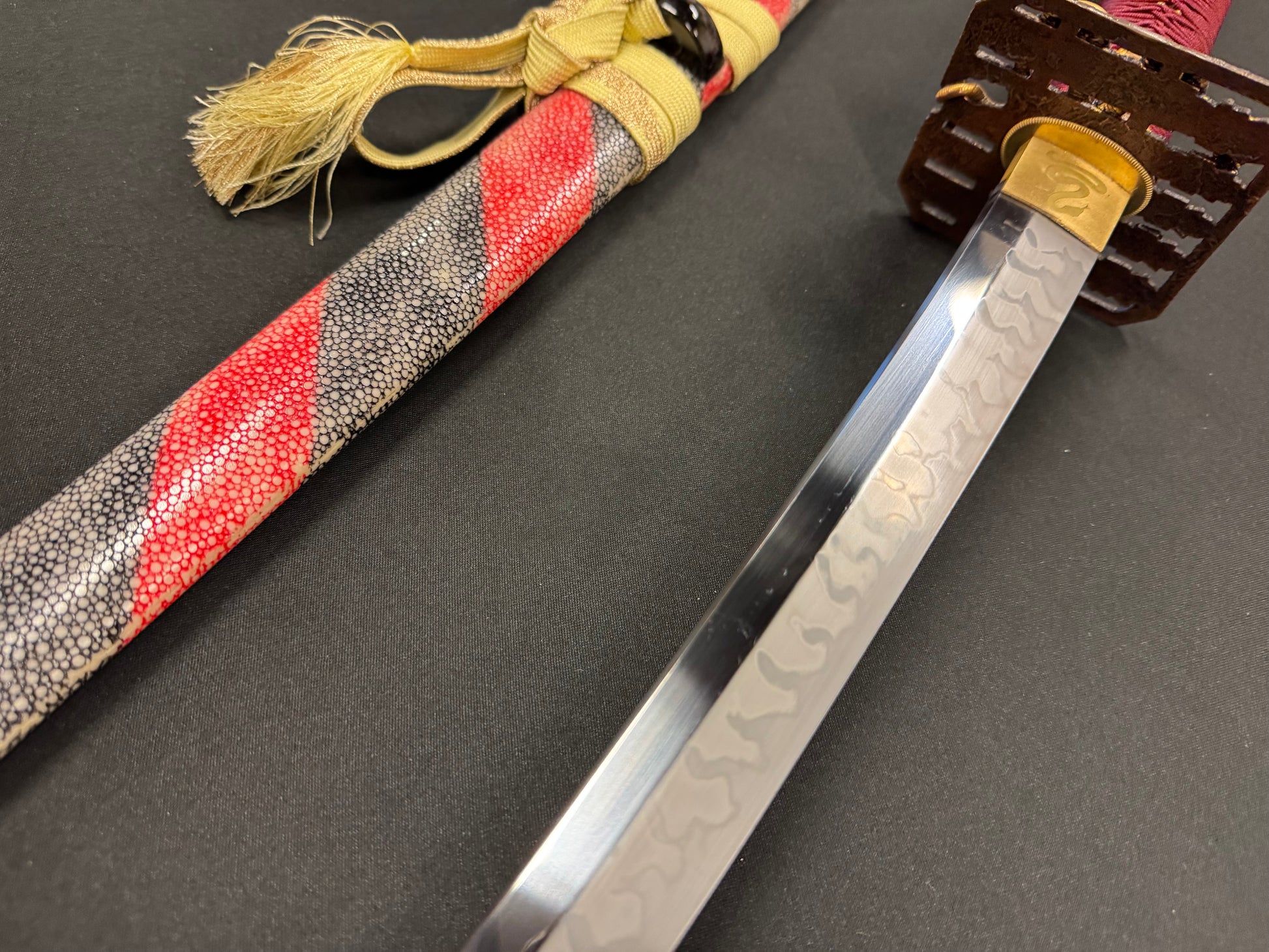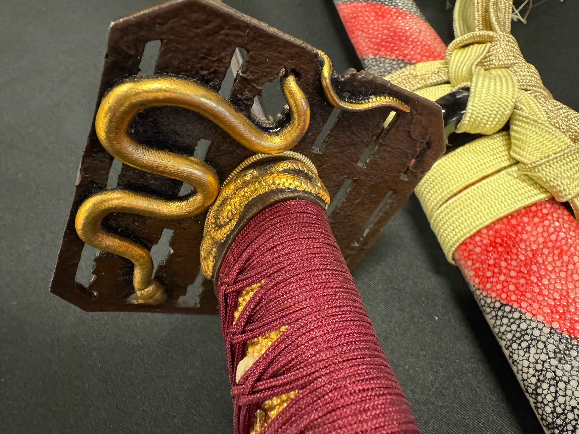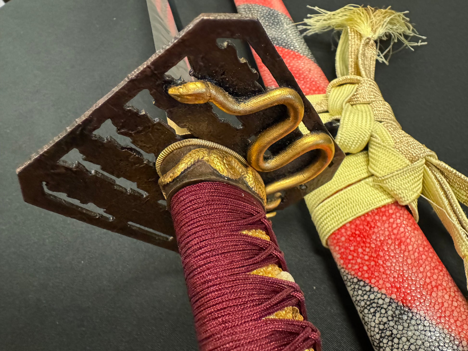 Handle details: Hardwood with authentic golden dyed ray skin, crimson red genuine silk Ito, jabaramaki wrap