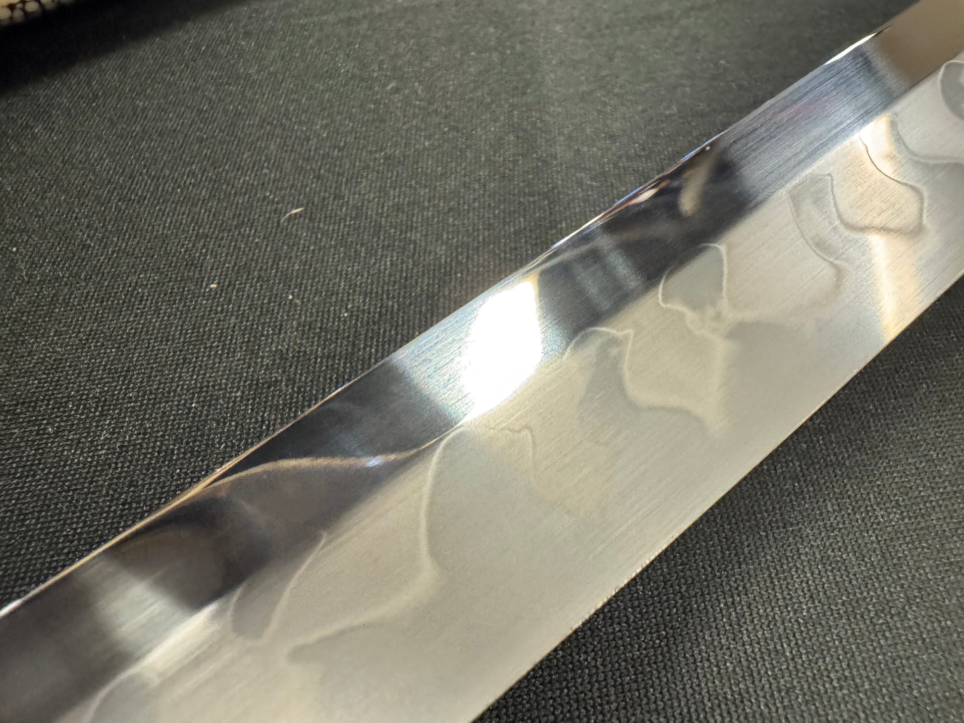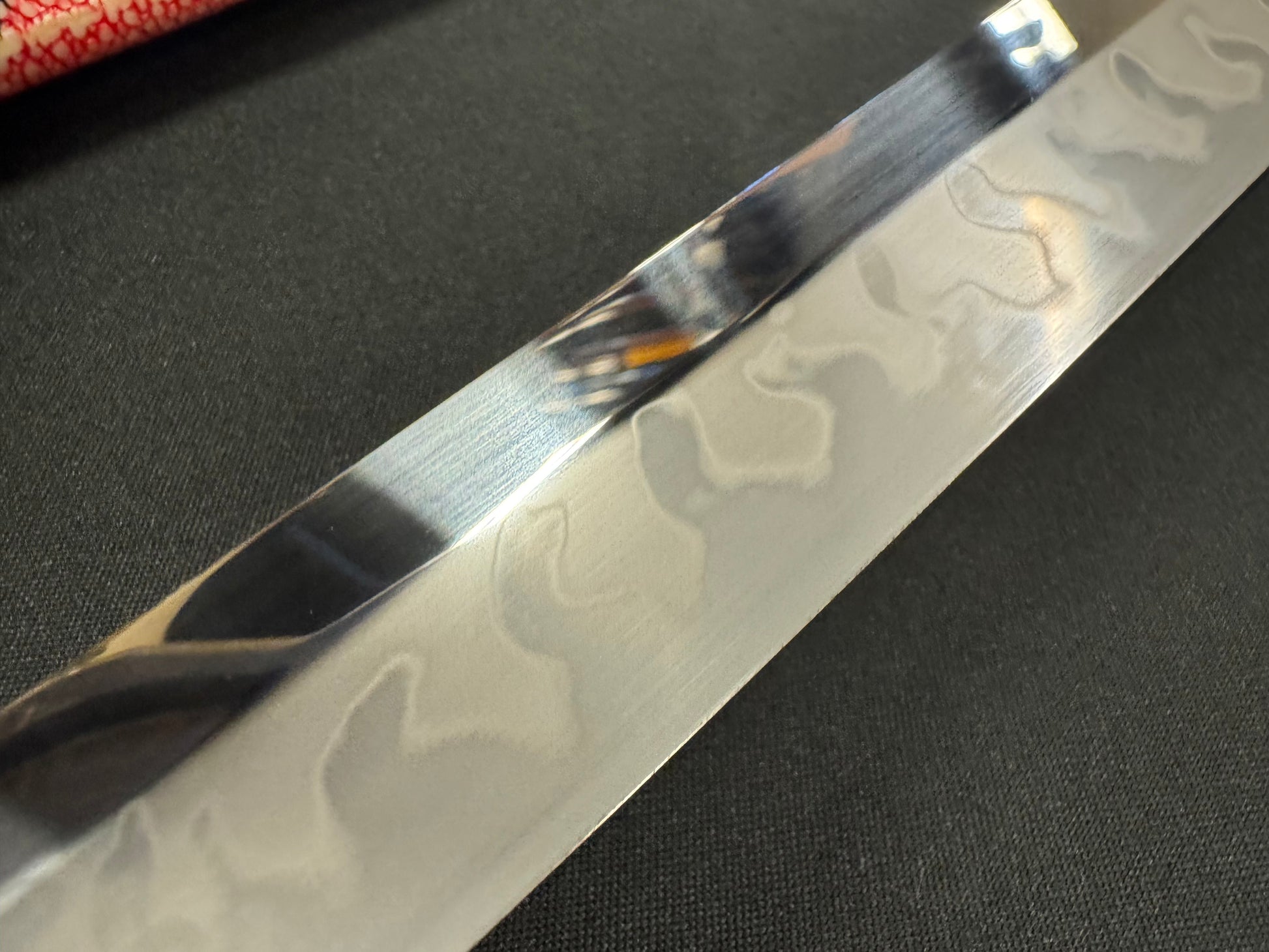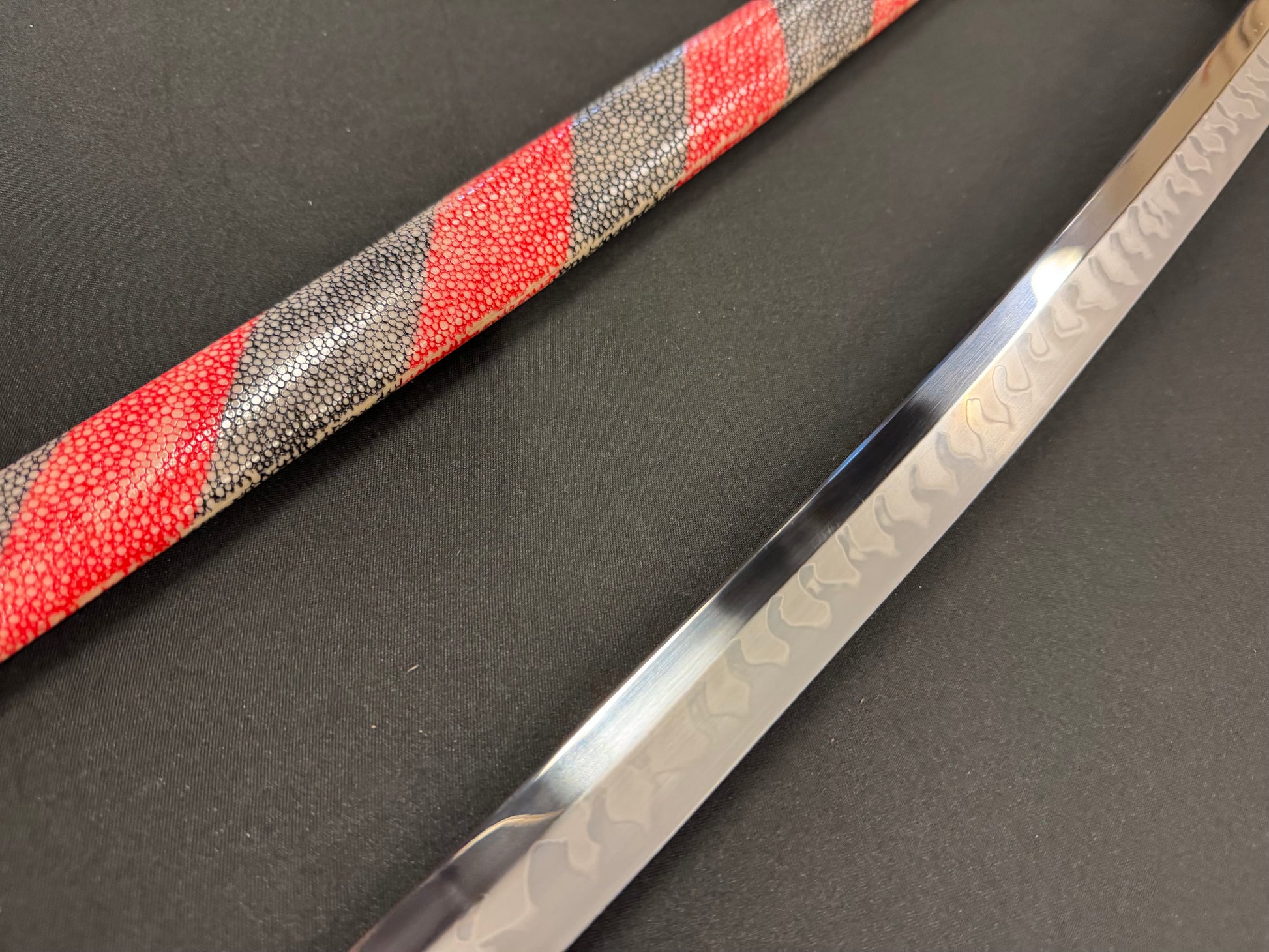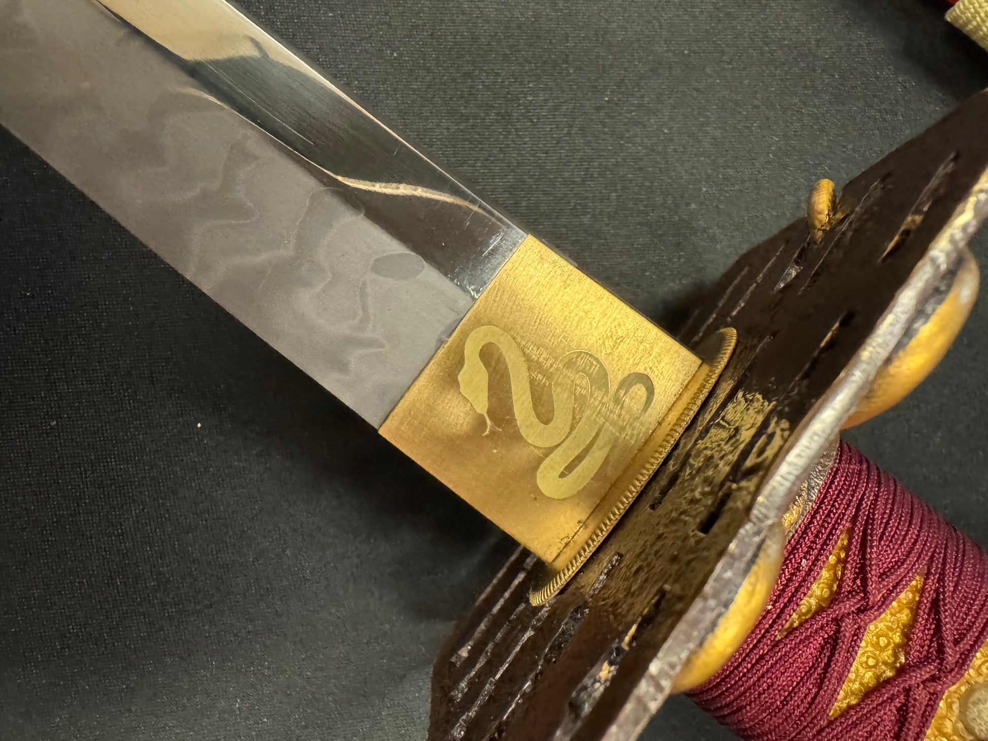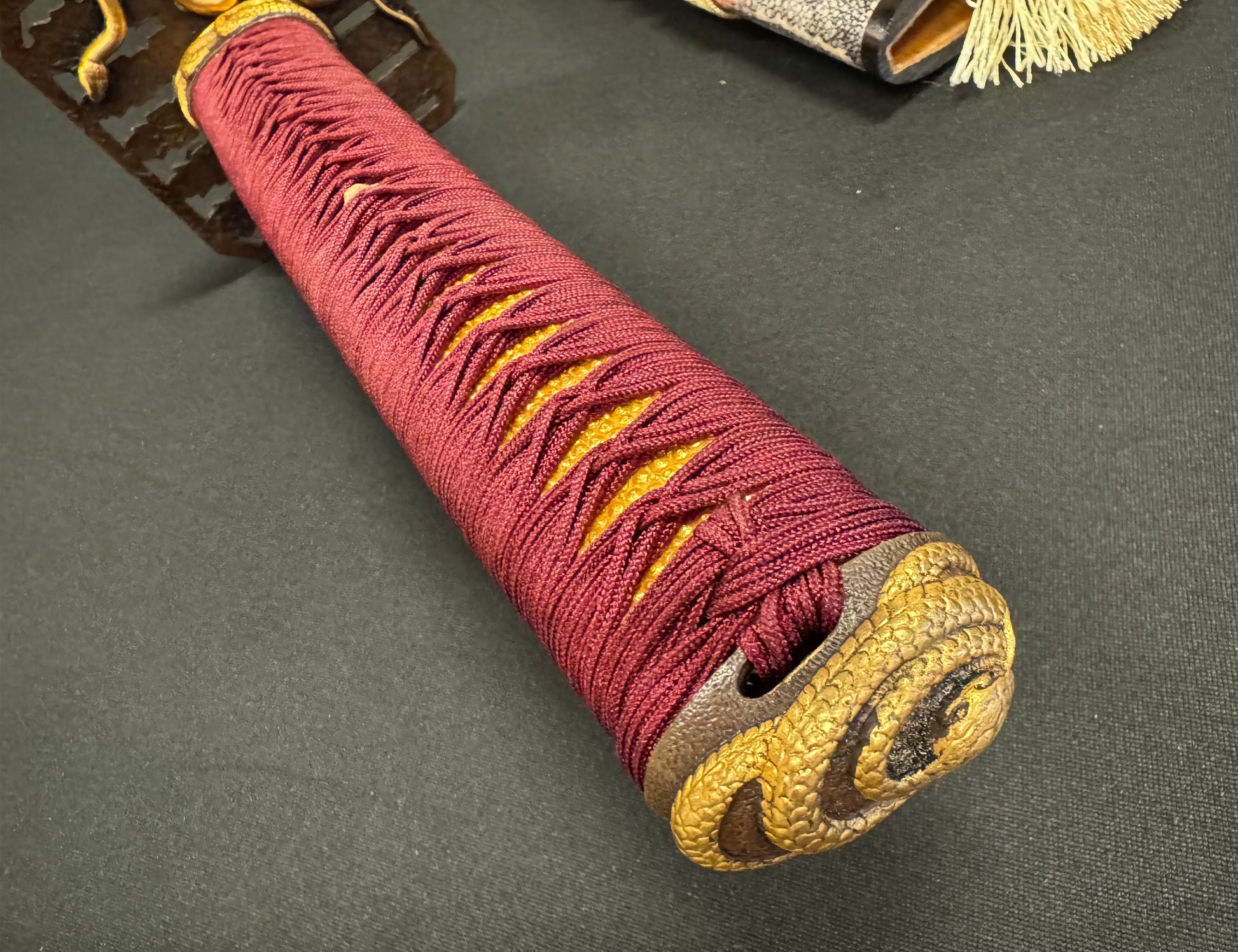 Handle details: Hardwood with authentic golden dyed ray skin, crimson red genuine silk Ito, jabaramaki wrap