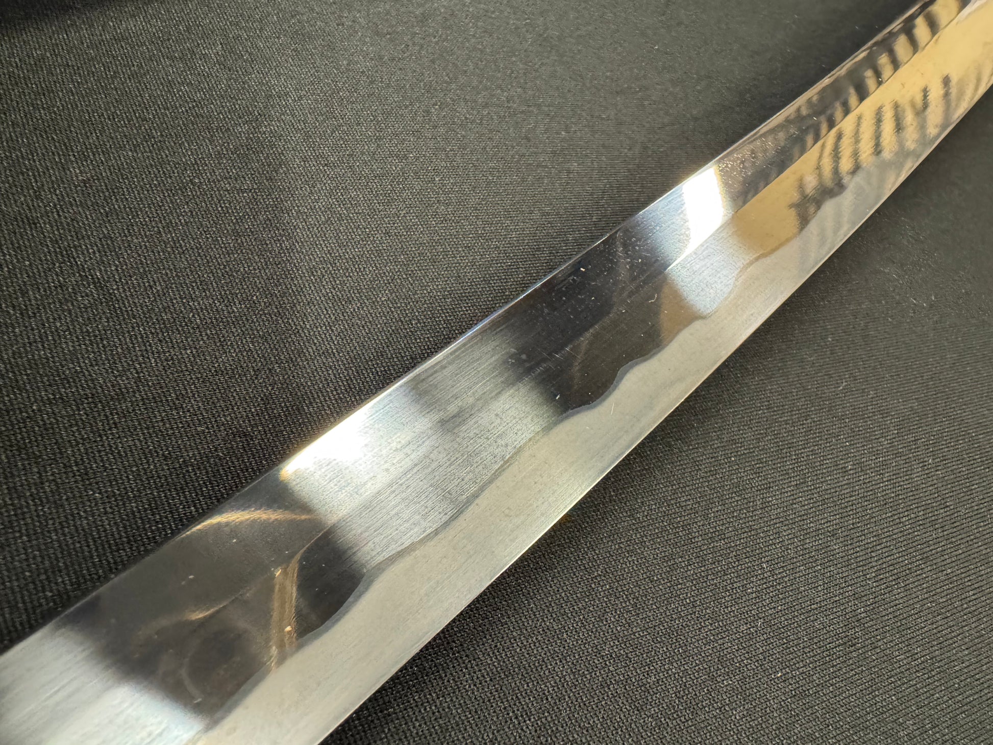 Blade: forged 65Mn, full tang. Brushed Hamon temper line