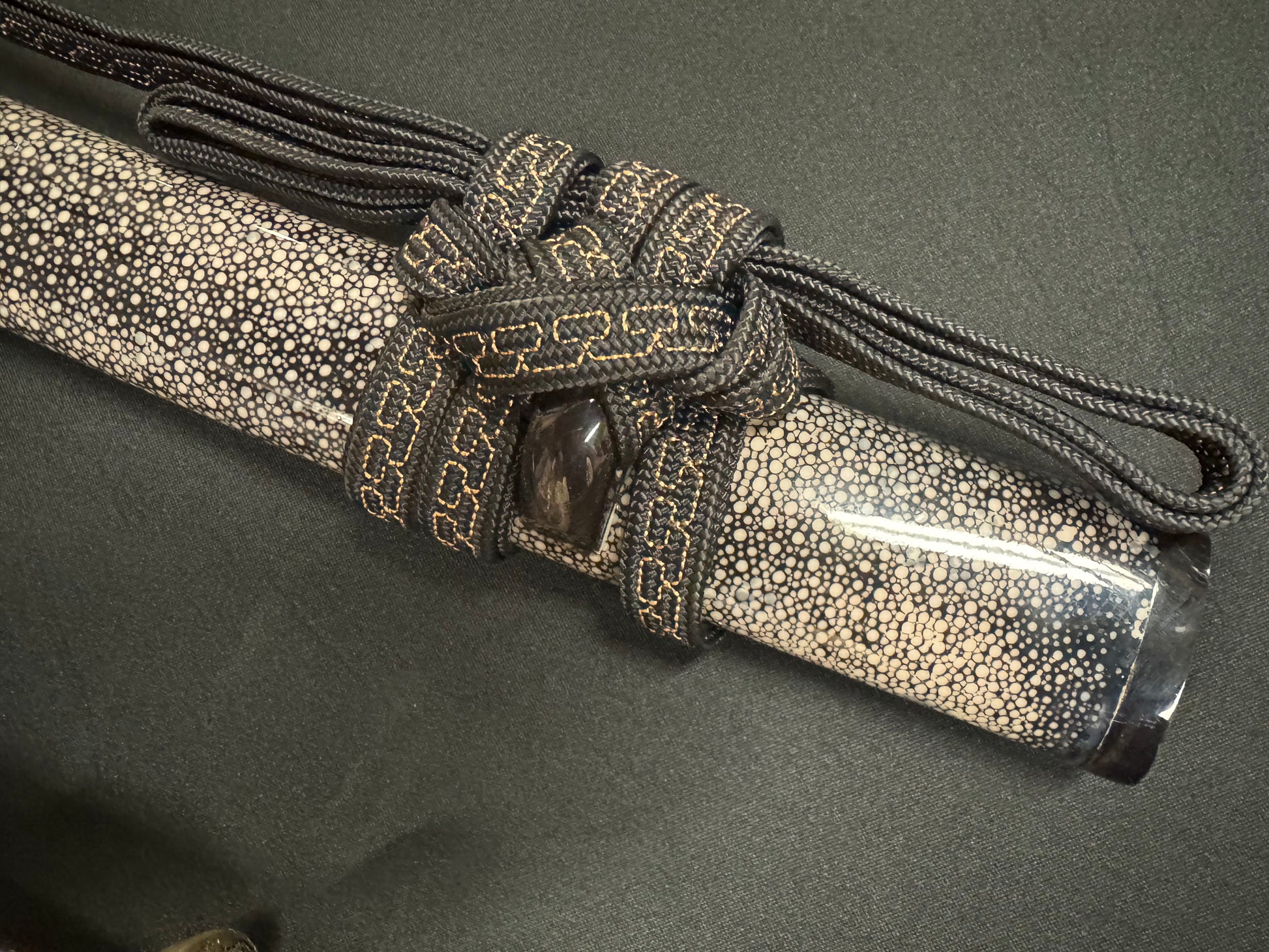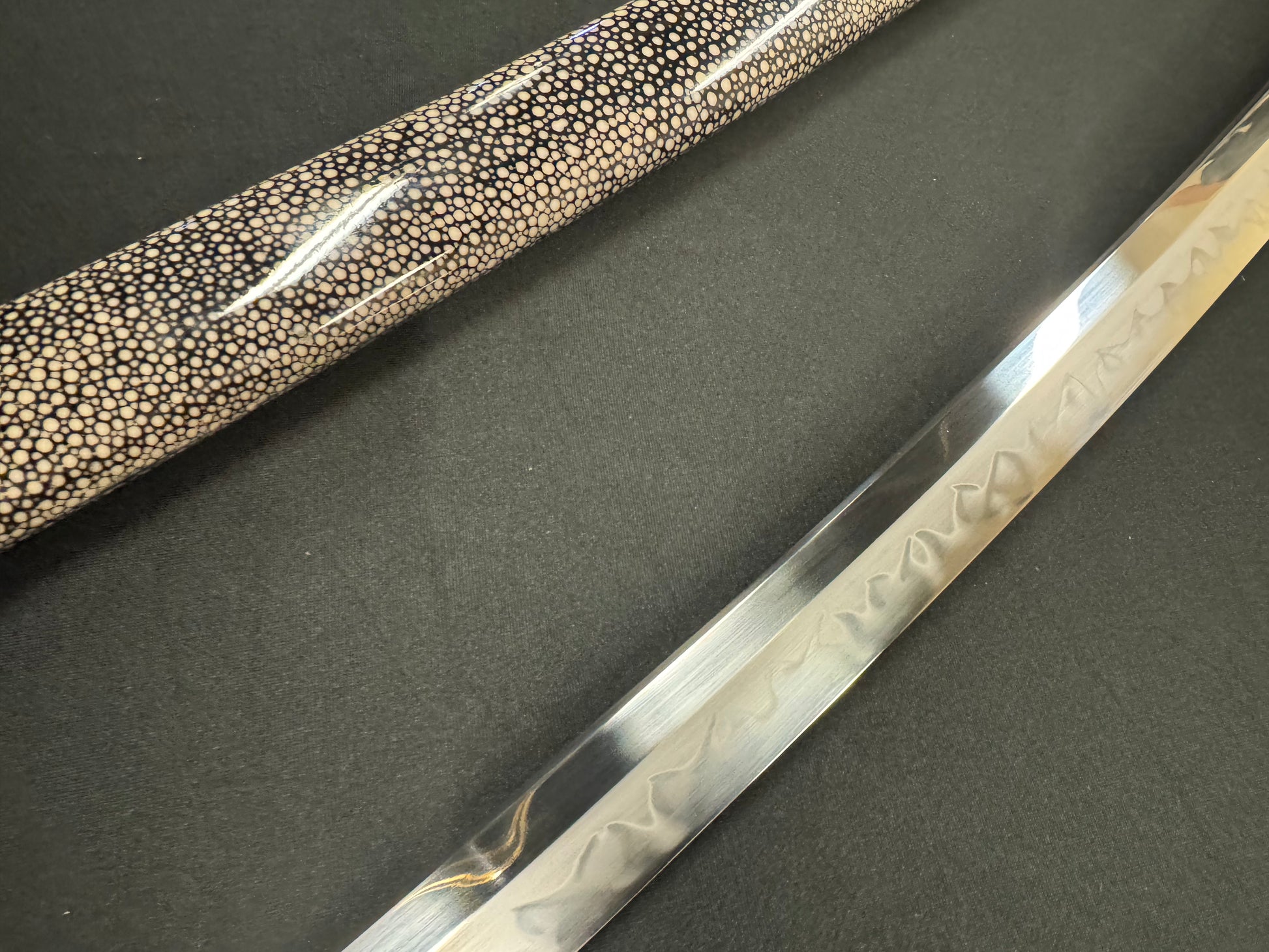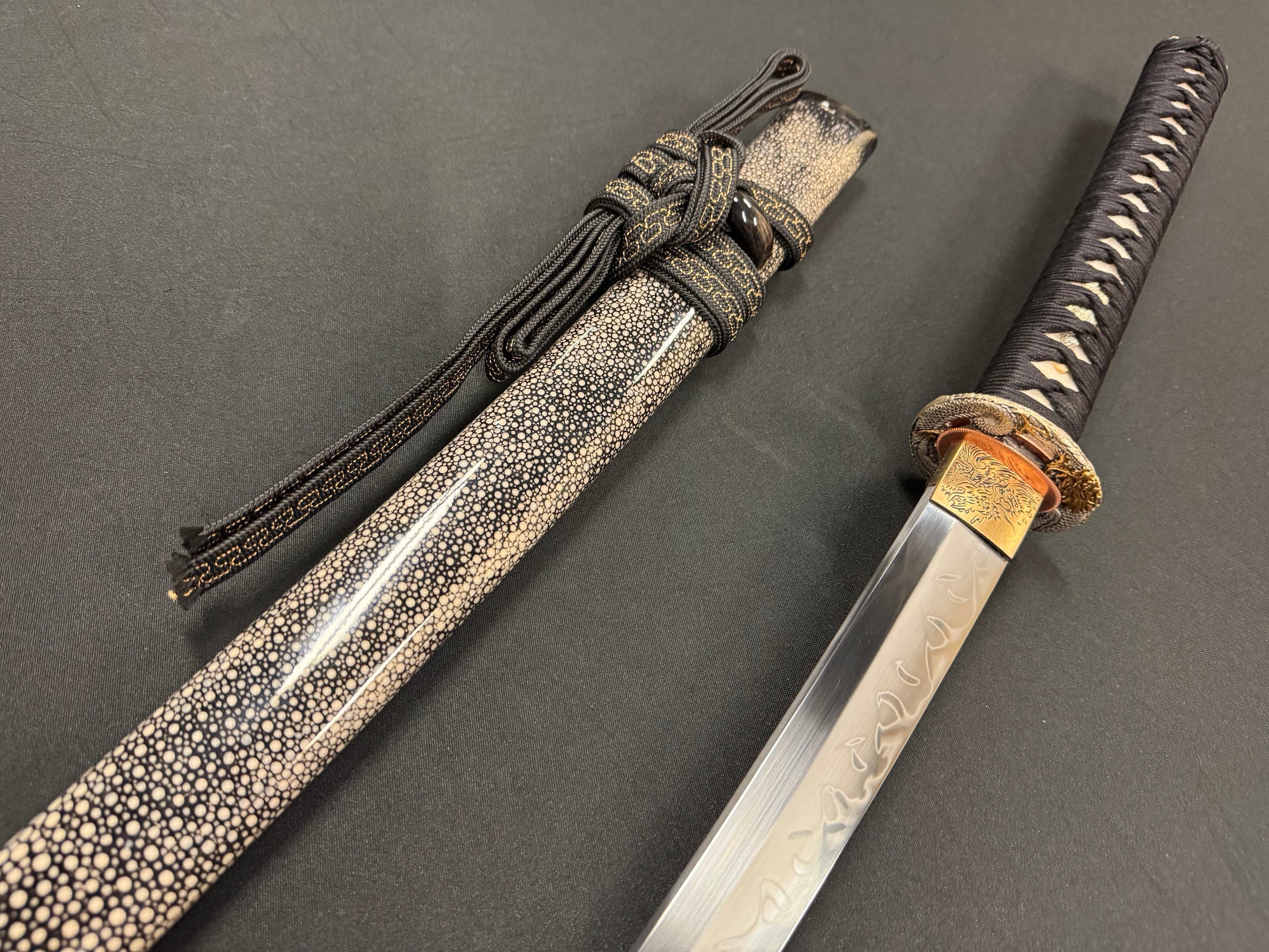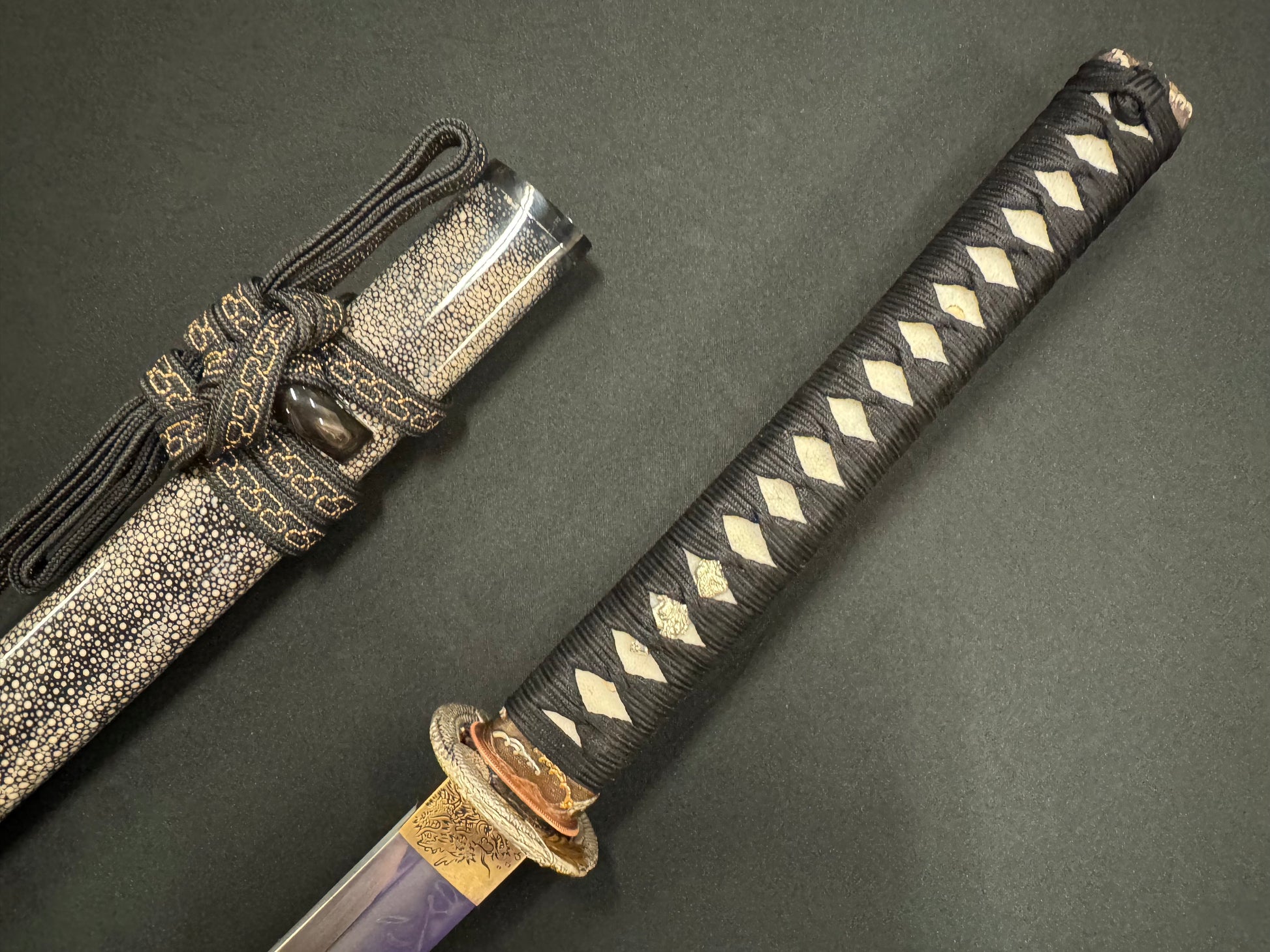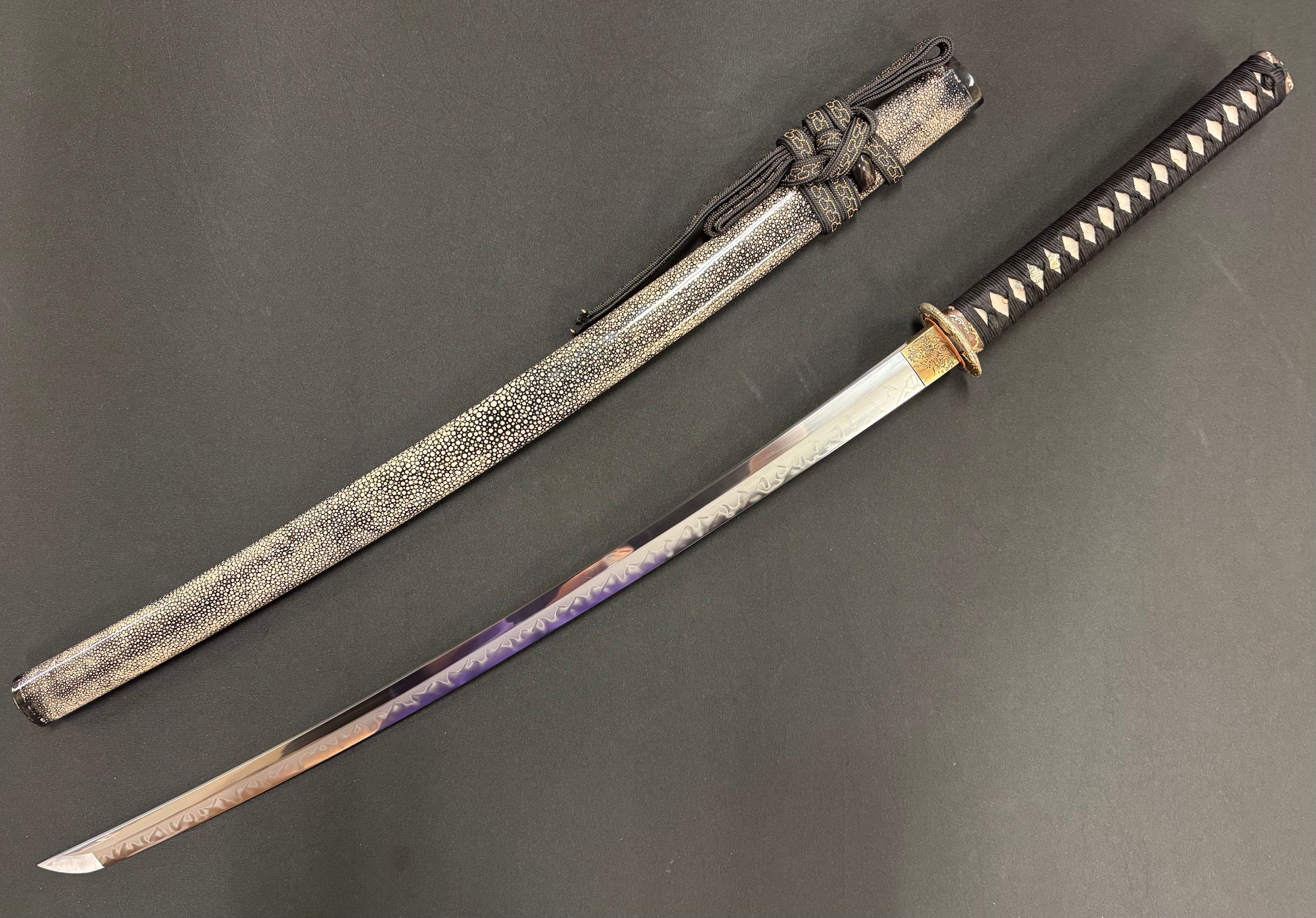Handle details: Hardwood with authentic white ray skin, black synthetic silk Ito