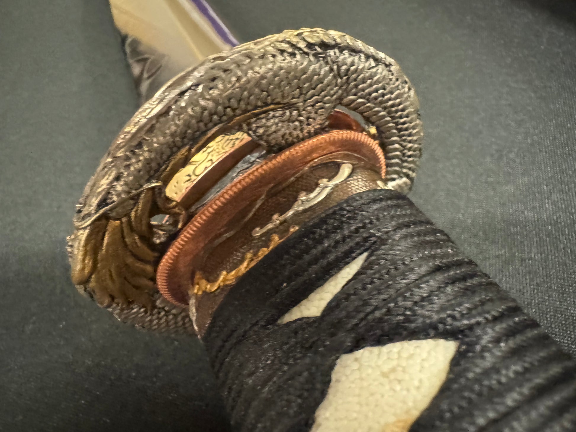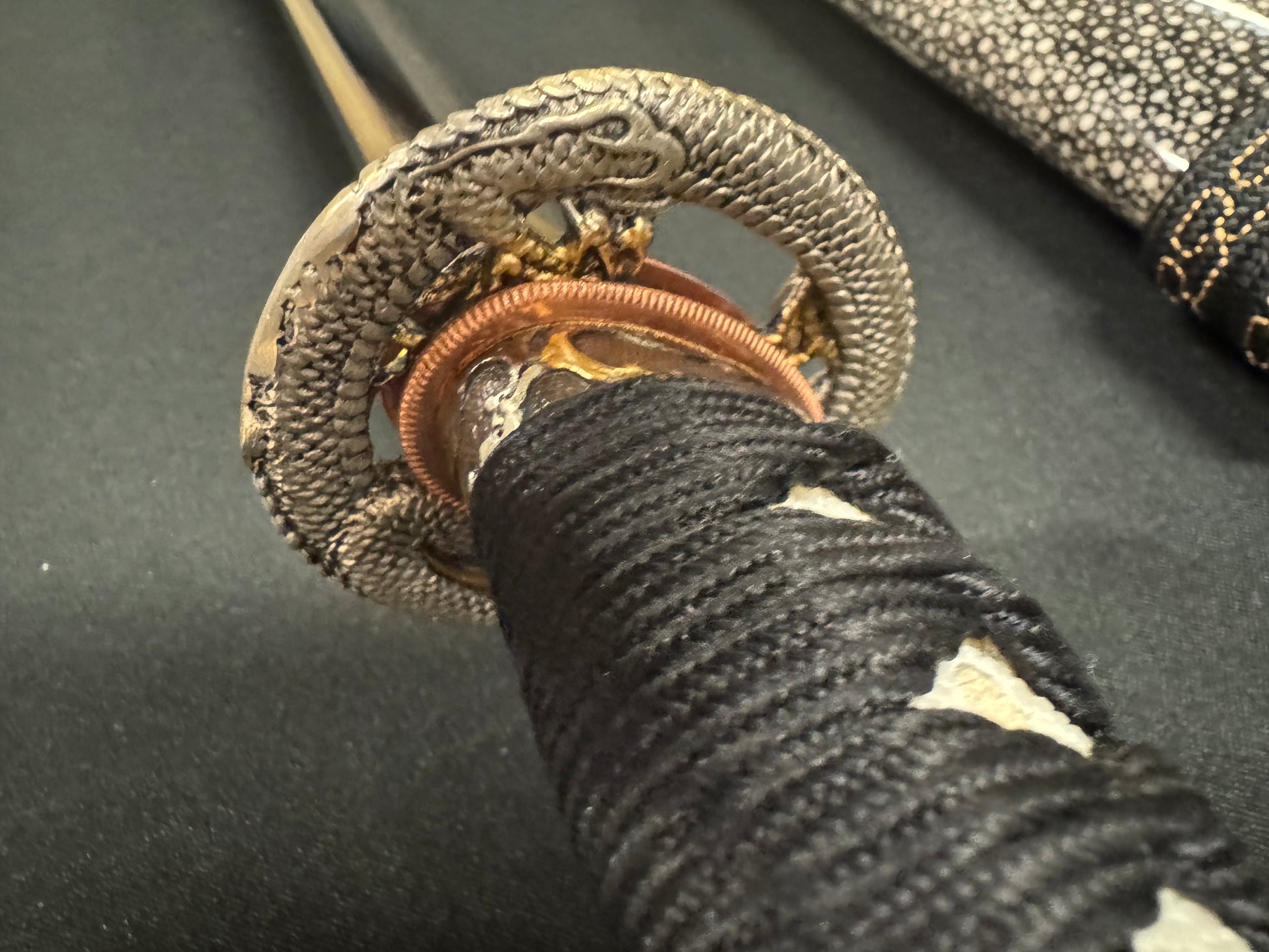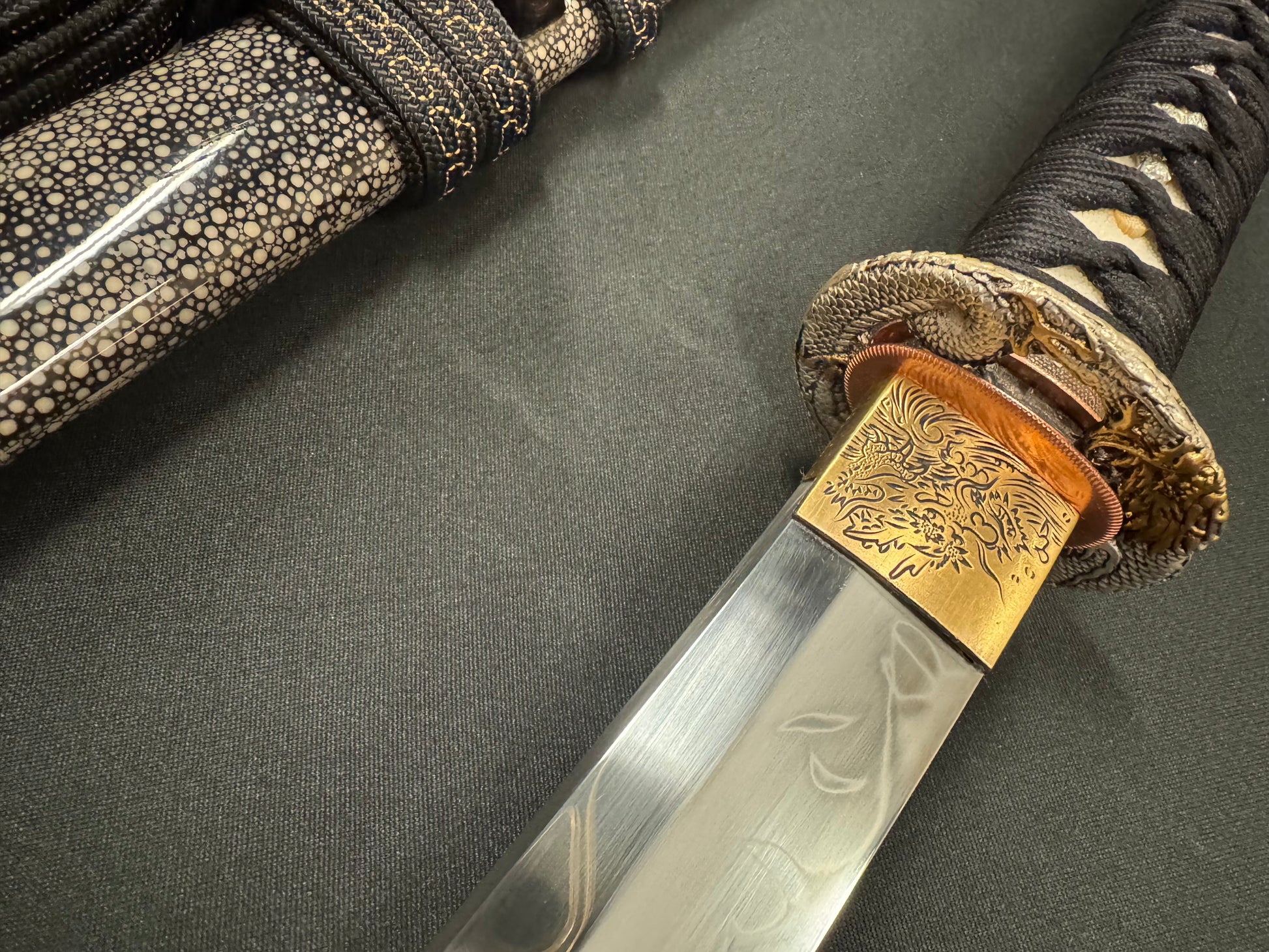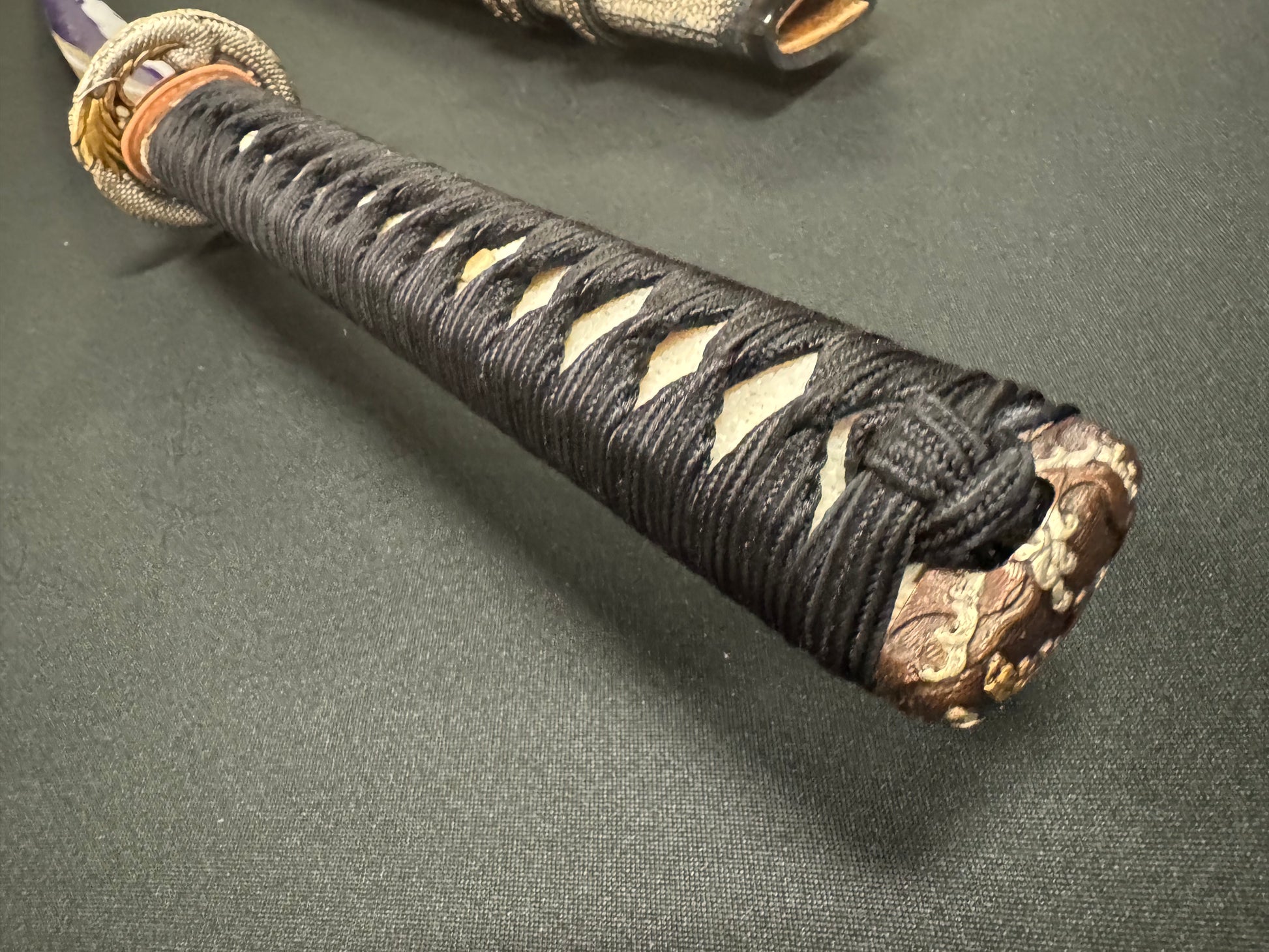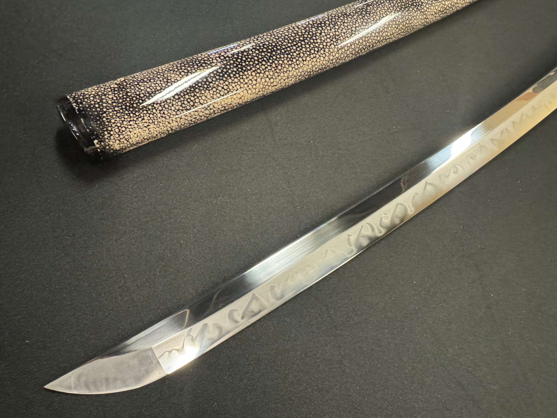 Handle details: Hardwood with authentic white ray skin, black synthetic silk Ito