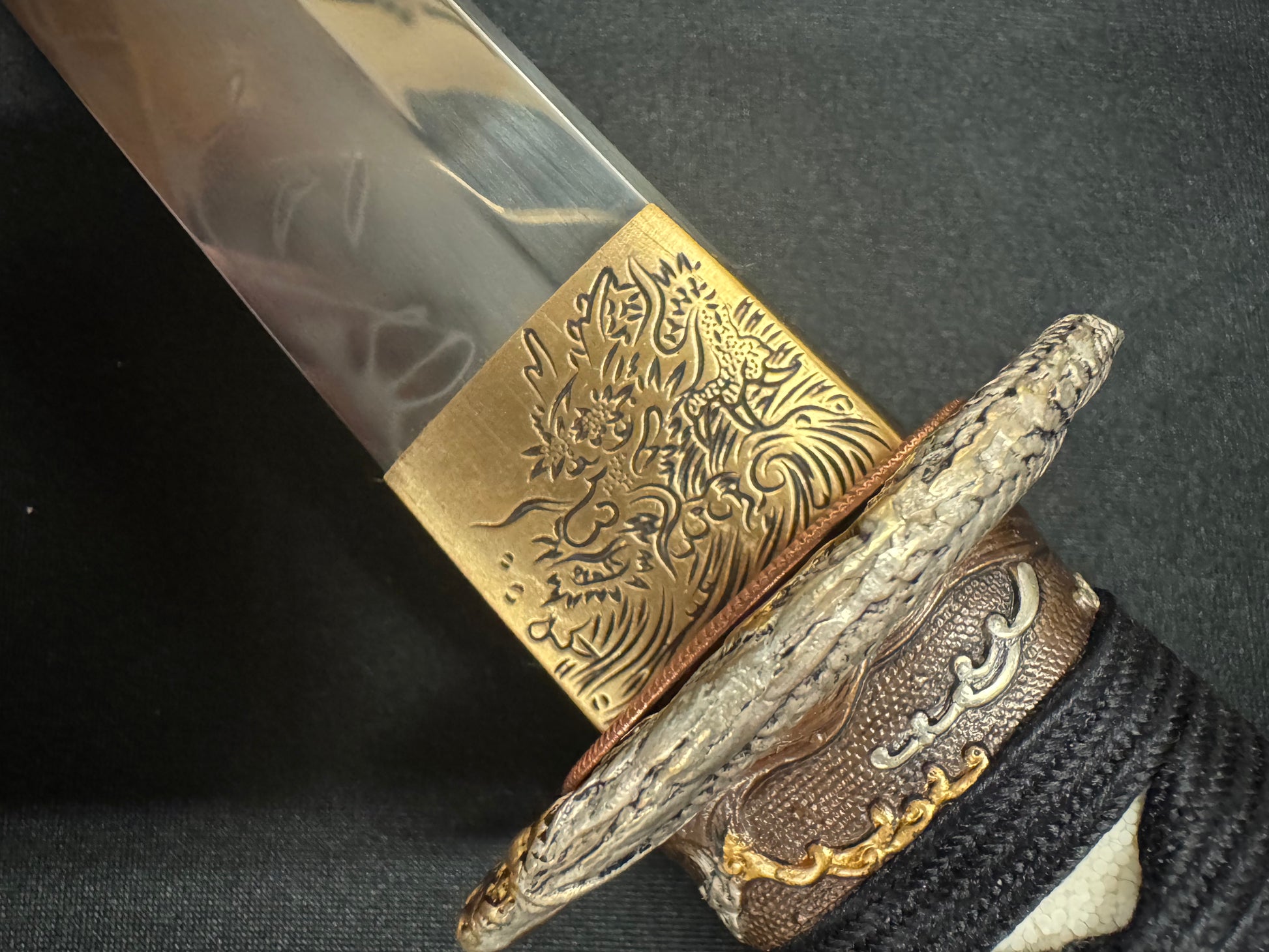 Fittings: Plated brass, dragon theme. Smaller Tsuba.