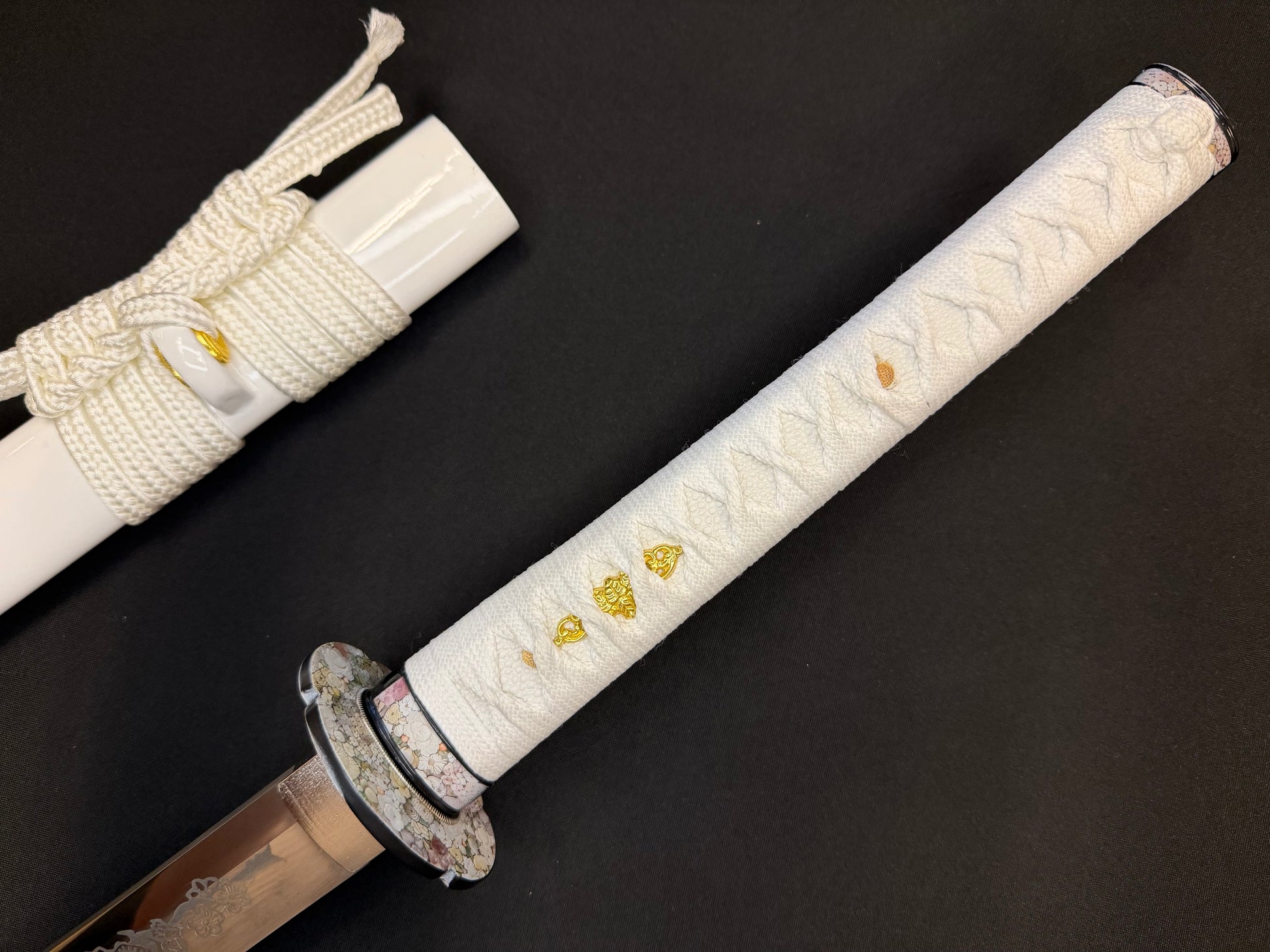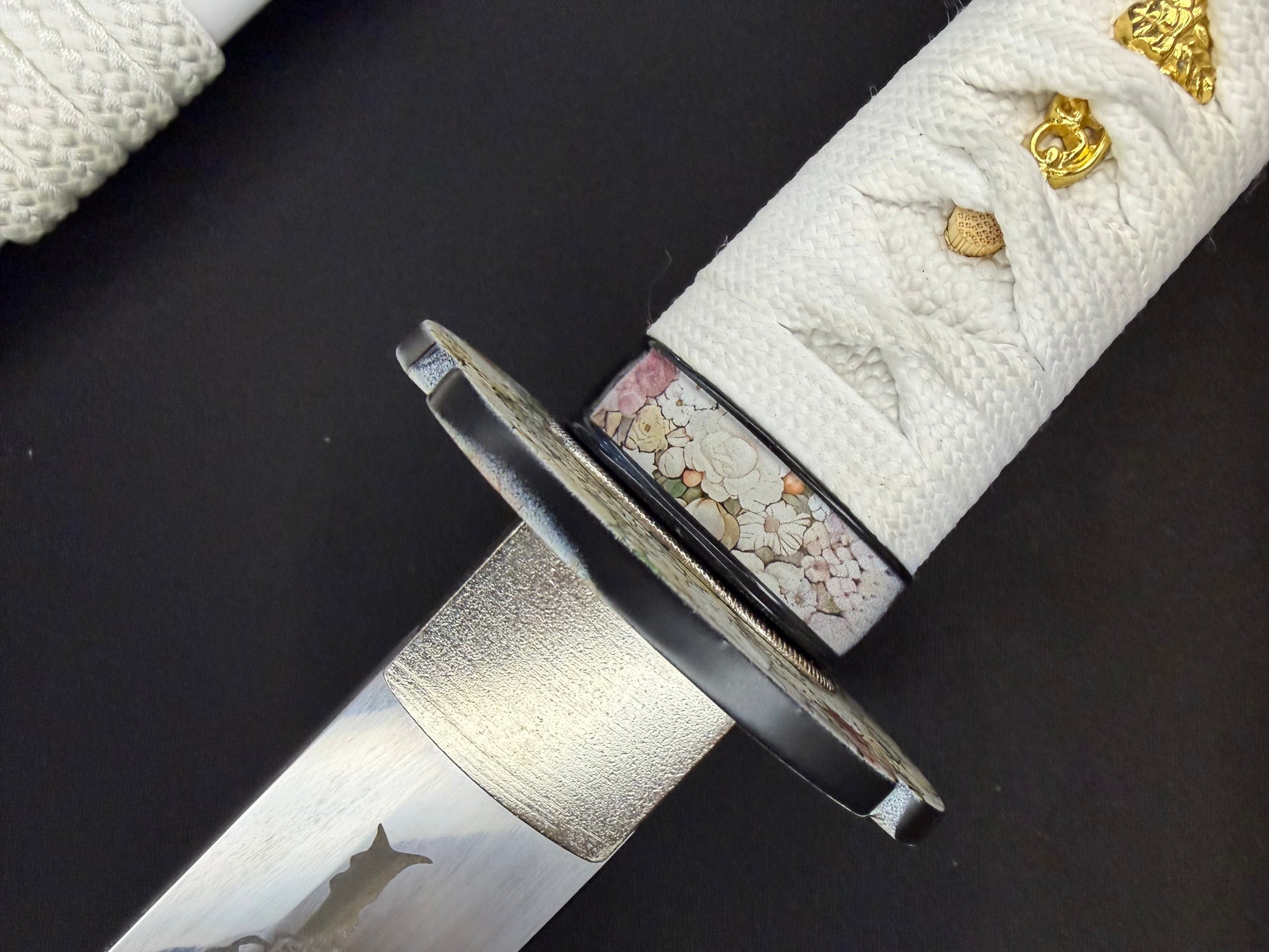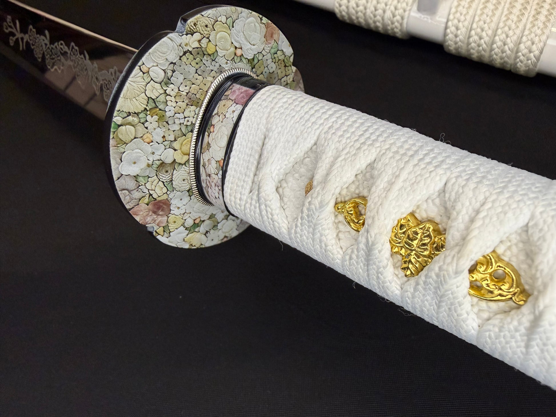 The Snowblood from Phoenix Armory is here! Forged from durable T10 tool steel, this is a practical cutting blade meant for both hard and soft targets. It features full tang construction, with a Bo-hi to remove weight and improve the speed and performance when cutting. The hardwood handle feature imitation white raisin underneath a white cotton wrap. This sword is adorned with a unique furniture design that includes a multicolored flower appliqué, making for a stunningly beautiful yet practical weapon worthy of any collection.