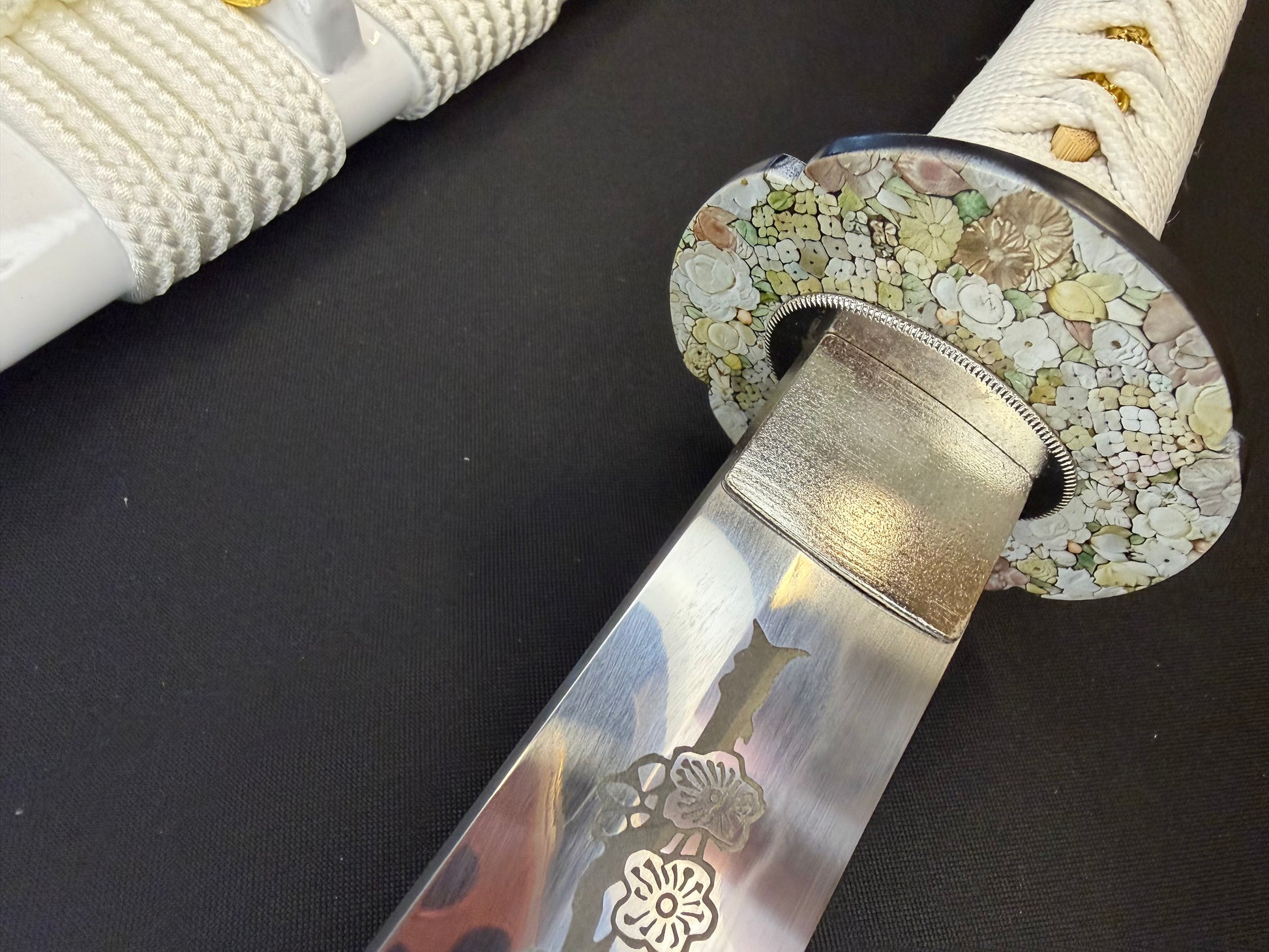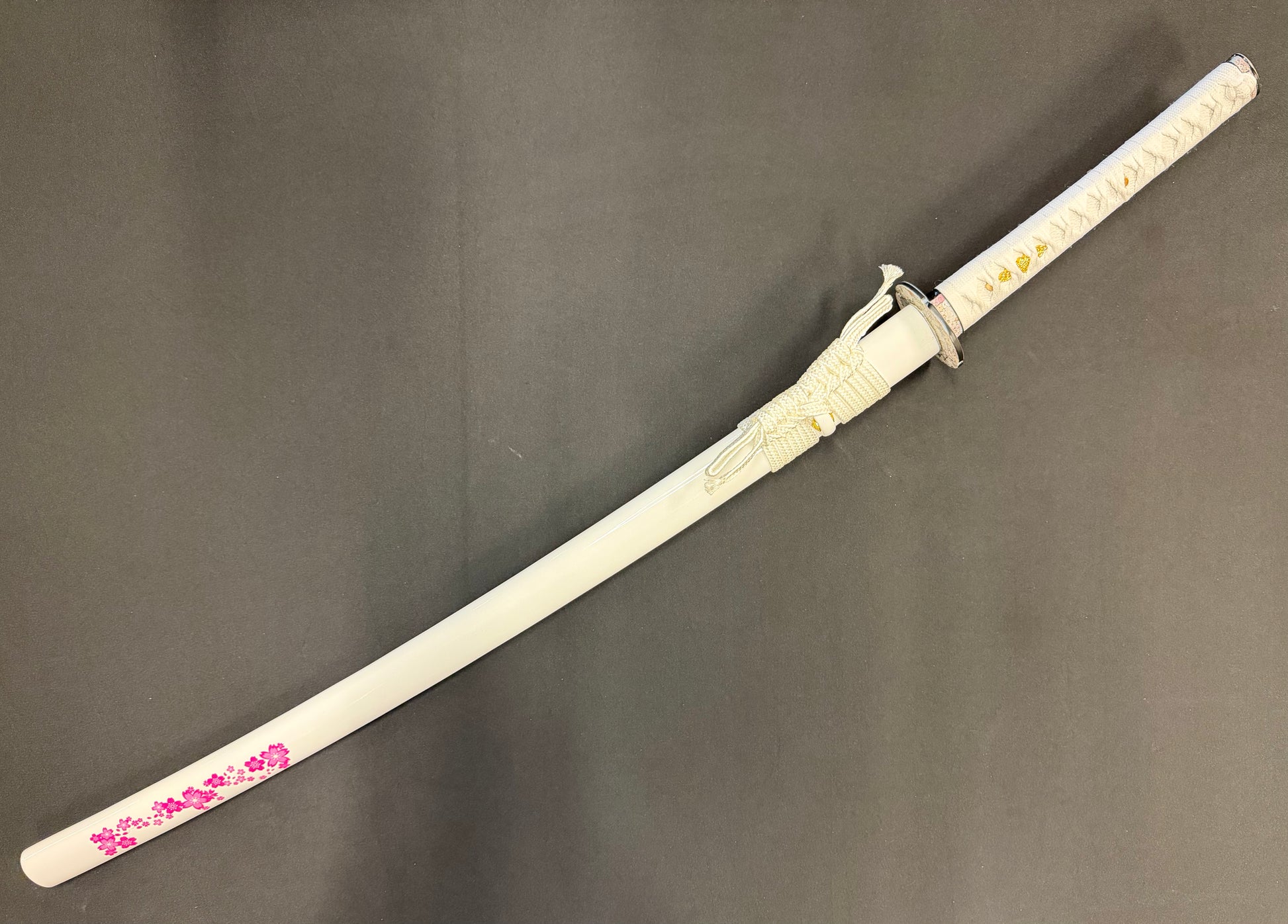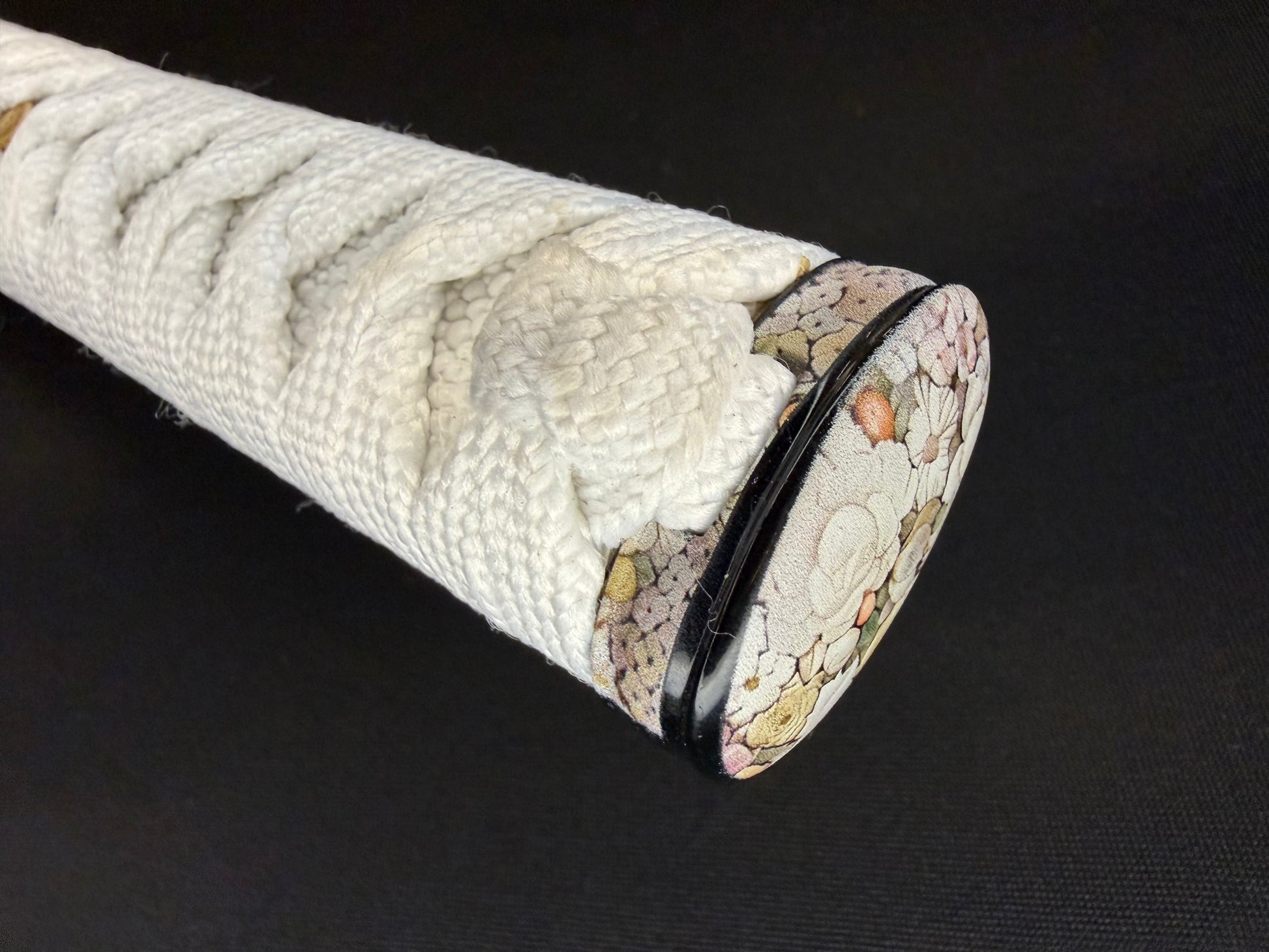 The Snowblood from Phoenix Armory is here! Forged from durable T10 tool steel, this is a practical cutting blade meant for both hard and soft targets. It features full tang construction, with a Bo-hi to remove weight and improve the speed and performance when cutting. The hardwood handle feature imitation white raisin underneath a white cotton wrap. This sword is adorned with a unique furniture design that includes a multicolored flower appliqué, making for a stunningly beautiful yet practical weapon worthy of any collection.