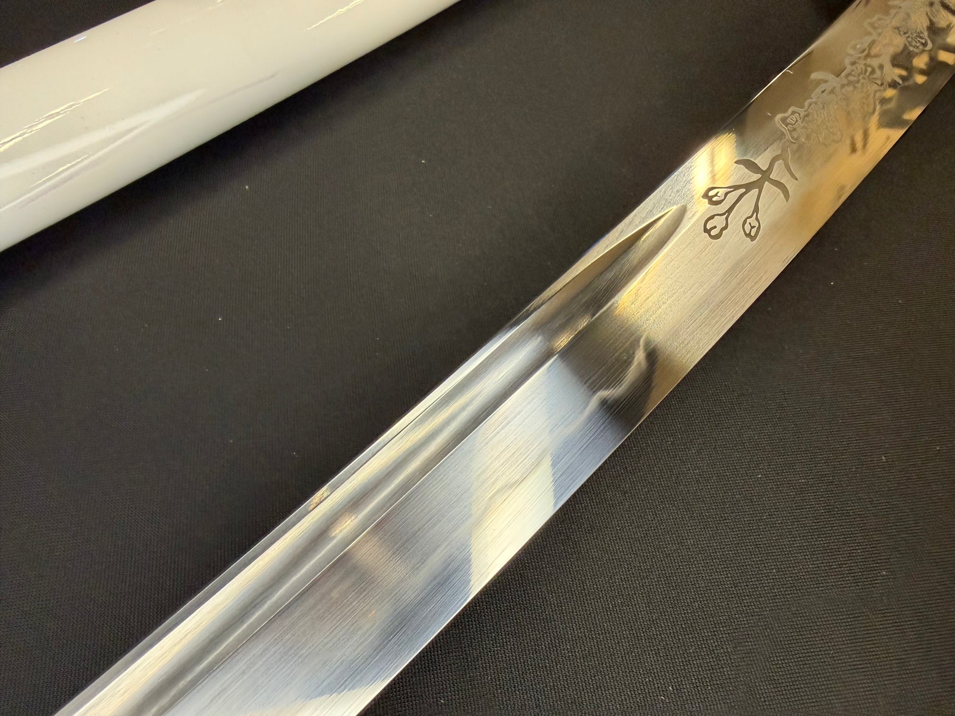 Blade: Forged T10 with natural active Hamon, full tang, early-terminating Bo-hi with etched design on blade