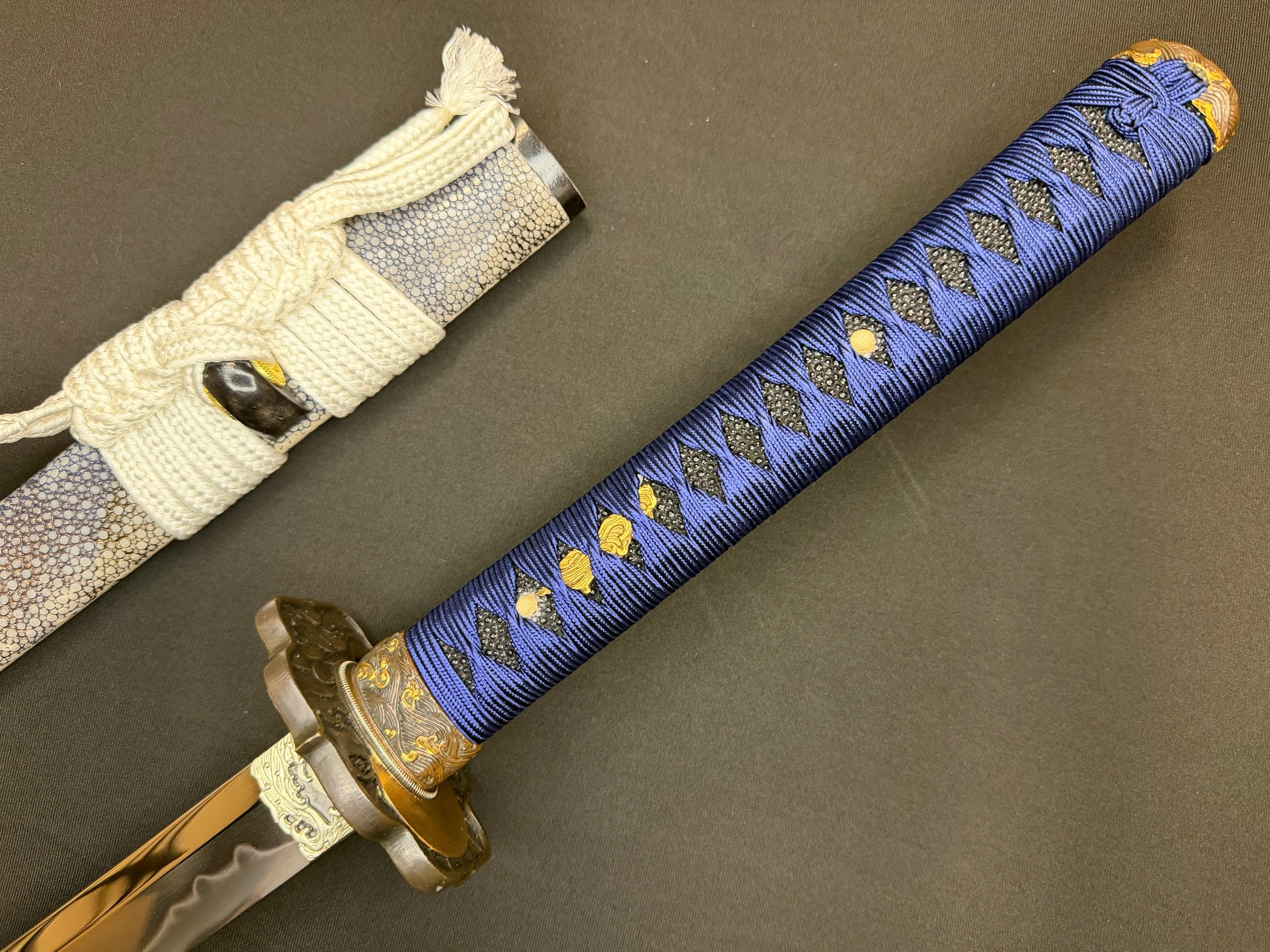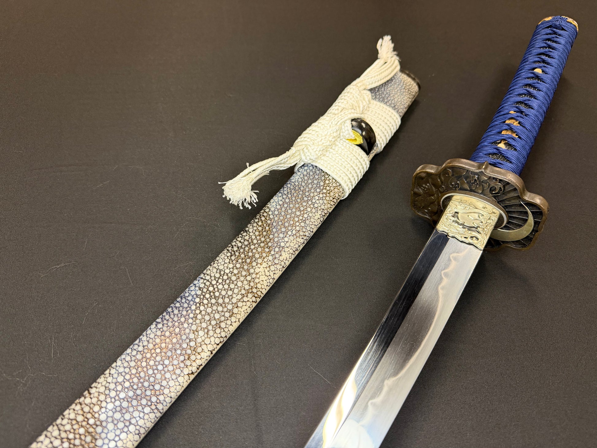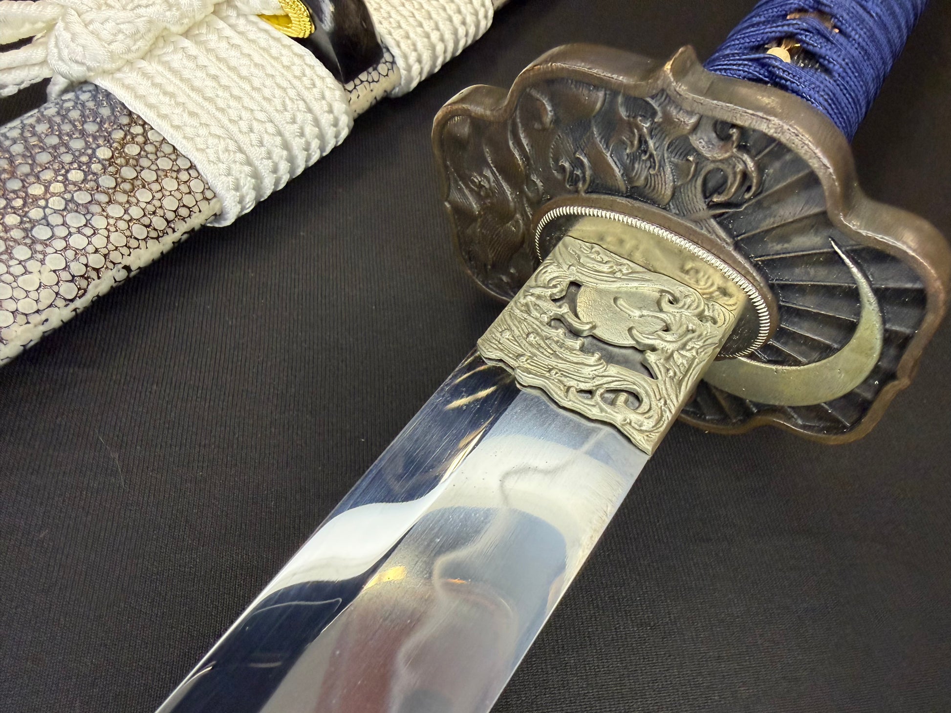 Forged by the master smiths at Phoenix Armory, The Sun and Moon is a venerable katana crafted for collectors who appreciate both symbolism and performance. The blade is forged from resilient T10 tool steel, differentially hardened to reveal a unique natural hamon temper line that speaks to traditional craftsmanship. A blue silk–wrapped handle rests over natural black ray skin, complemented by plated brass furniture and an iconic sun-and-moon themed tsuba. The scabbard is wrapped in natural ray skin, intentionally coarse and unhandled, with buffalo horn fittings to complete the piece. Razor sharp and impeccably balanced, this katana is a striking addition to any serious collection.
