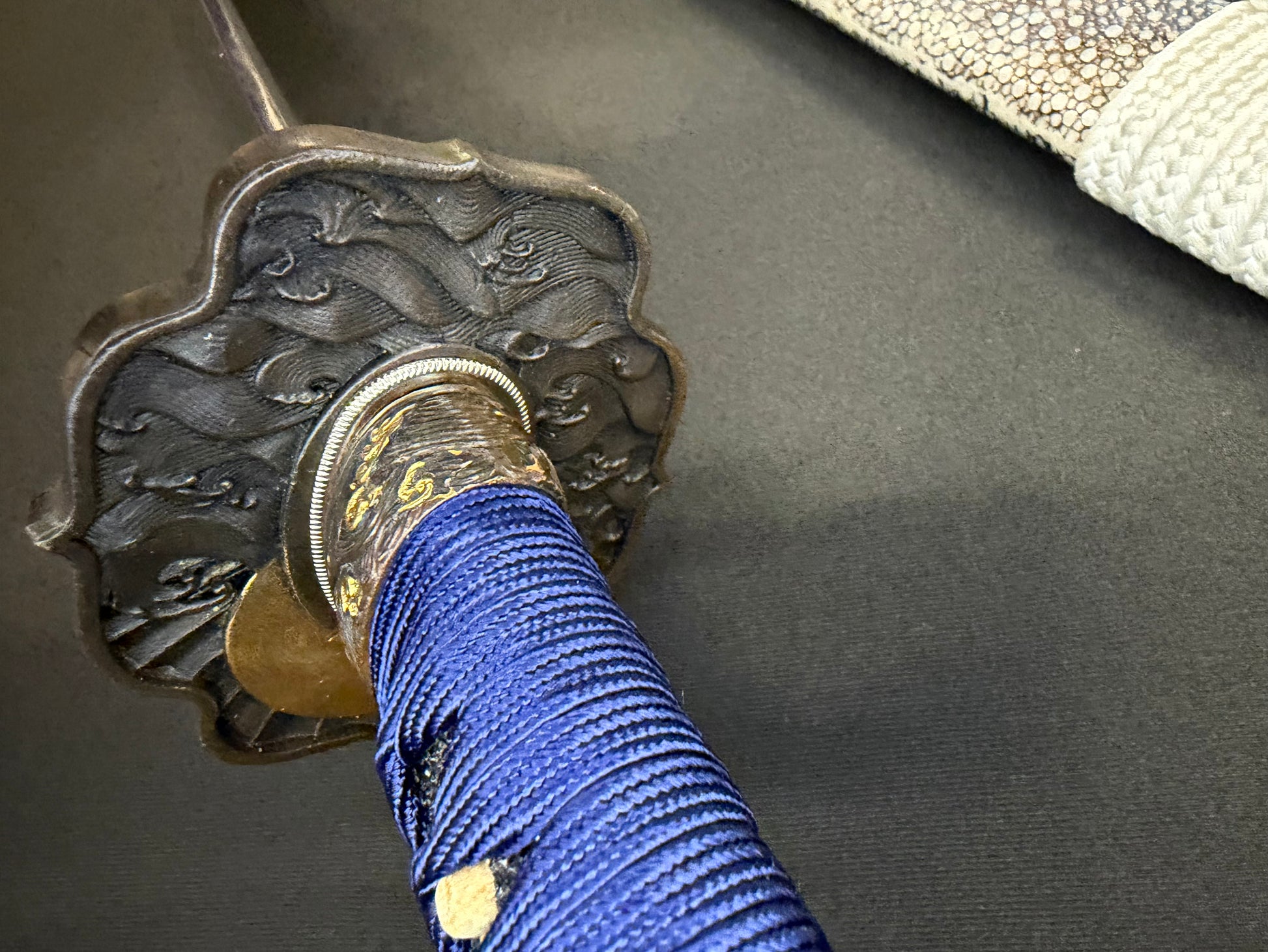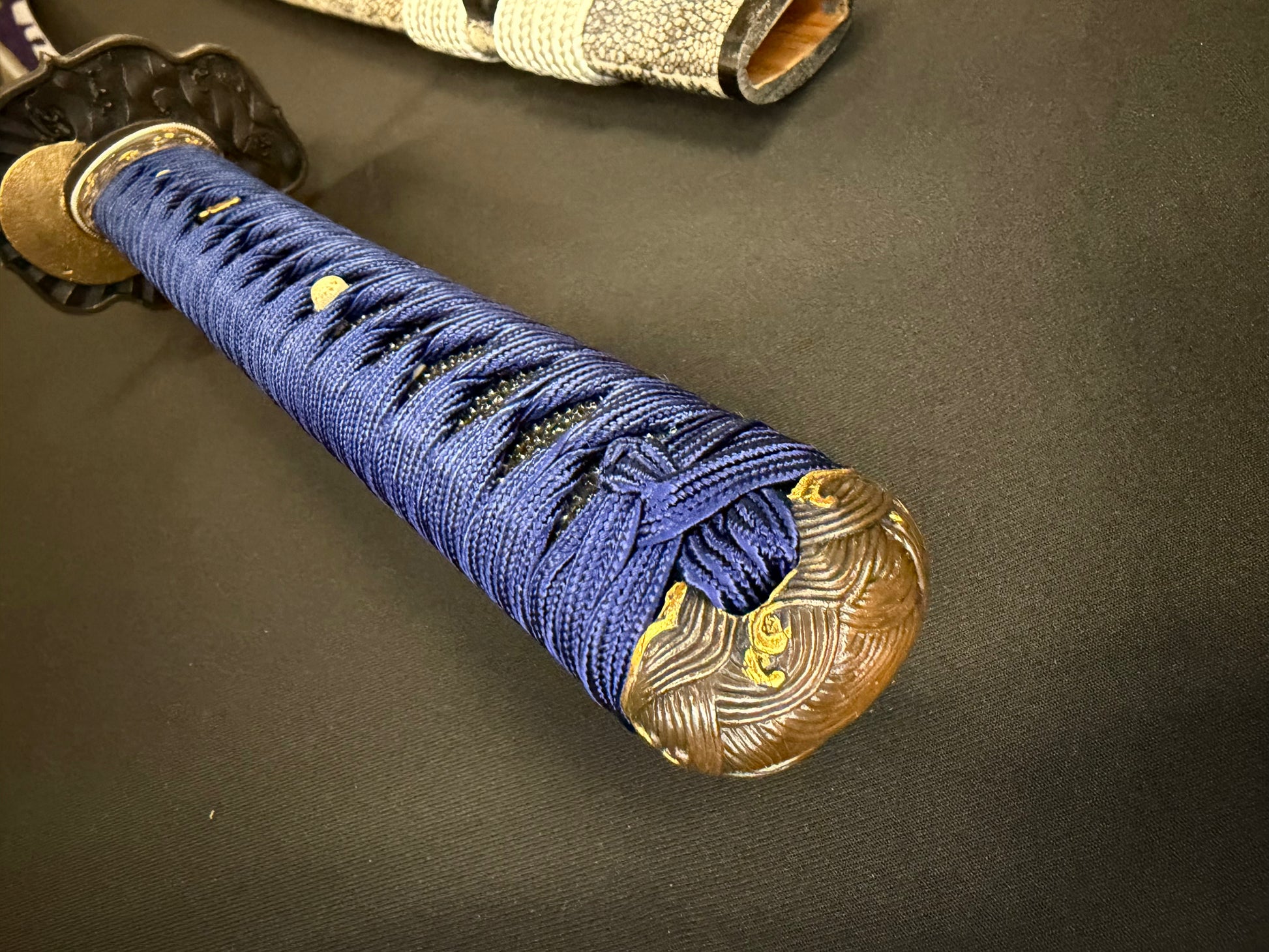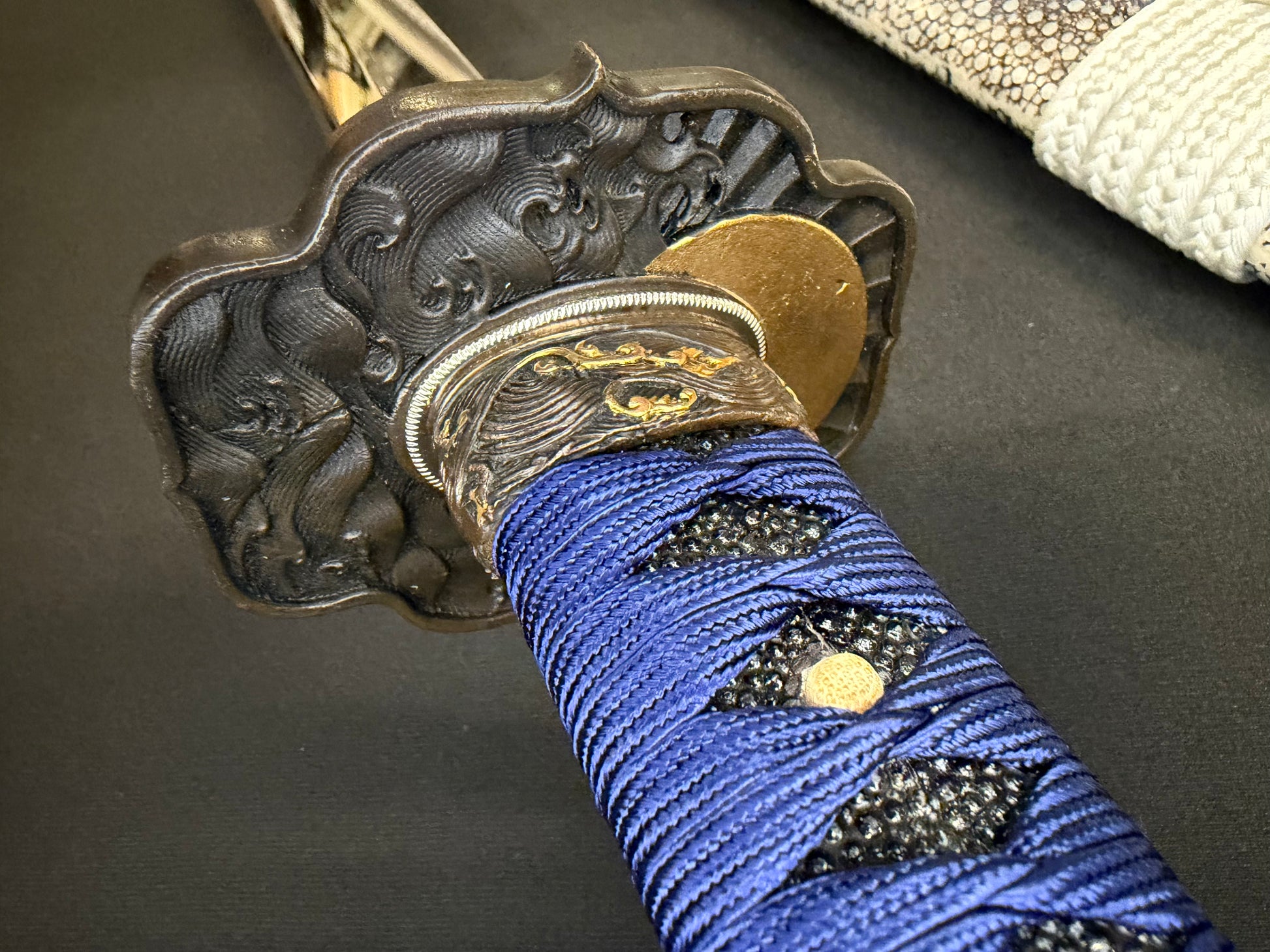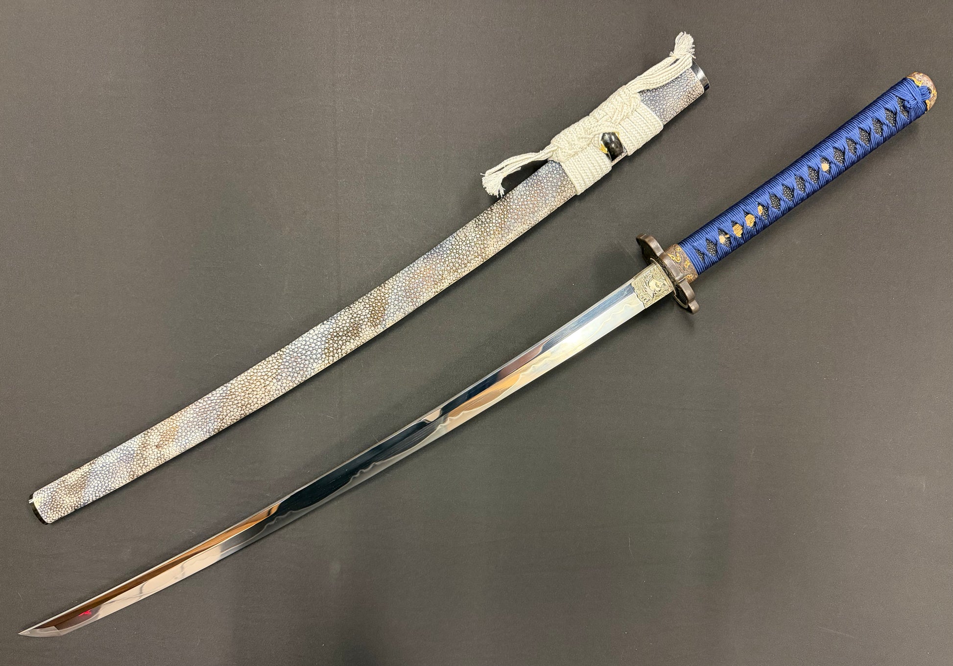Forged by the master smiths at Phoenix Armory, The Sun and Moon is a venerable katana crafted for collectors who appreciate both symbolism and performance. The blade is forged from resilient T10 tool steel, differentially hardened to reveal a unique natural hamon temper line that speaks to traditional craftsmanship. A blue silk–wrapped handle rests over natural black ray skin, complemented by plated brass furniture and an iconic sun-and-moon themed tsuba. The scabbard is wrapped in natural ray skin, intentionally coarse and unhandled, with buffalo horn fittings to complete the piece. Razor sharp and impeccably balanced, this katana is a striking addition to any serious collection.
