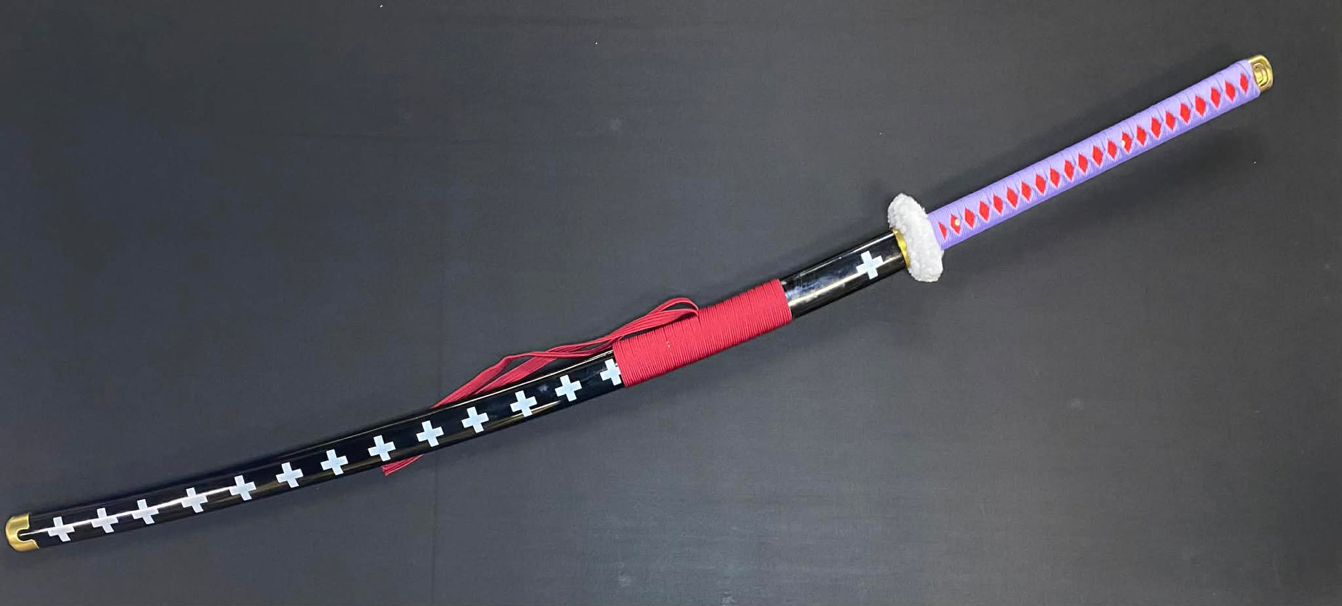 The Kikoku (trans. "Demon Wail") is a cursed sword that Law uses as an "injection needle," to cut or pierce from a distance, and with his full power, can cut an entire mountain. The Kikoku is a long katana referred to as an Odachi or Nodachi, has a white fur guard along with a black sheath that has white crosses and a piece of red rope tied to the sheath.