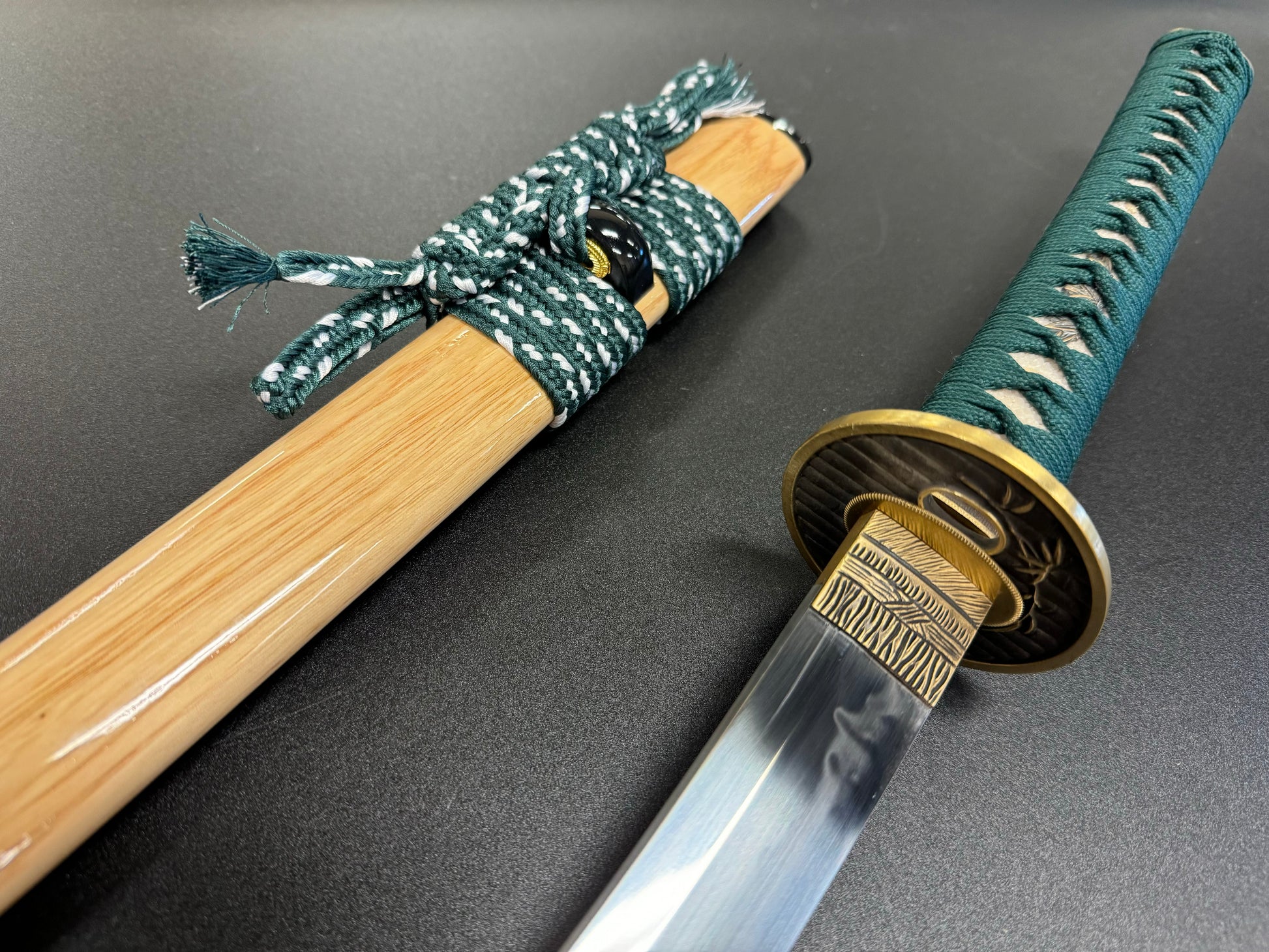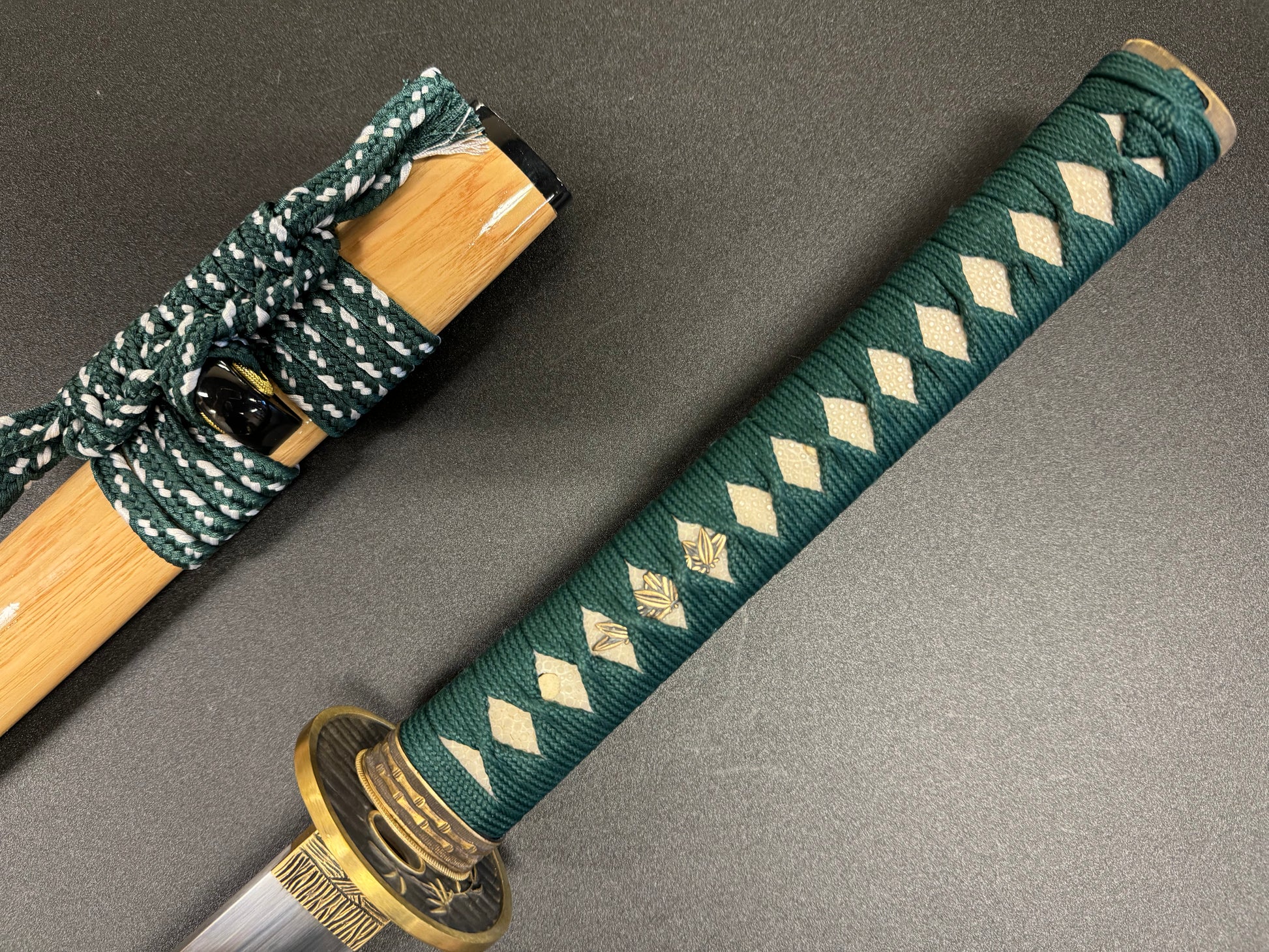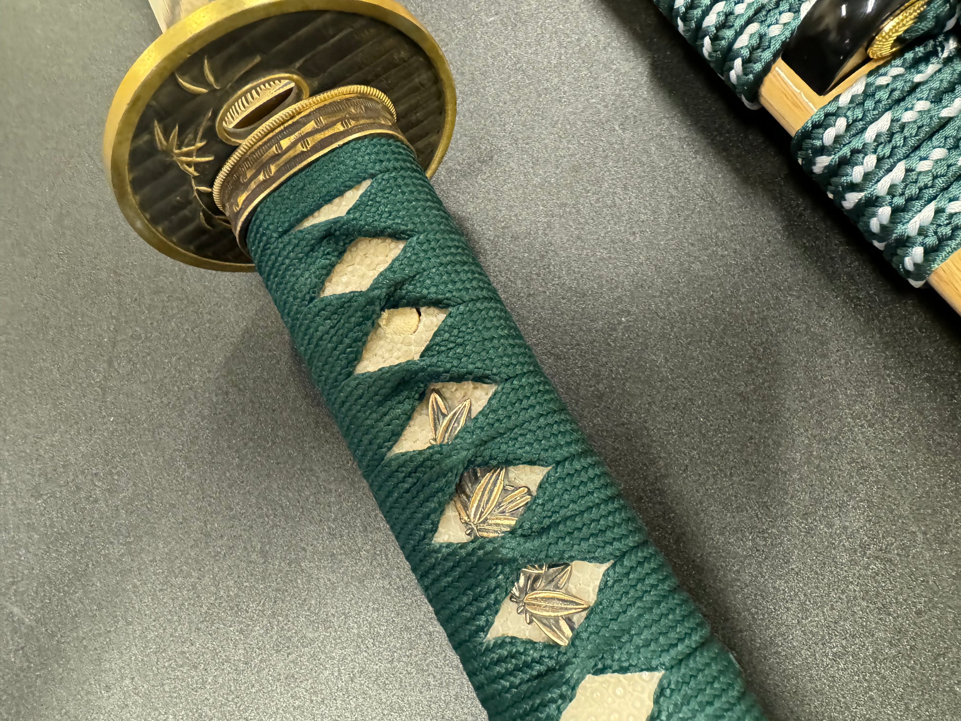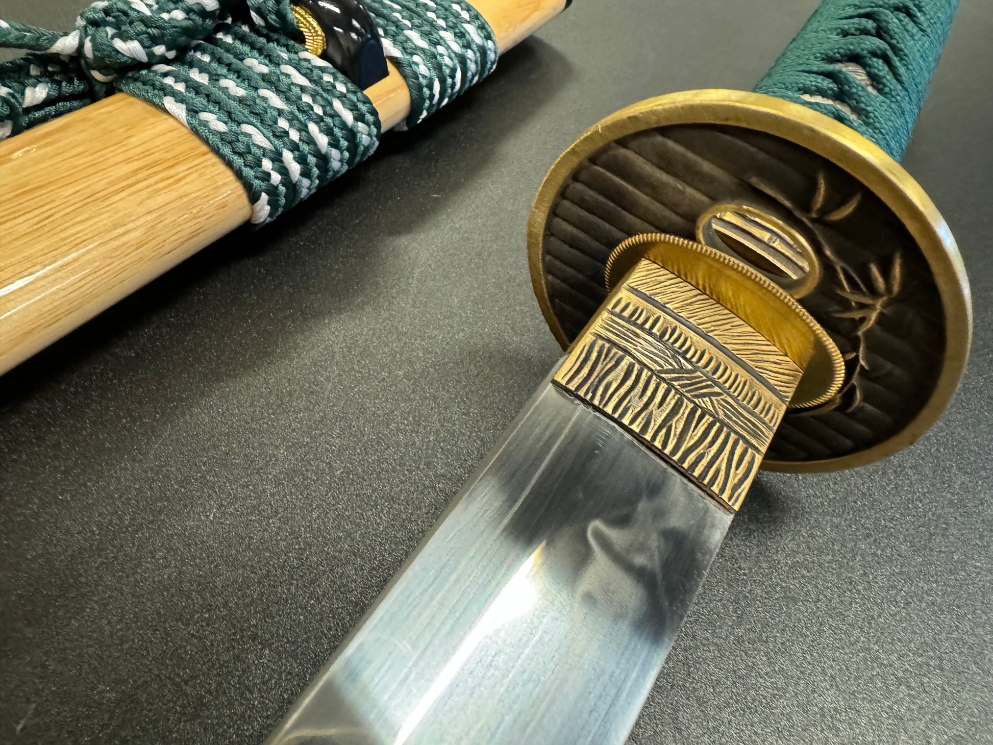 T10 steel with natural Hamon, brass furniture featuring a bamboo theme.