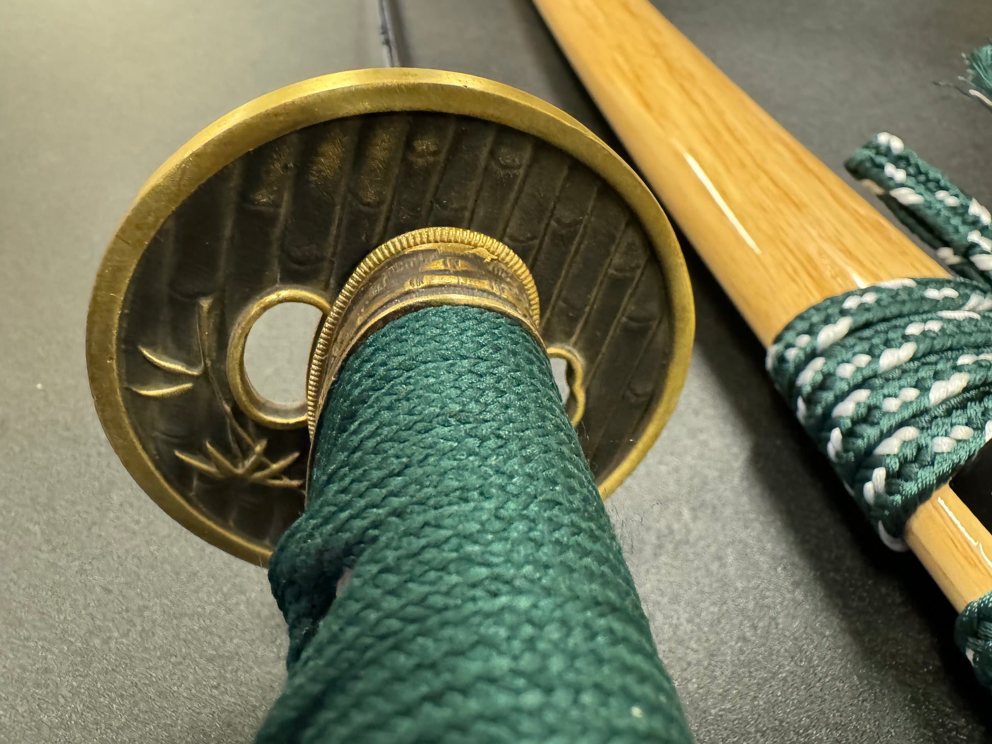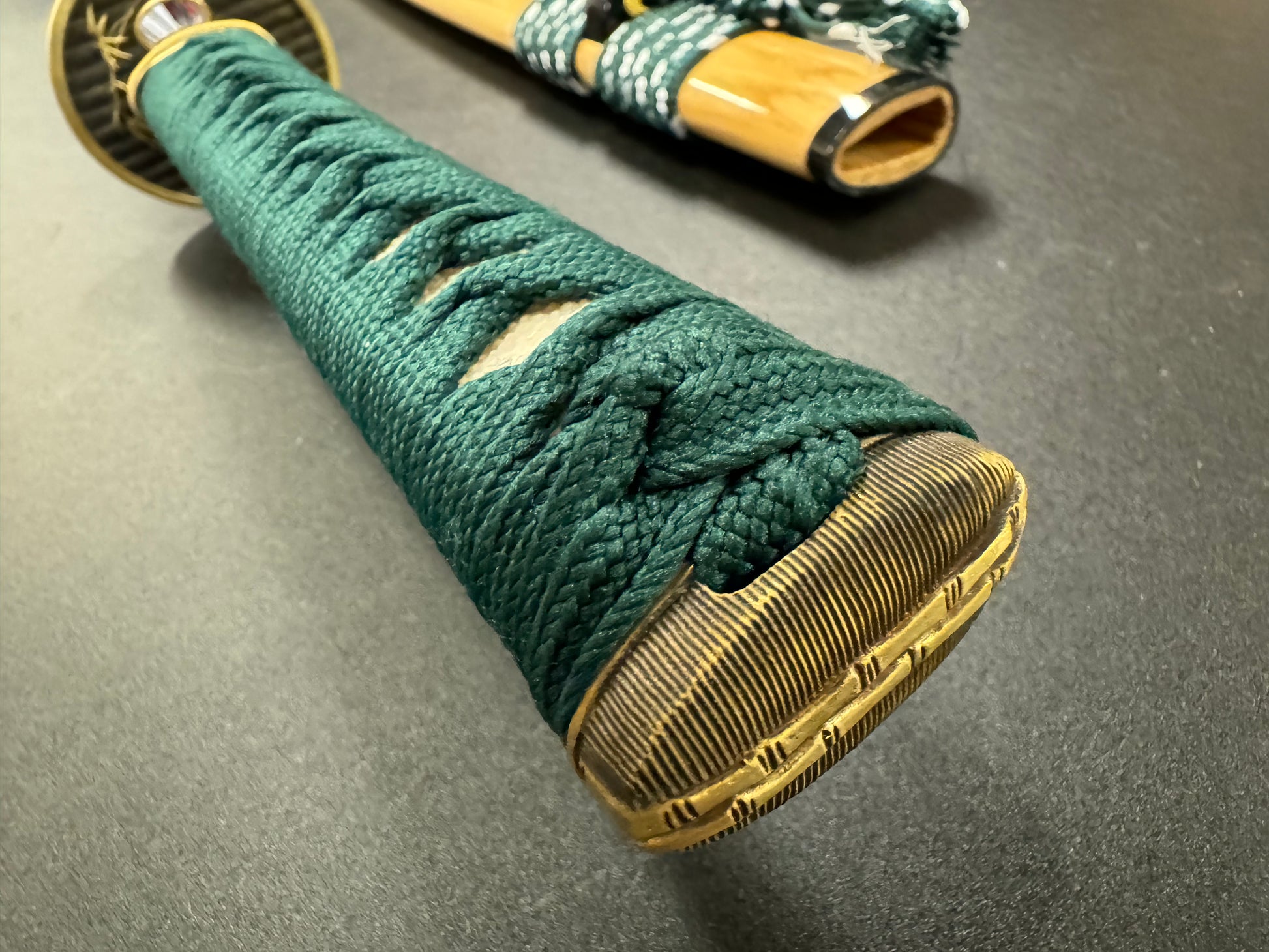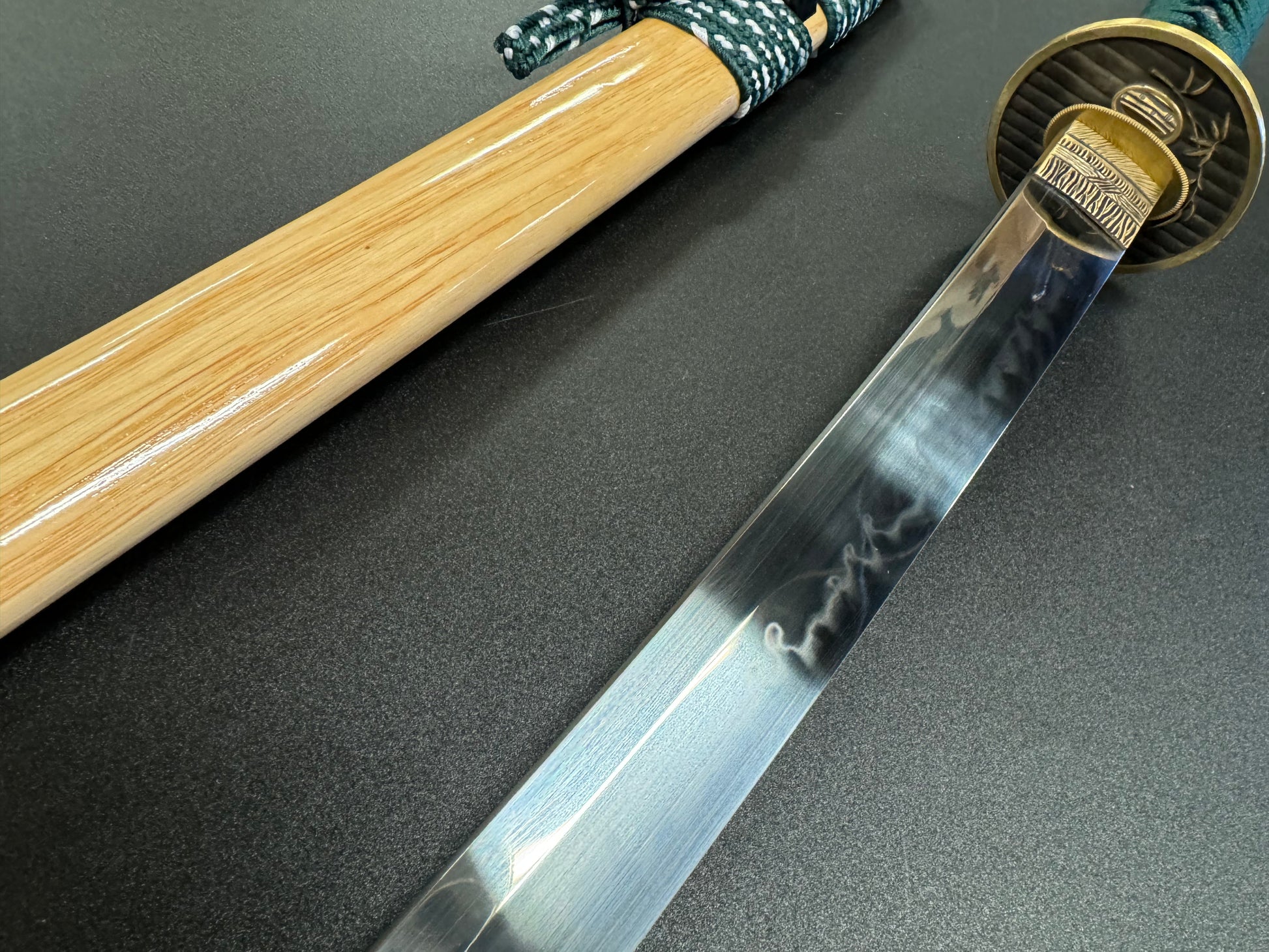 T10 steel with natural Hamon, brass furniture featuring a bamboo theme.