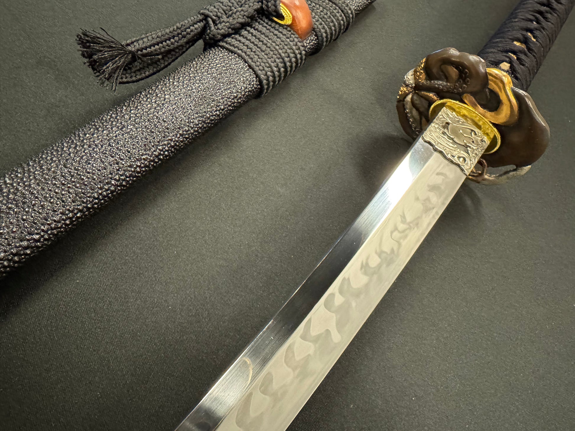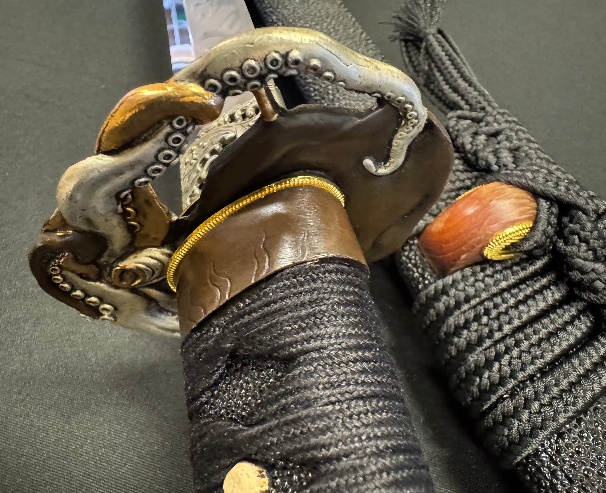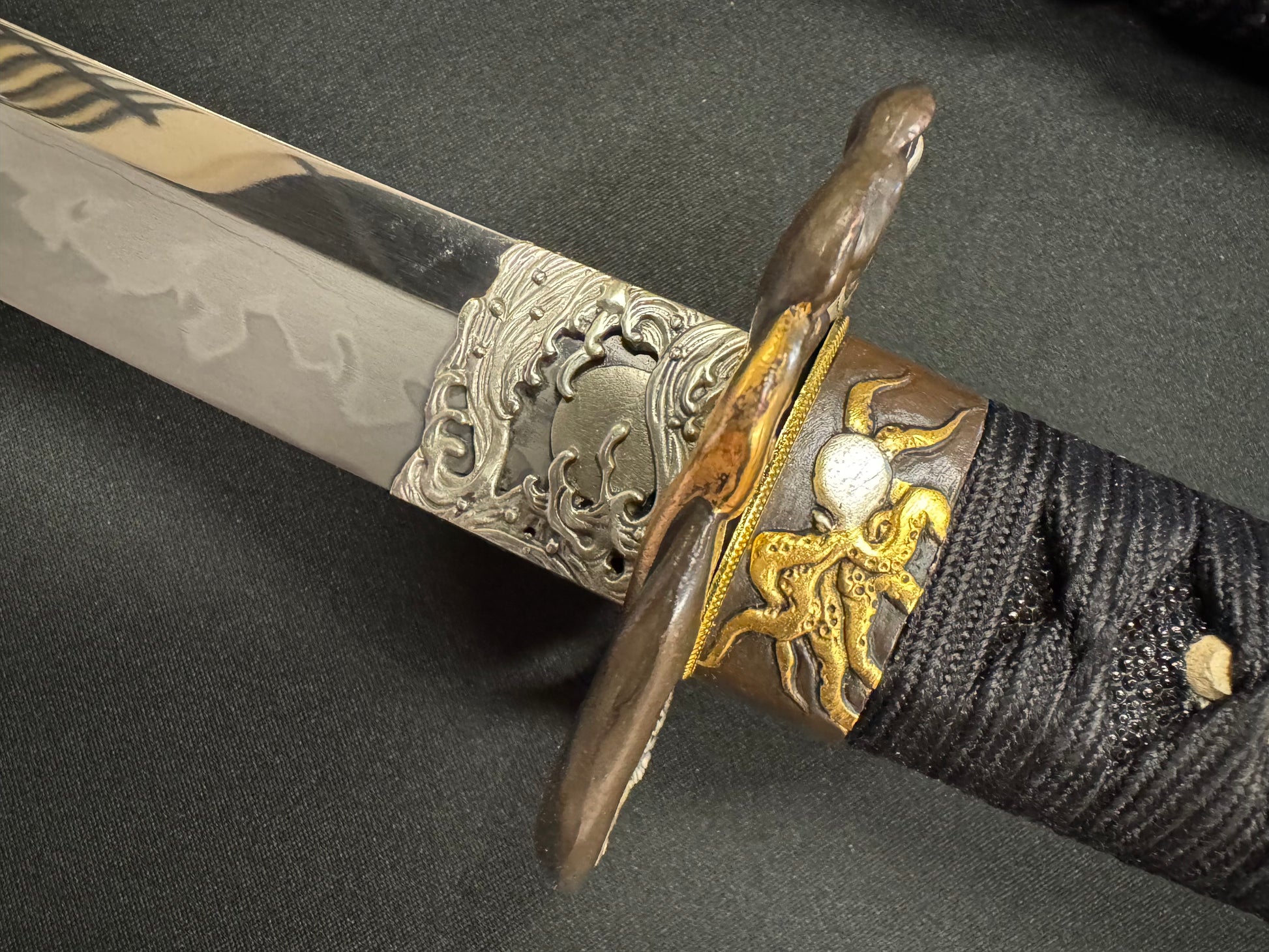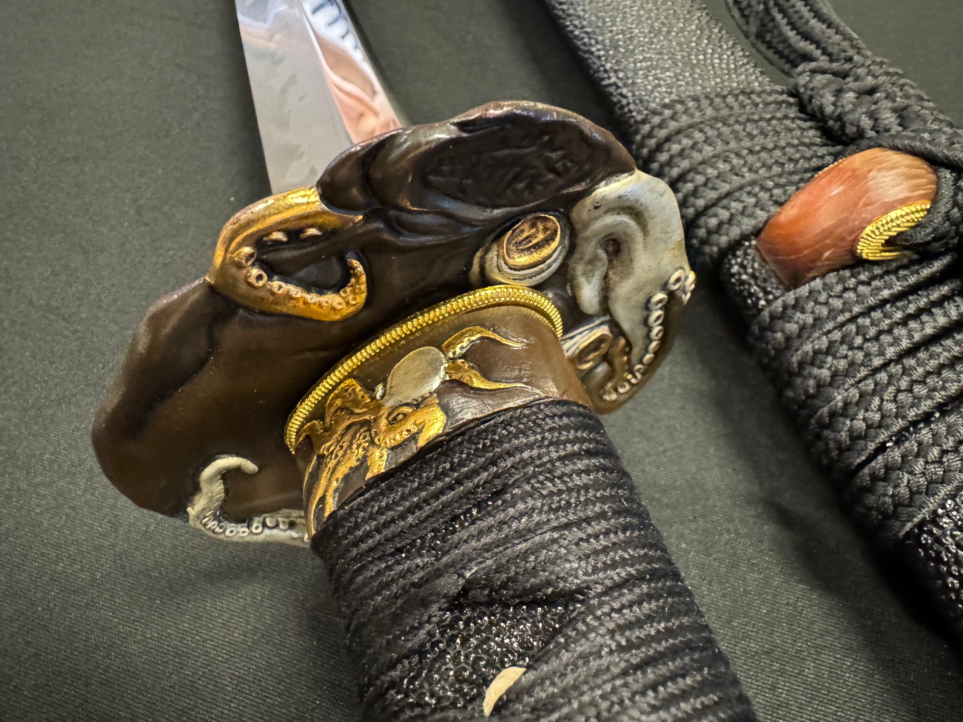 The Leviathan has risen! Forged from durable T10 with a gorgeous and prominent Hamon, this sword is as much a marvel to admire as it is a functional cutting blade. It features a tightly wrapped Japanese black silk Tsuka Ito with authentic black ray skin and stunning brass multicolored furniture. The Tsuba is the highlight of this piece, with a menacing octopus theme. The Saya is fully wrapped in black ray skin, adding strength and durability as well as aesthetic.