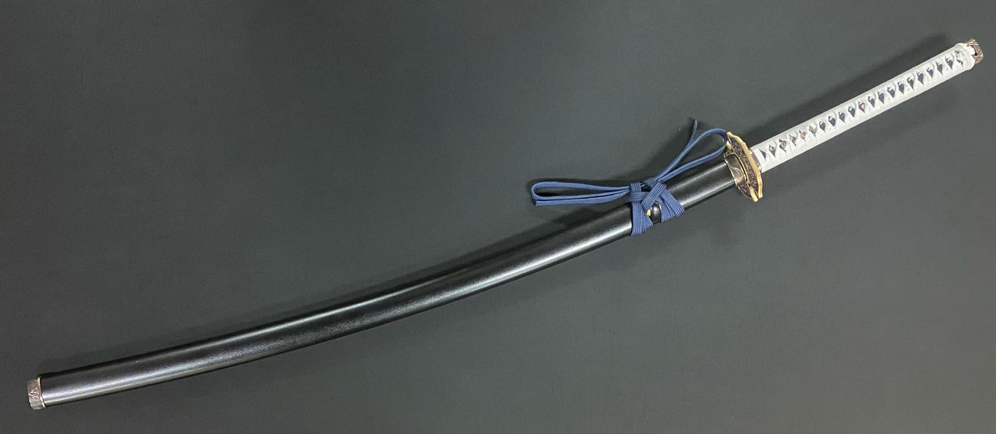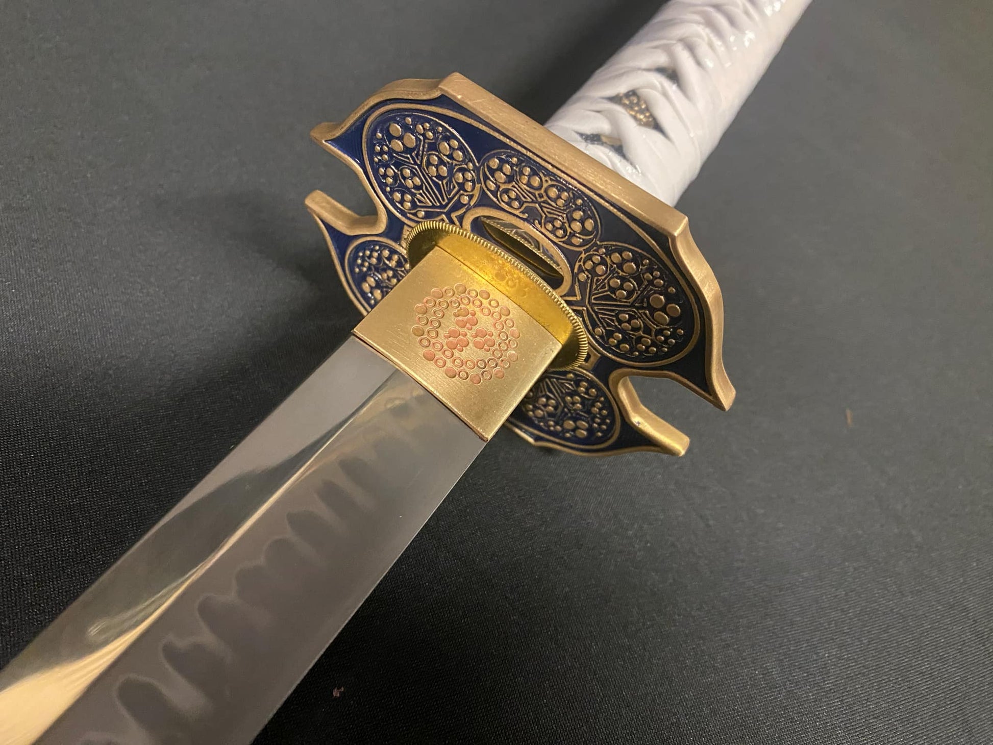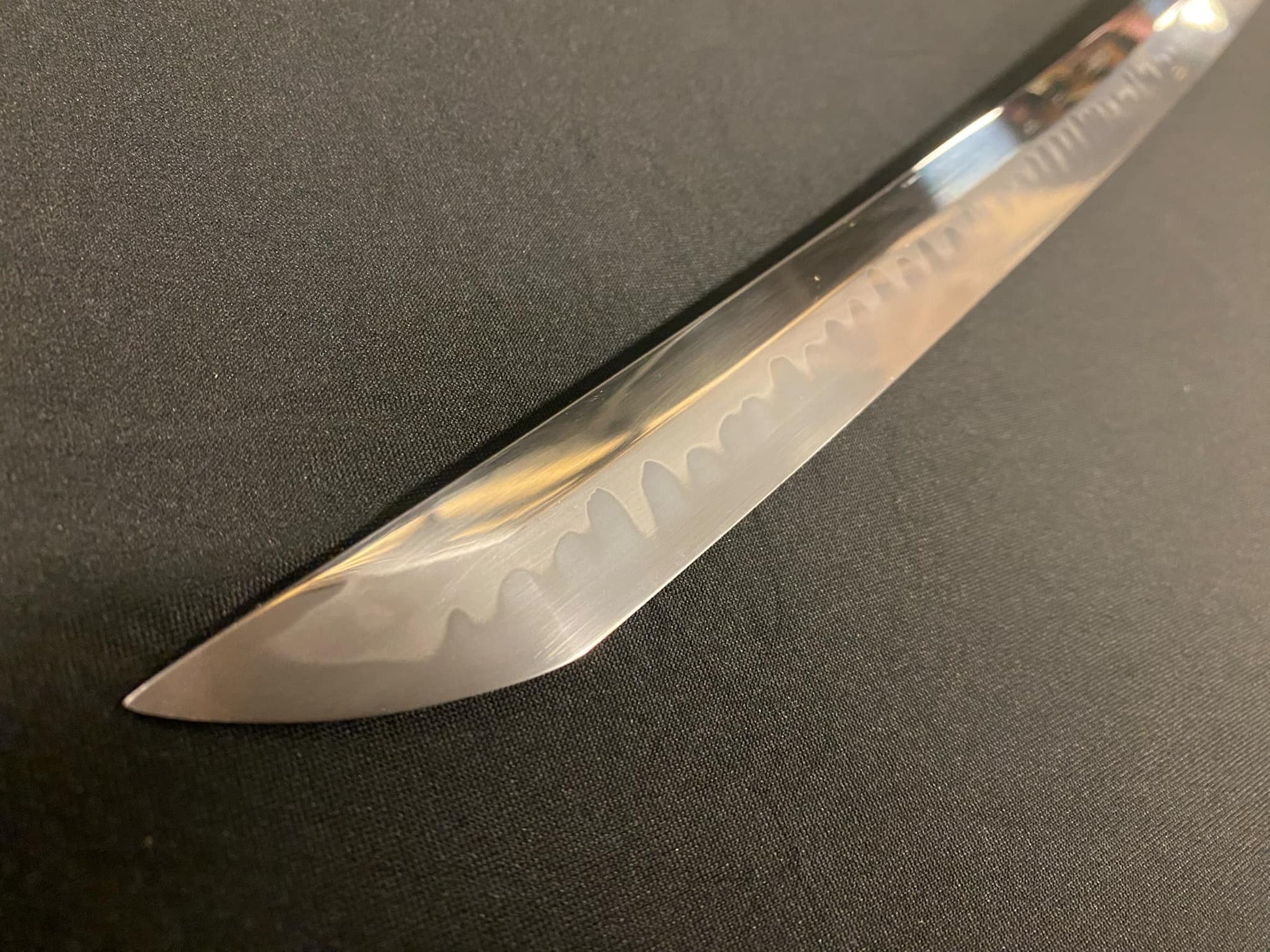 This odachi version is made of T10 steel, clay tempered to form a natural hamon. The parts are brass.