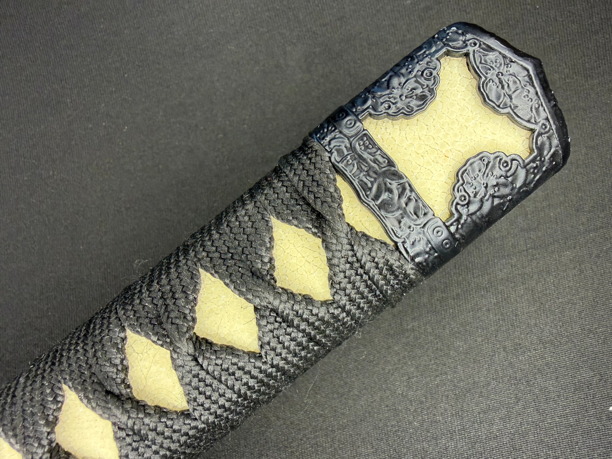 Handle: Hardwood with authentic white ray skin, black synthetic silk Tsuka Ito, Kabutogane