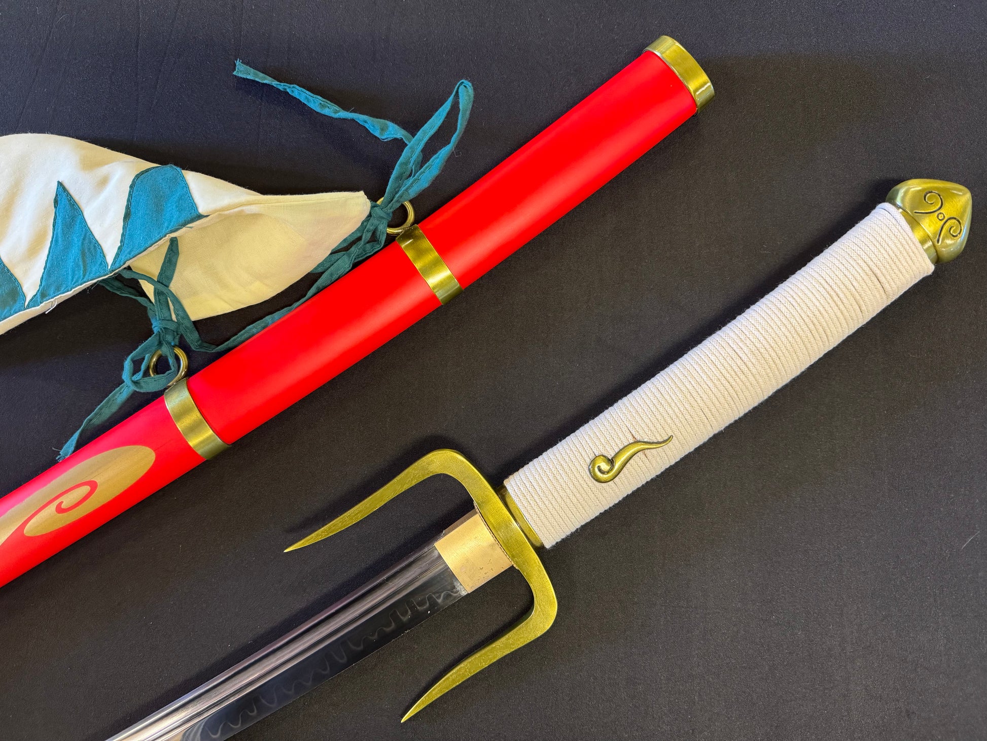 From this hit anime series Samurai Champloo comes this exquisite replica of Mugen's famous Typhoon Swell Katana. Forged by the master smiths at Phoenix Arms, this is a must have for any collector of enthusiast of Japanese weaponry and culture. This is a fully functioning full tang sword, forged from T10 tool steel and clay-tempered in the traditional manner, revealing the authentic Hamon temper line and polished to a mirror-like finish. The hardwood handle is wrapped in cord with brass fittings, completing the look and feel of the piece.