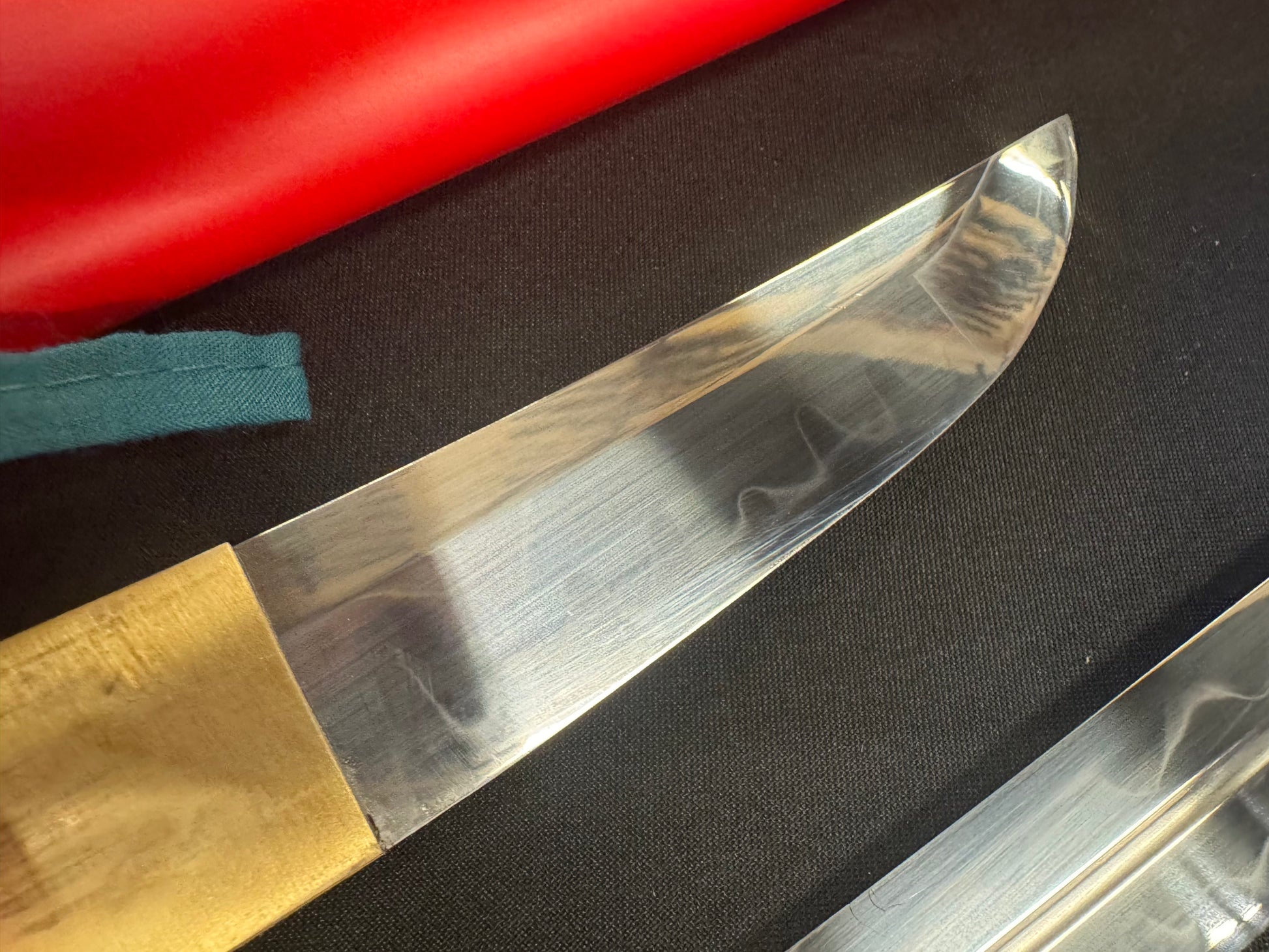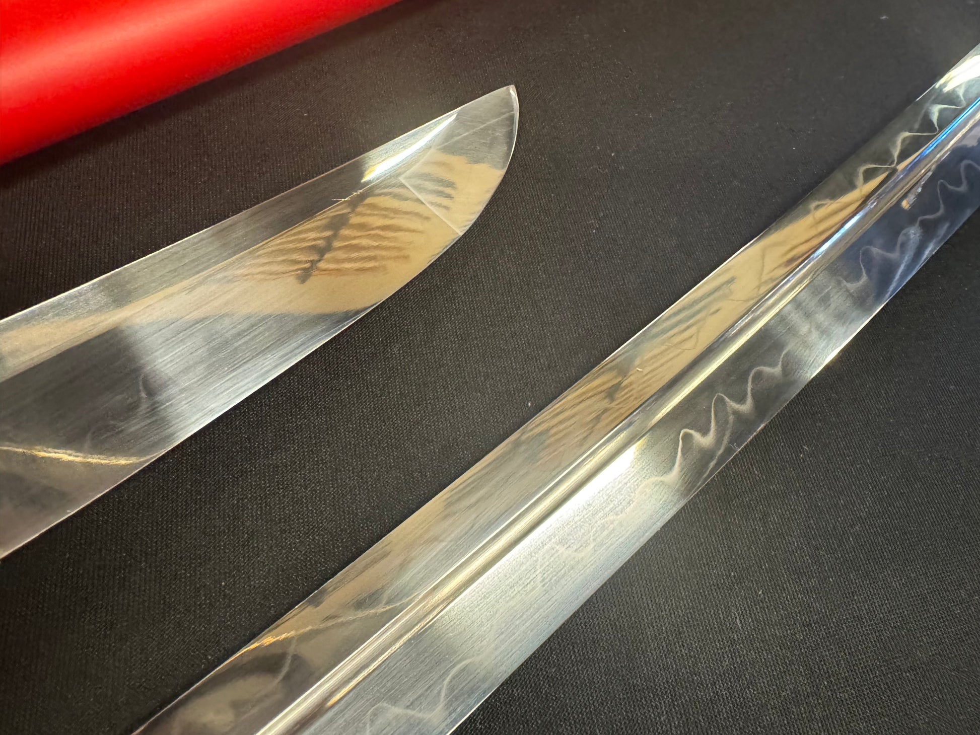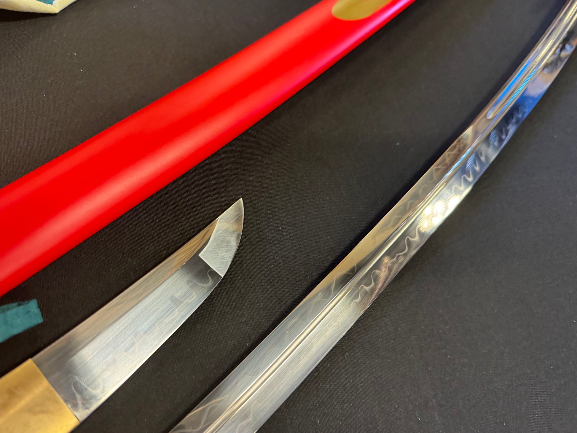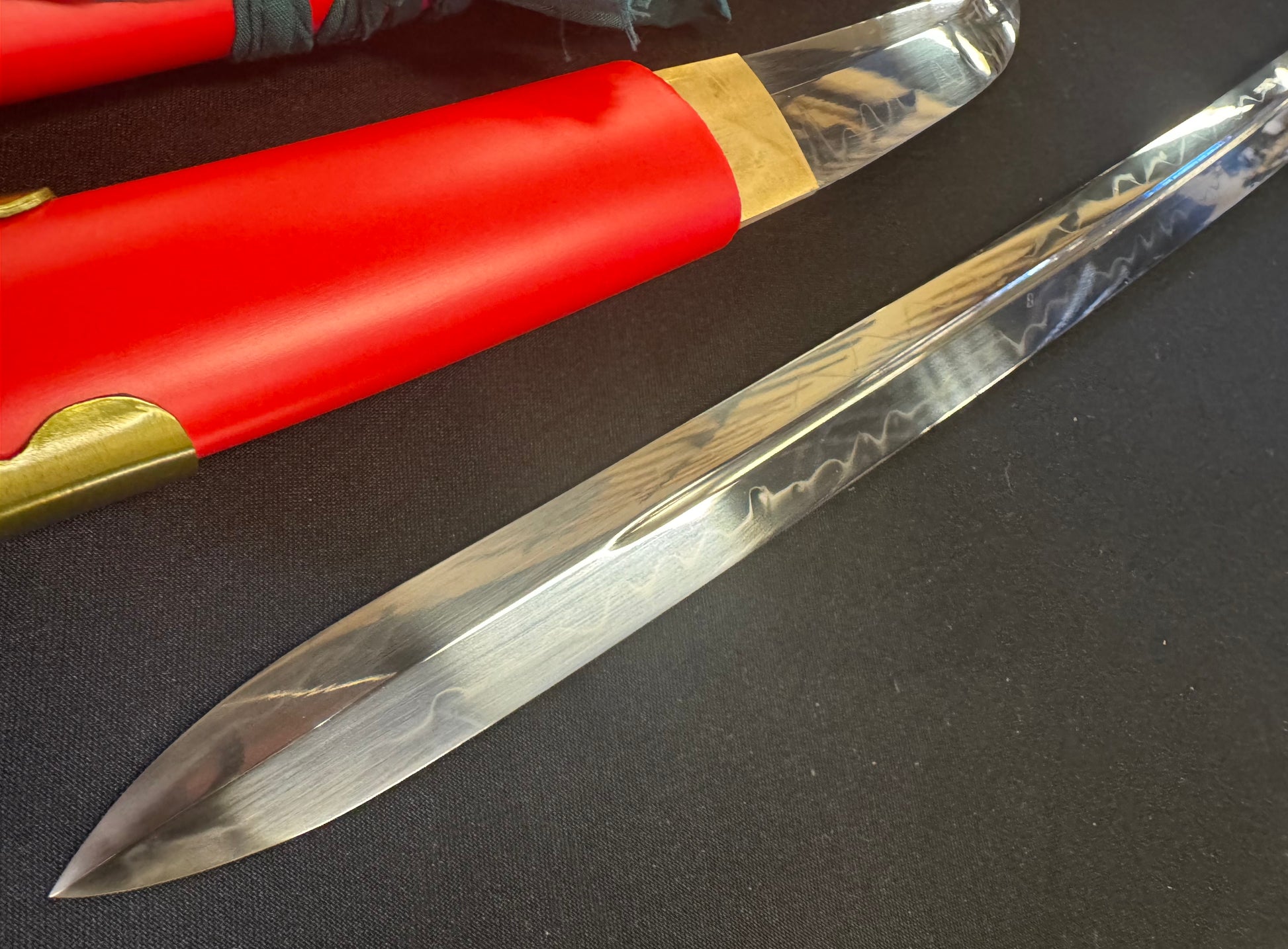 The sword comes complete with a painted hardwood Saya with brass fittings and includes the shoulder sling. The hidden dagger in the bottom of the Saya is also clay-tempered and forged from T10 tool steel.
