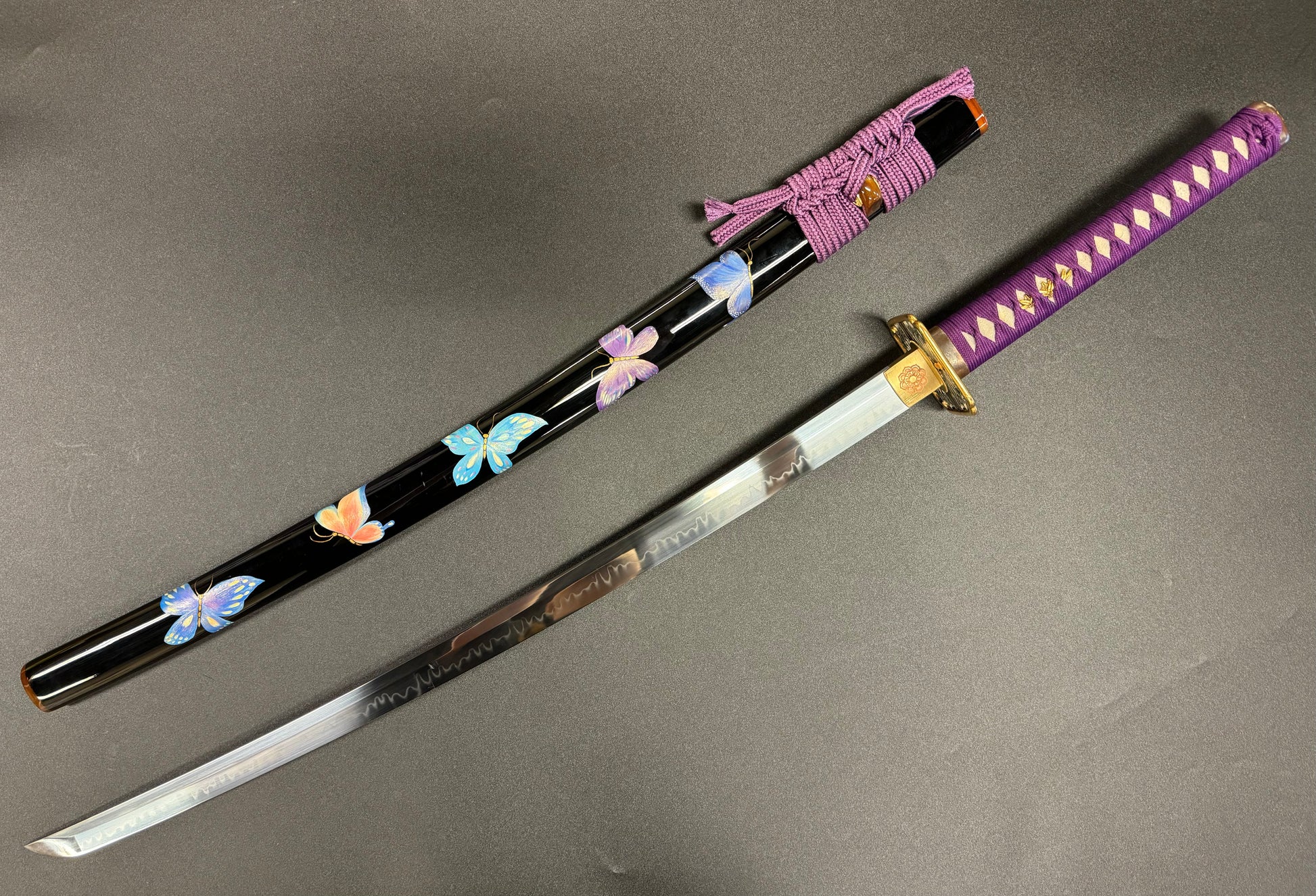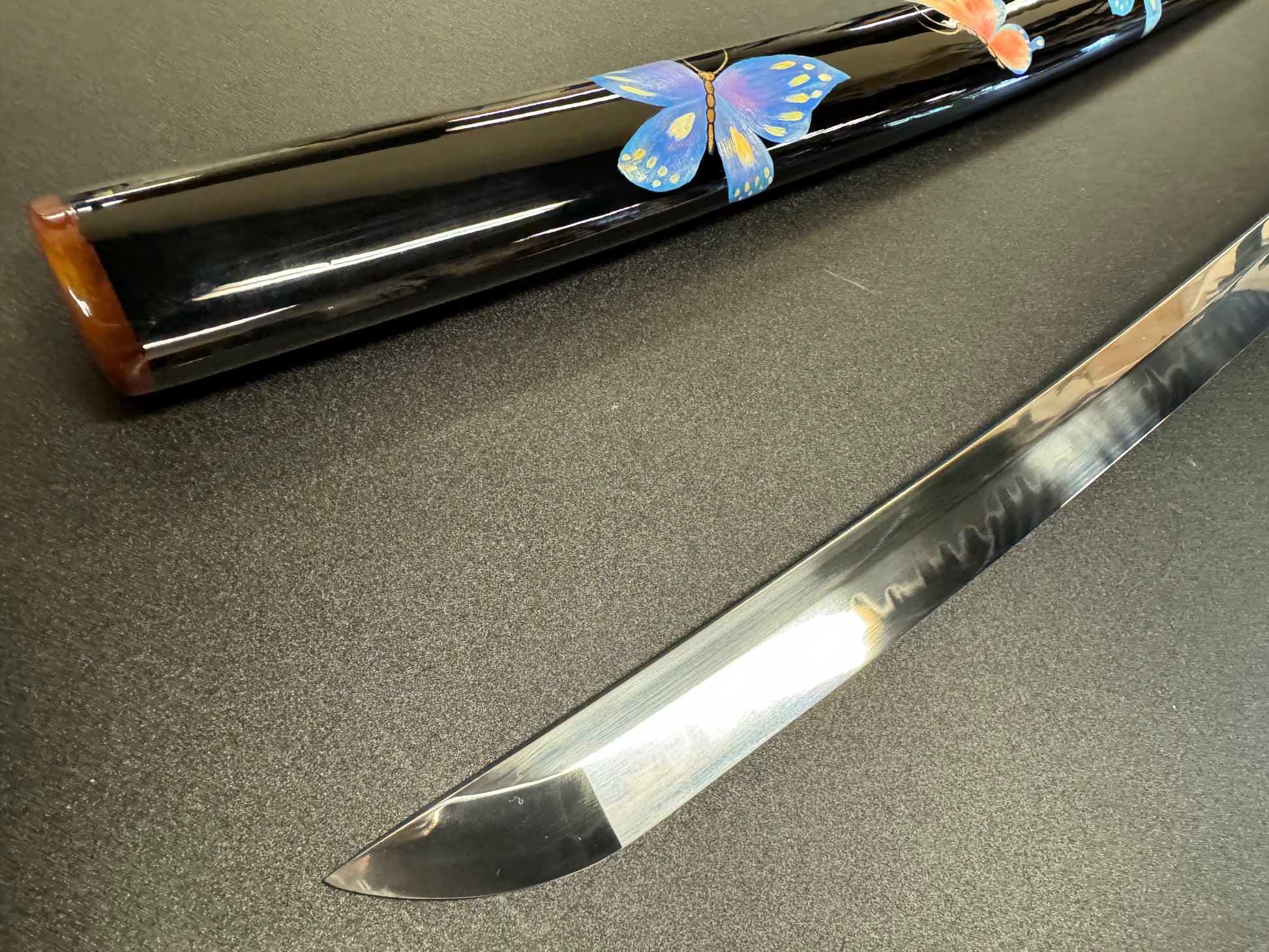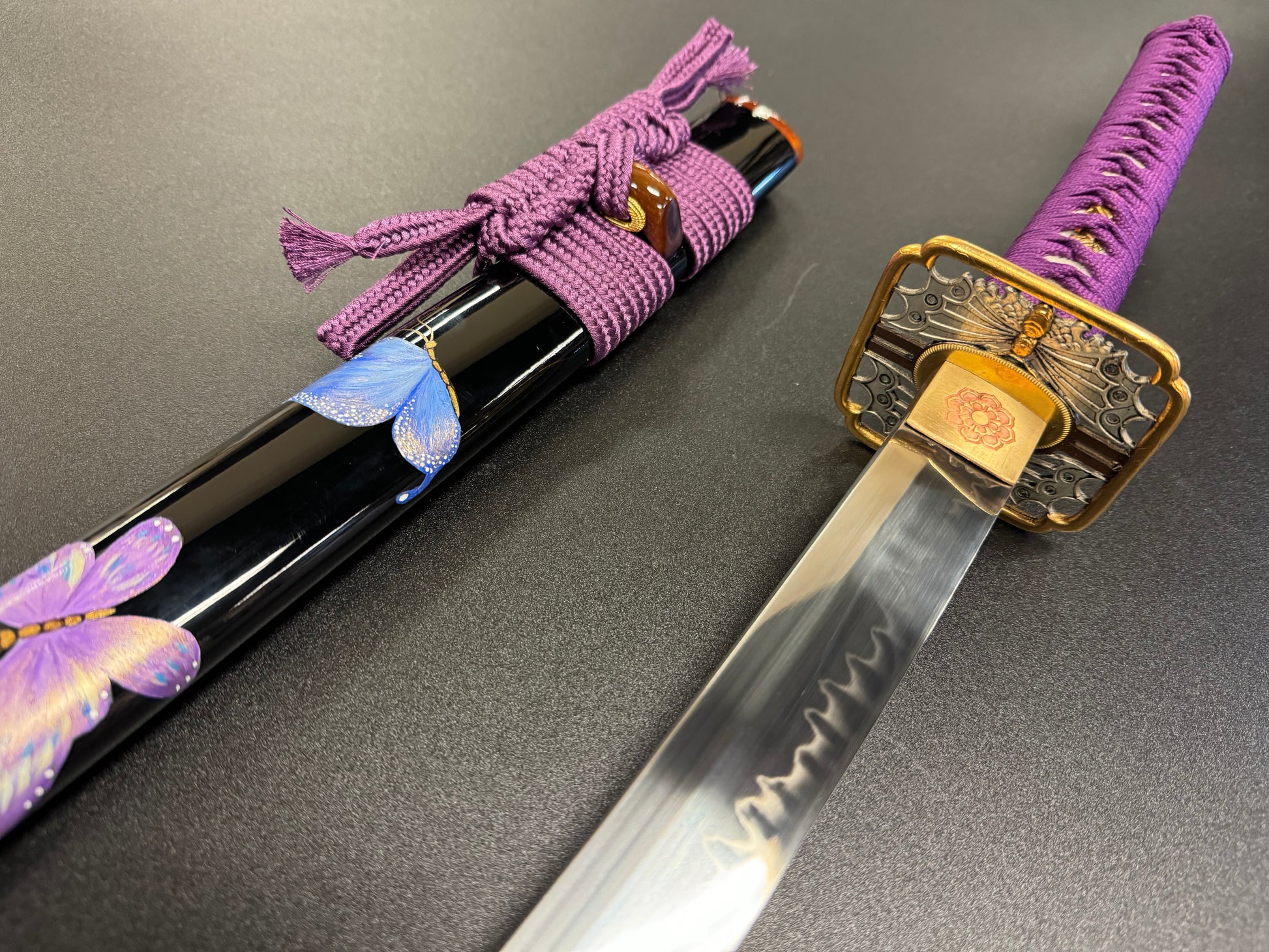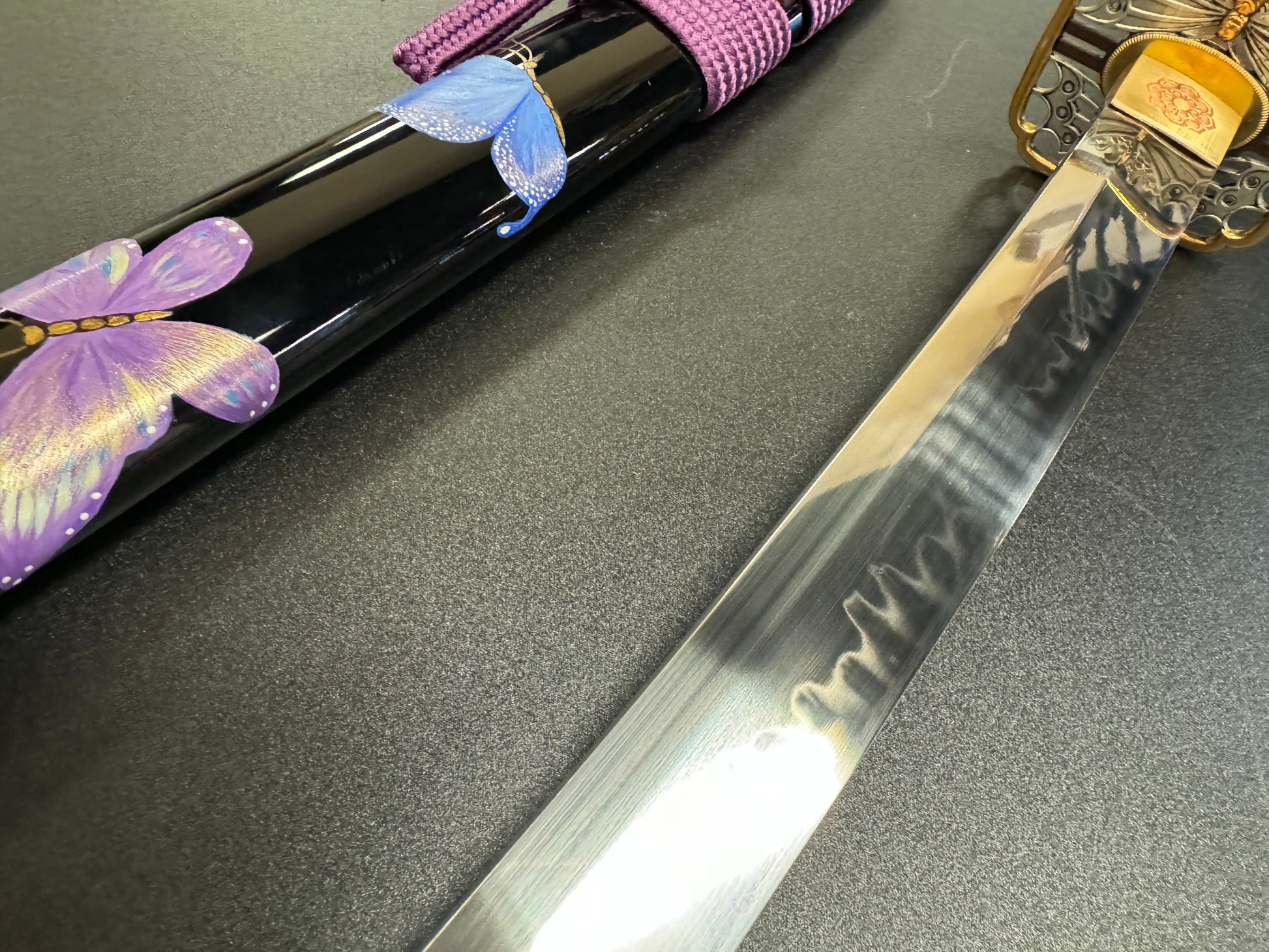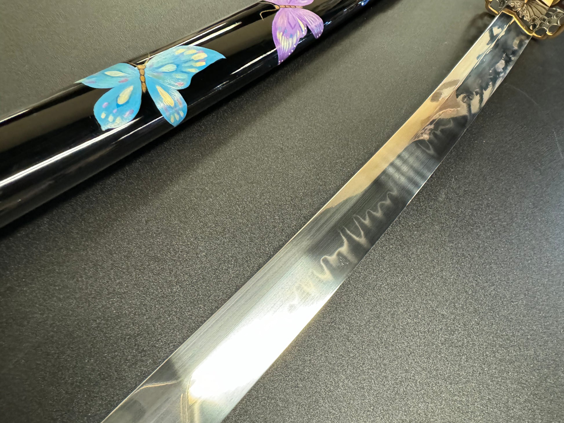 Phoenix Arms butterfly-themed Katana forged from T10 with natural Hamon.