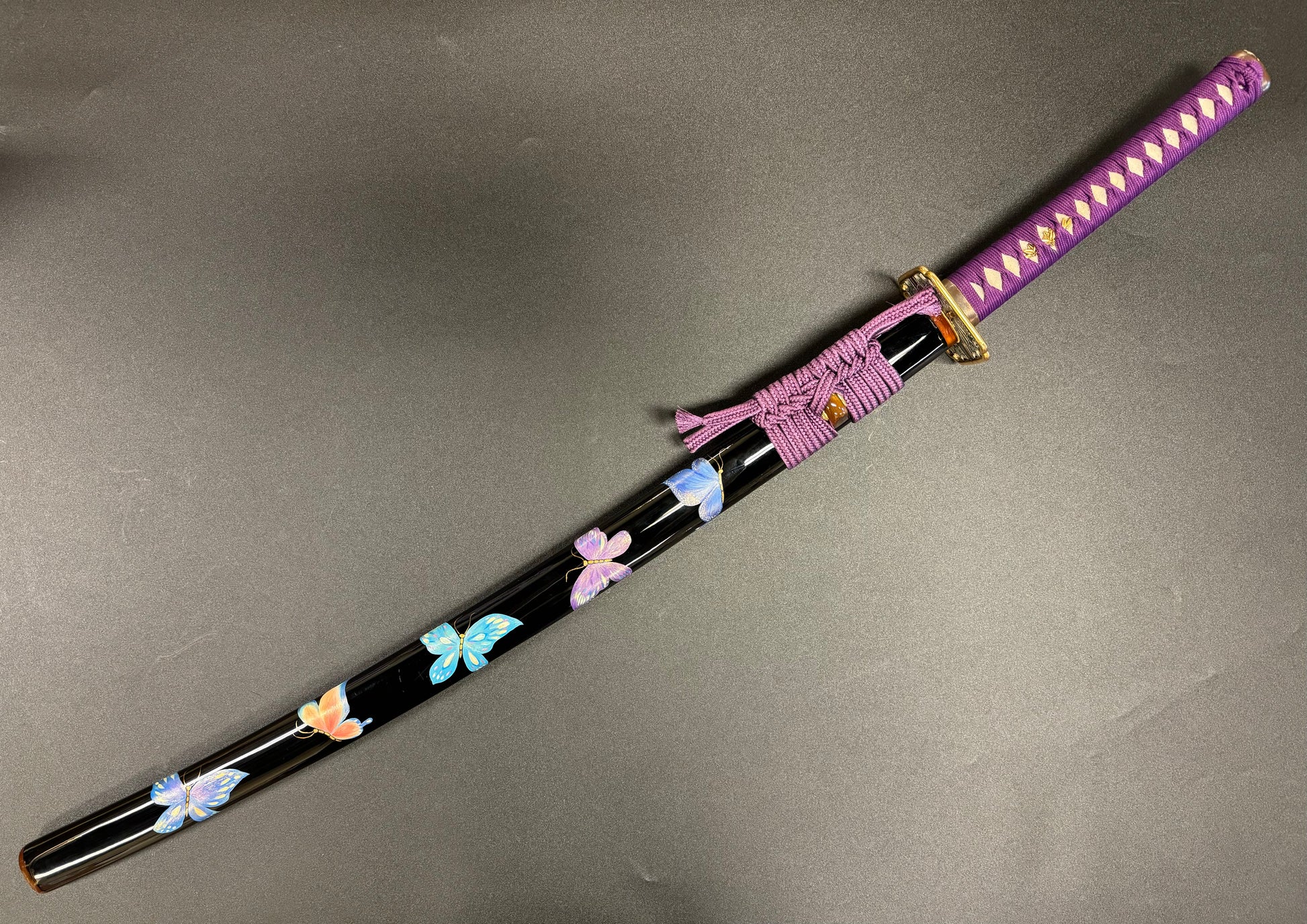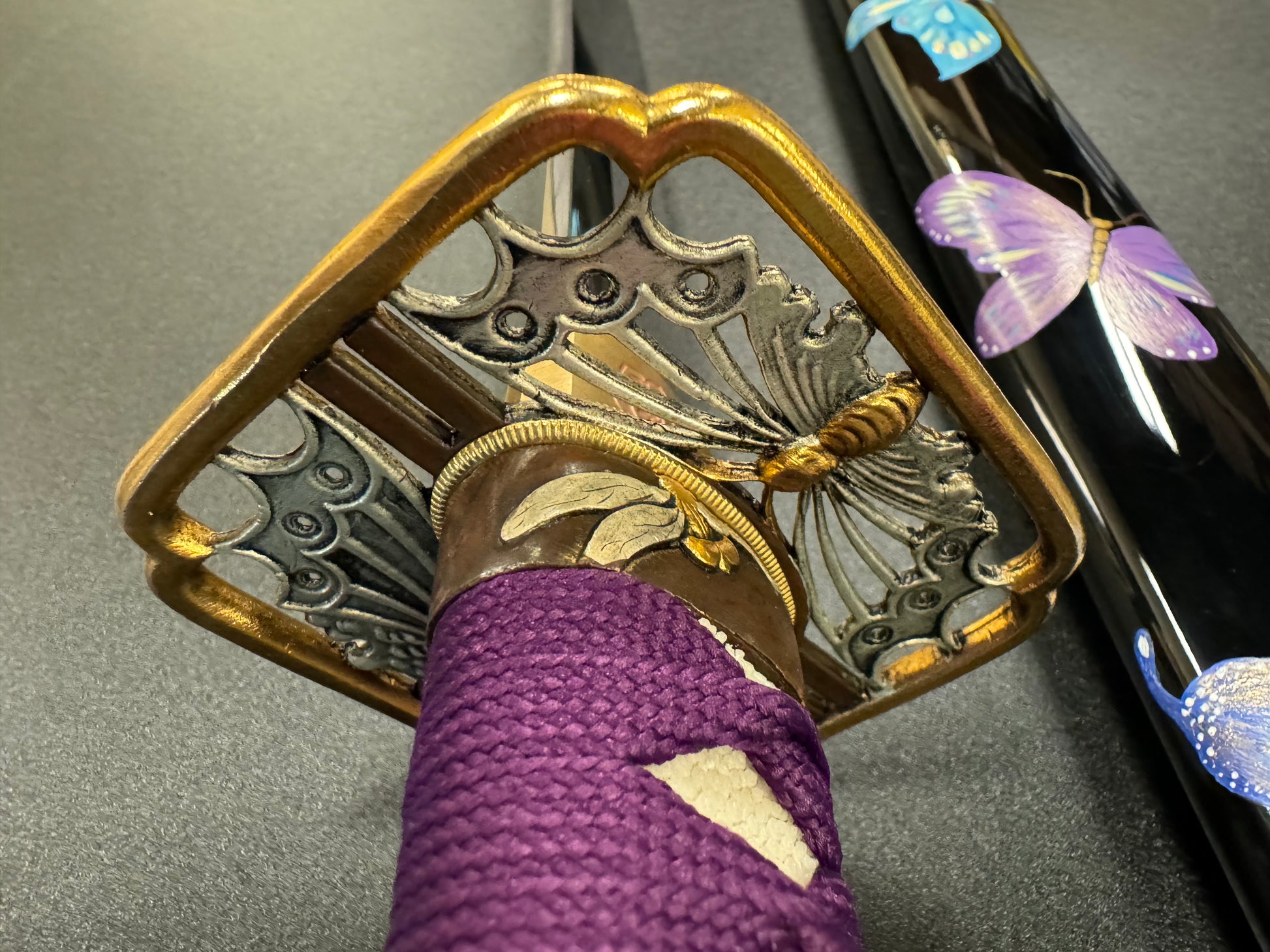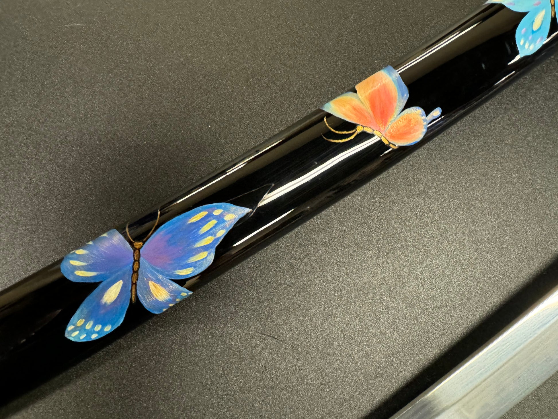 Saya (scabbard): Black lacquer with handpainted butterfly design, ox horn reinforcement