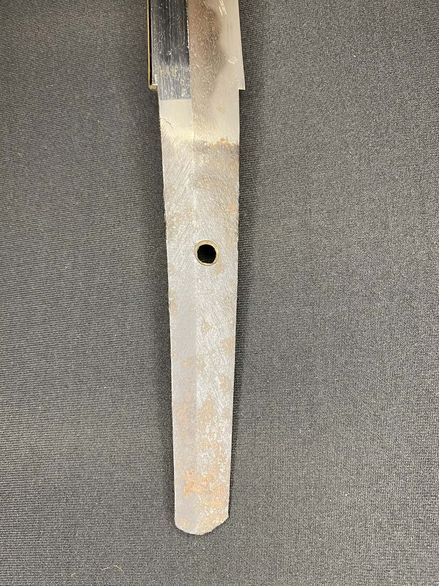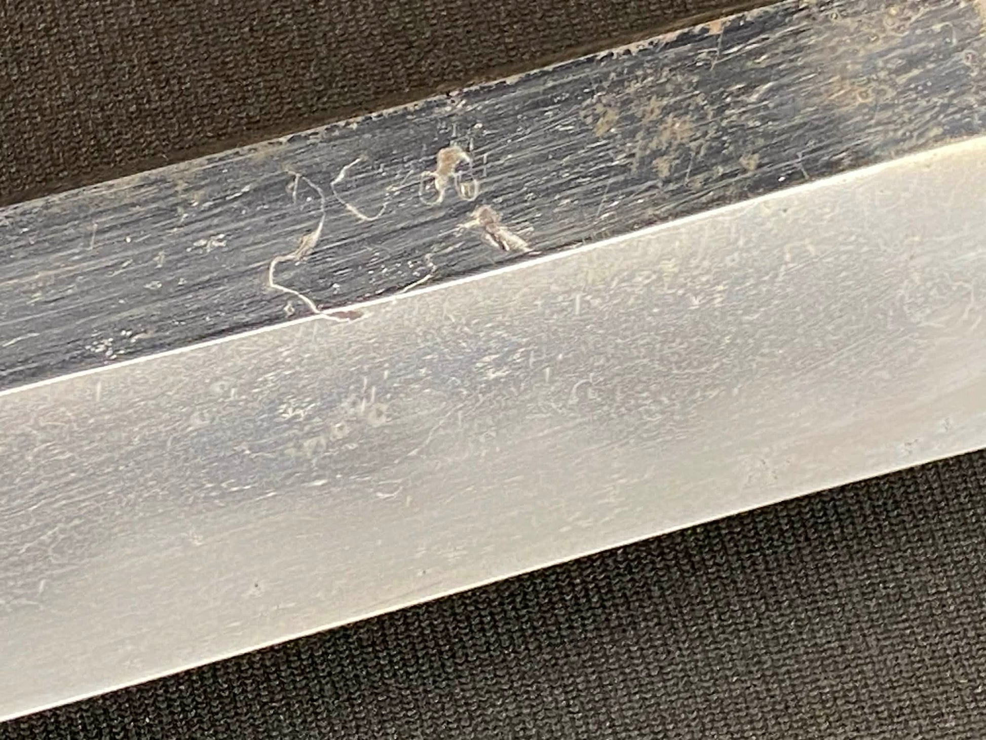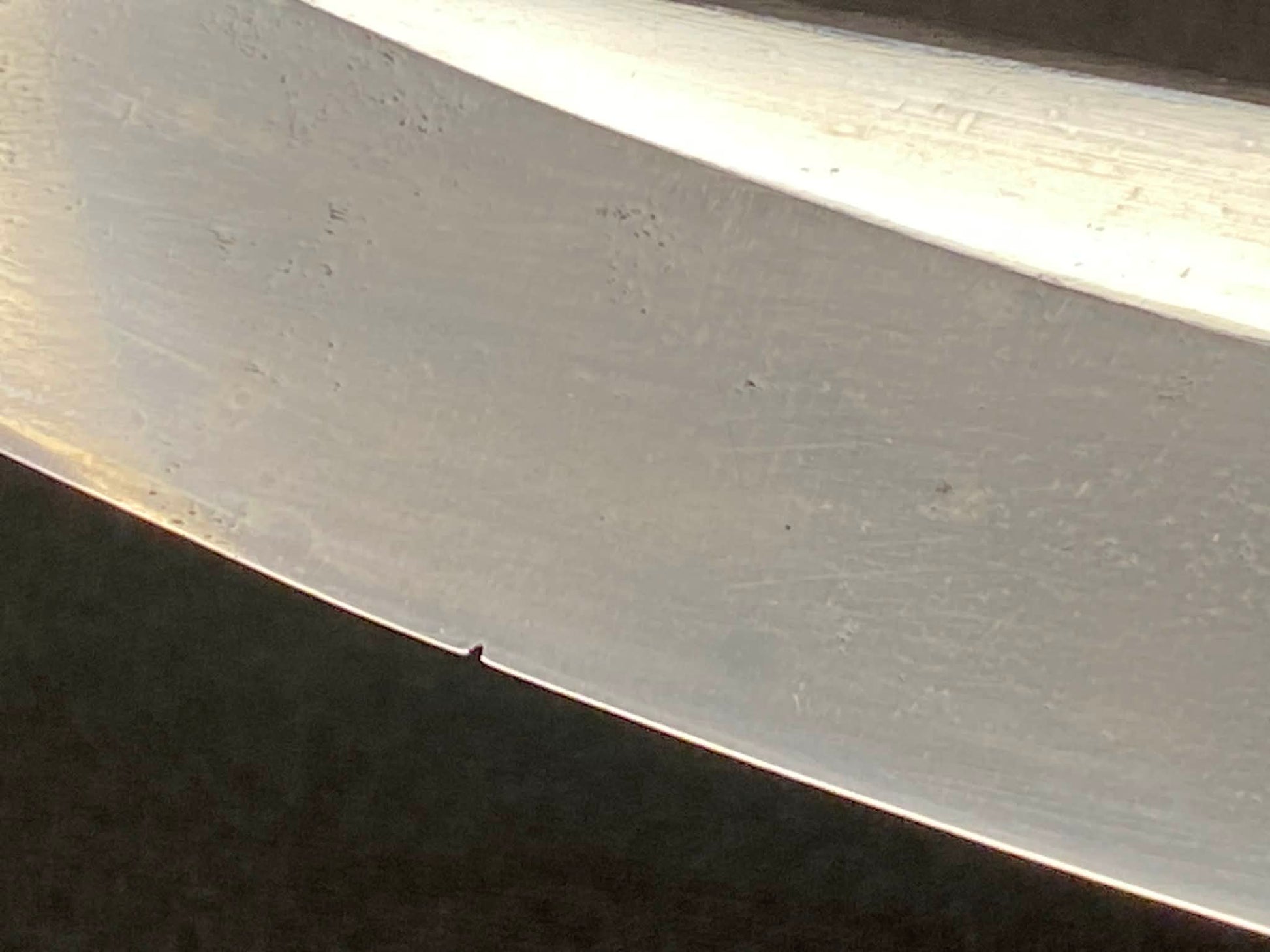 It has two hakobore on the edge and a scar on the shinogi, all possible battle damage. Please note the fukure.