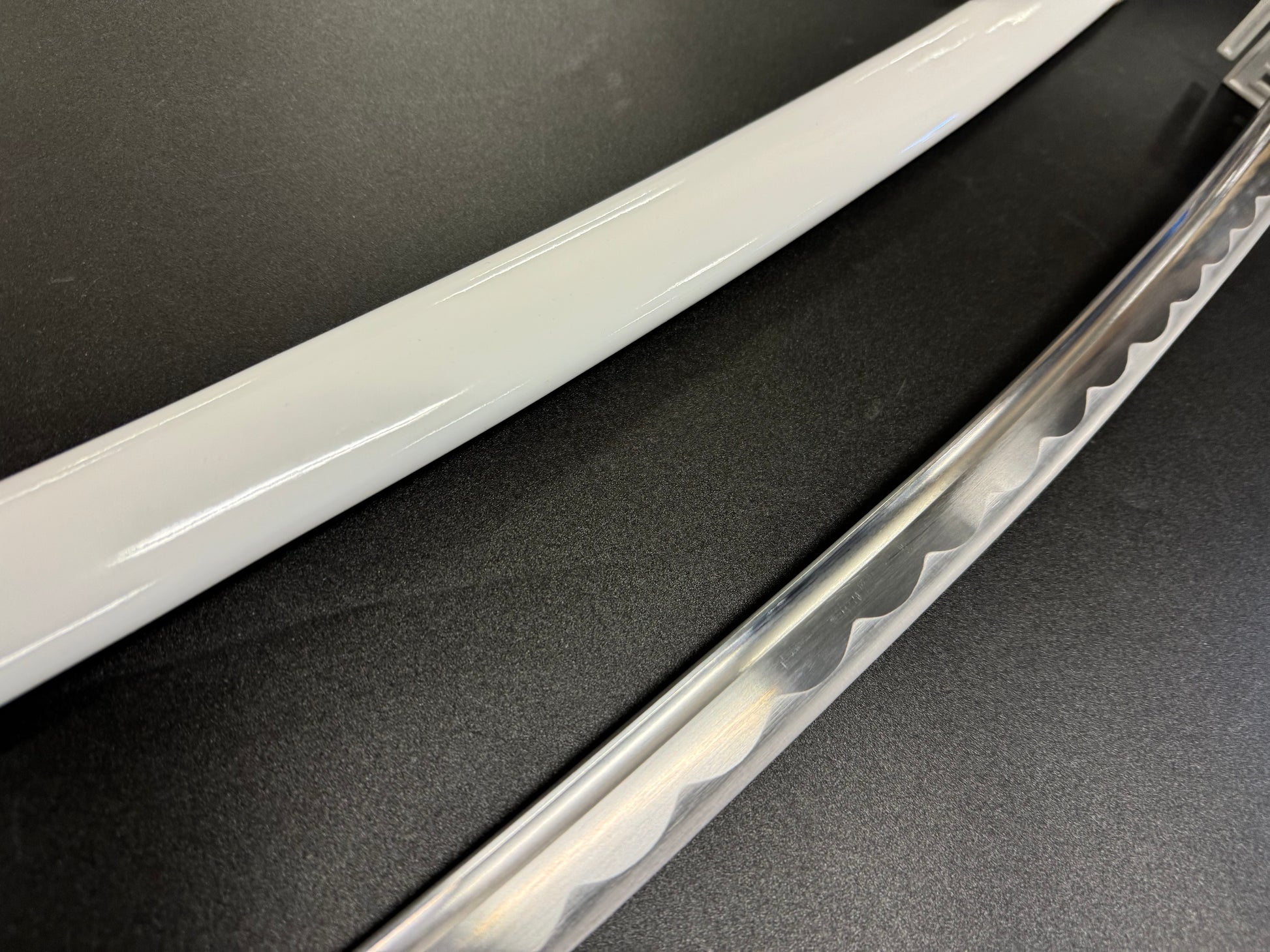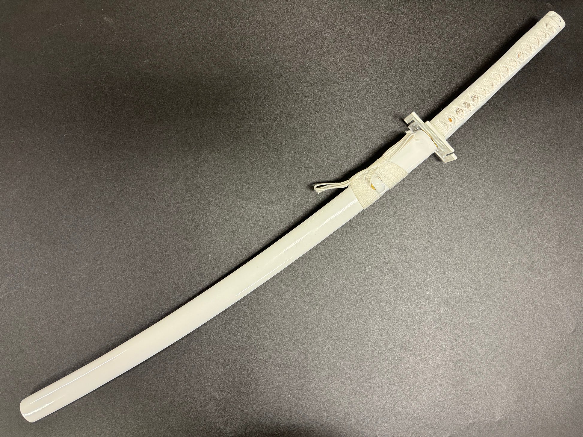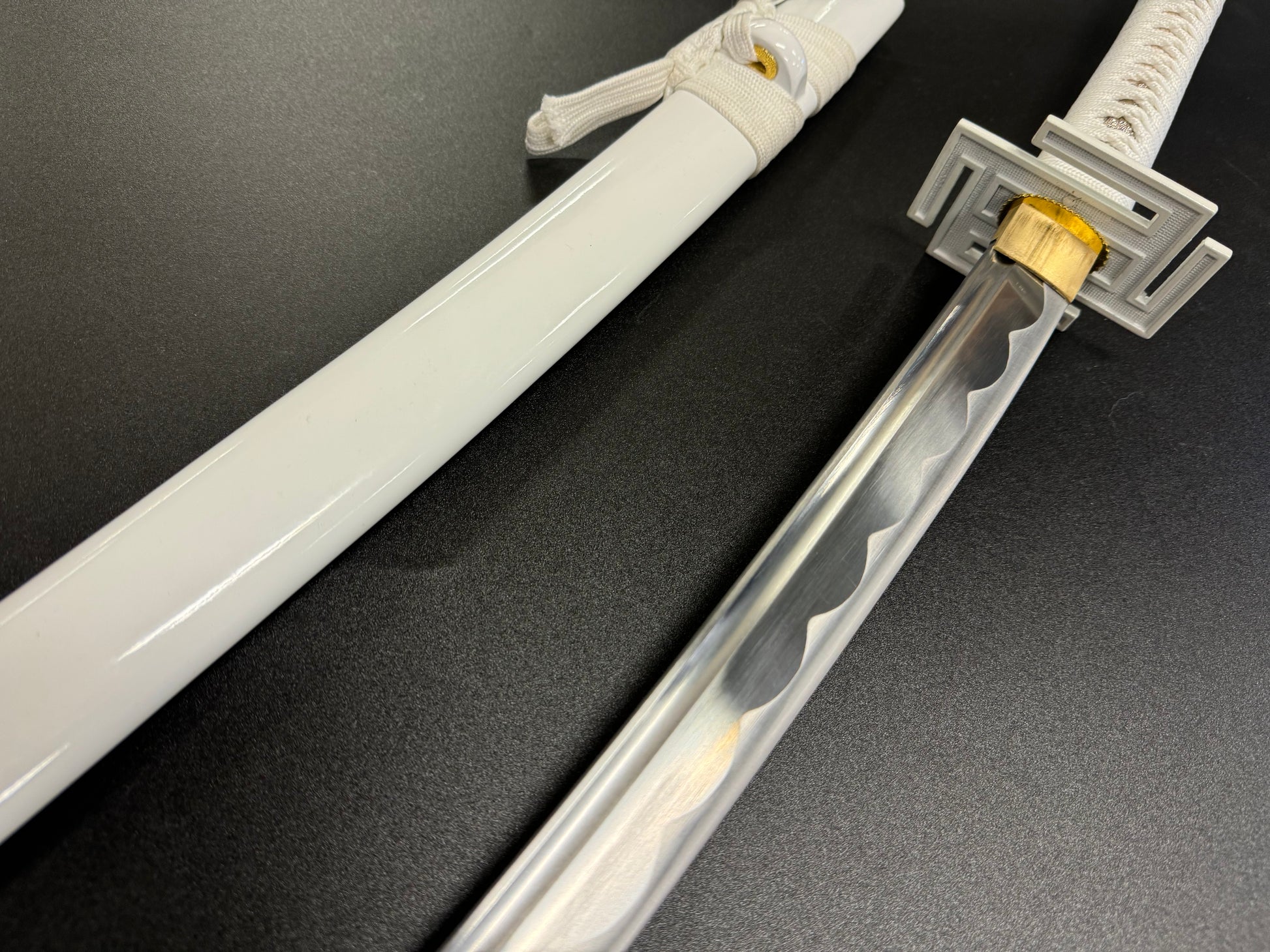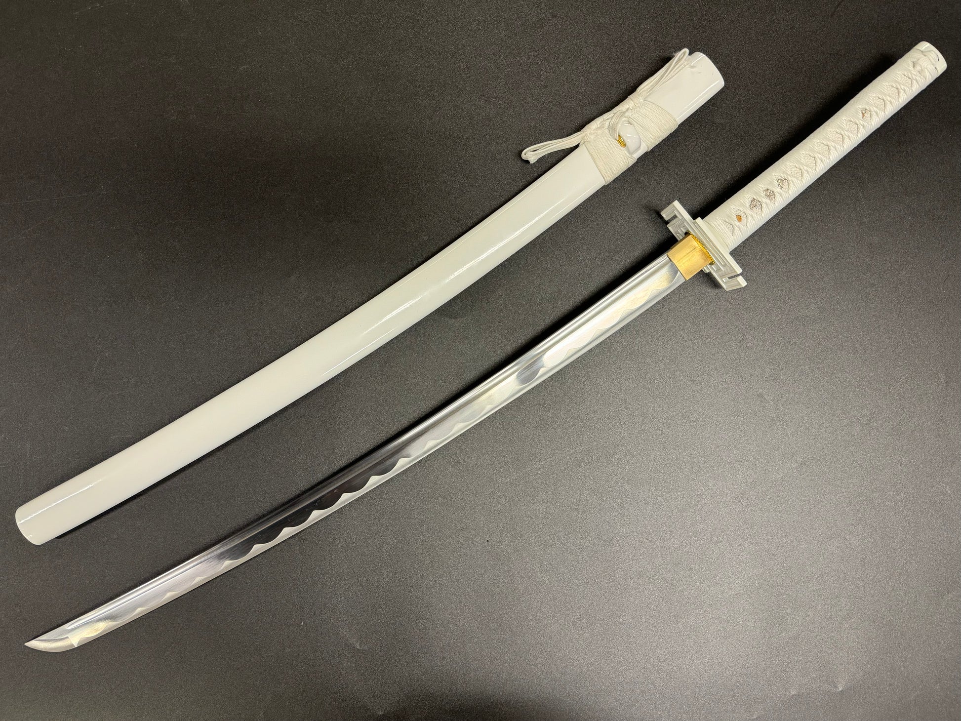 This stunning white Katana is a genuine replica of Ichigo's Bankai sword (Tensa Zangetsu) from the popular anime Bleach. Experience Ichigo Kurosaki’s epic battles against the Espadas and Aizen with its white 1045 steel blade and swastika guard designed faithful to the manga version.