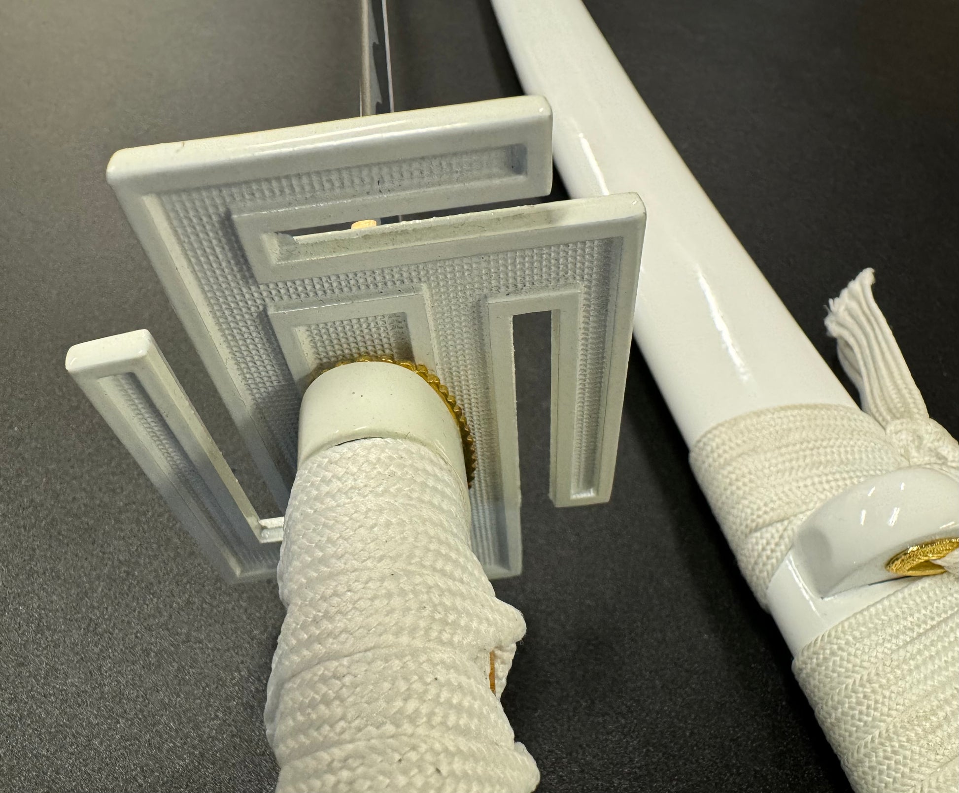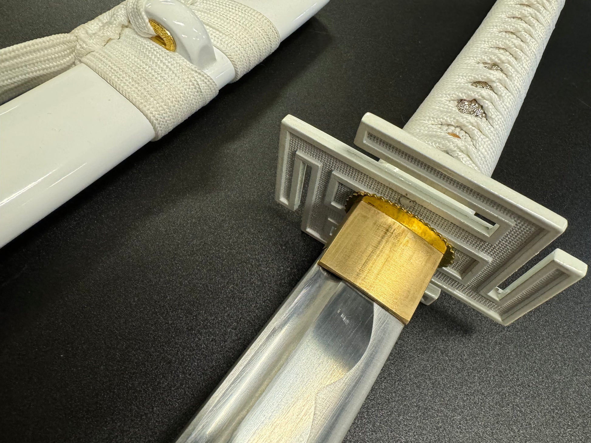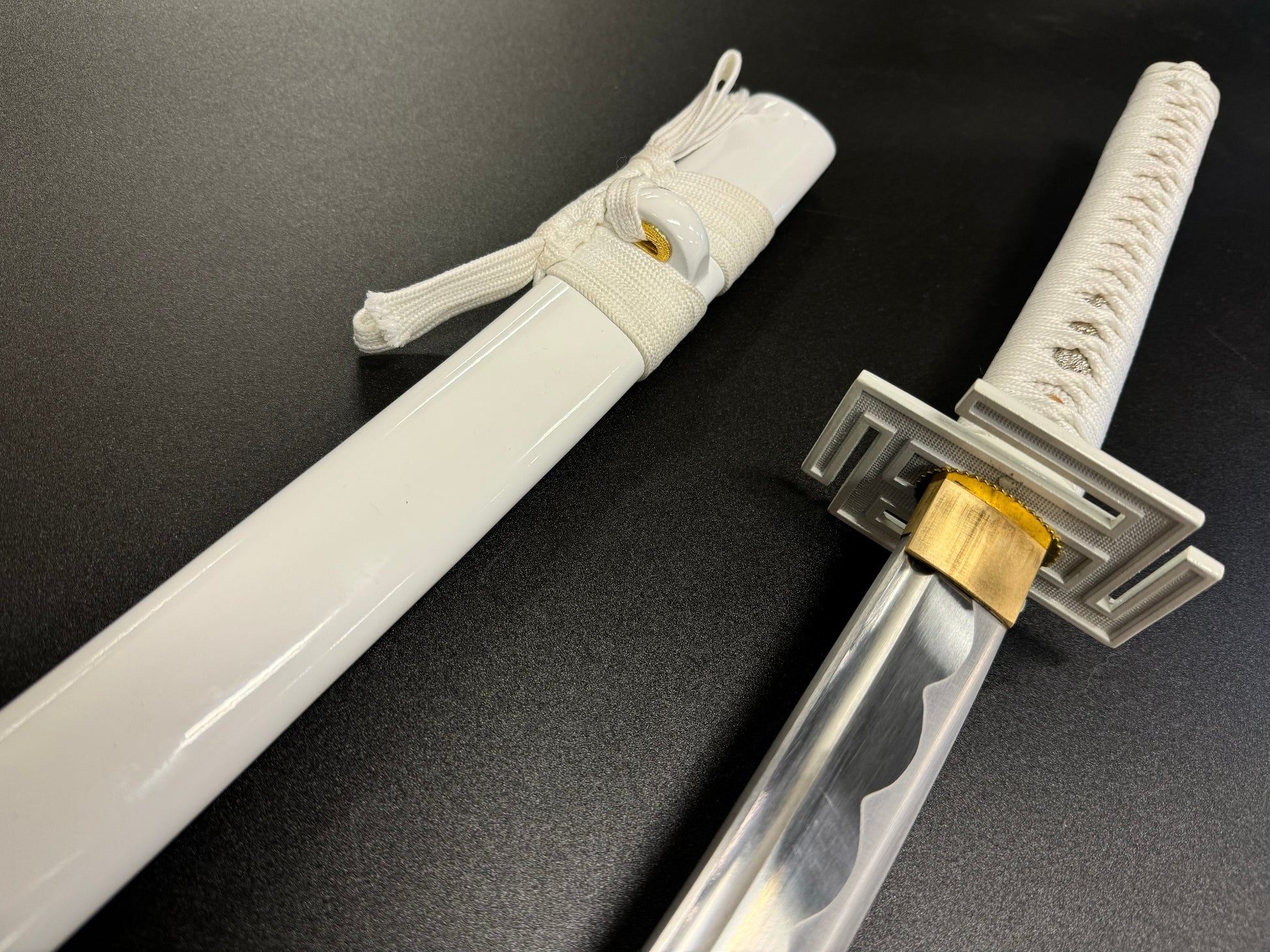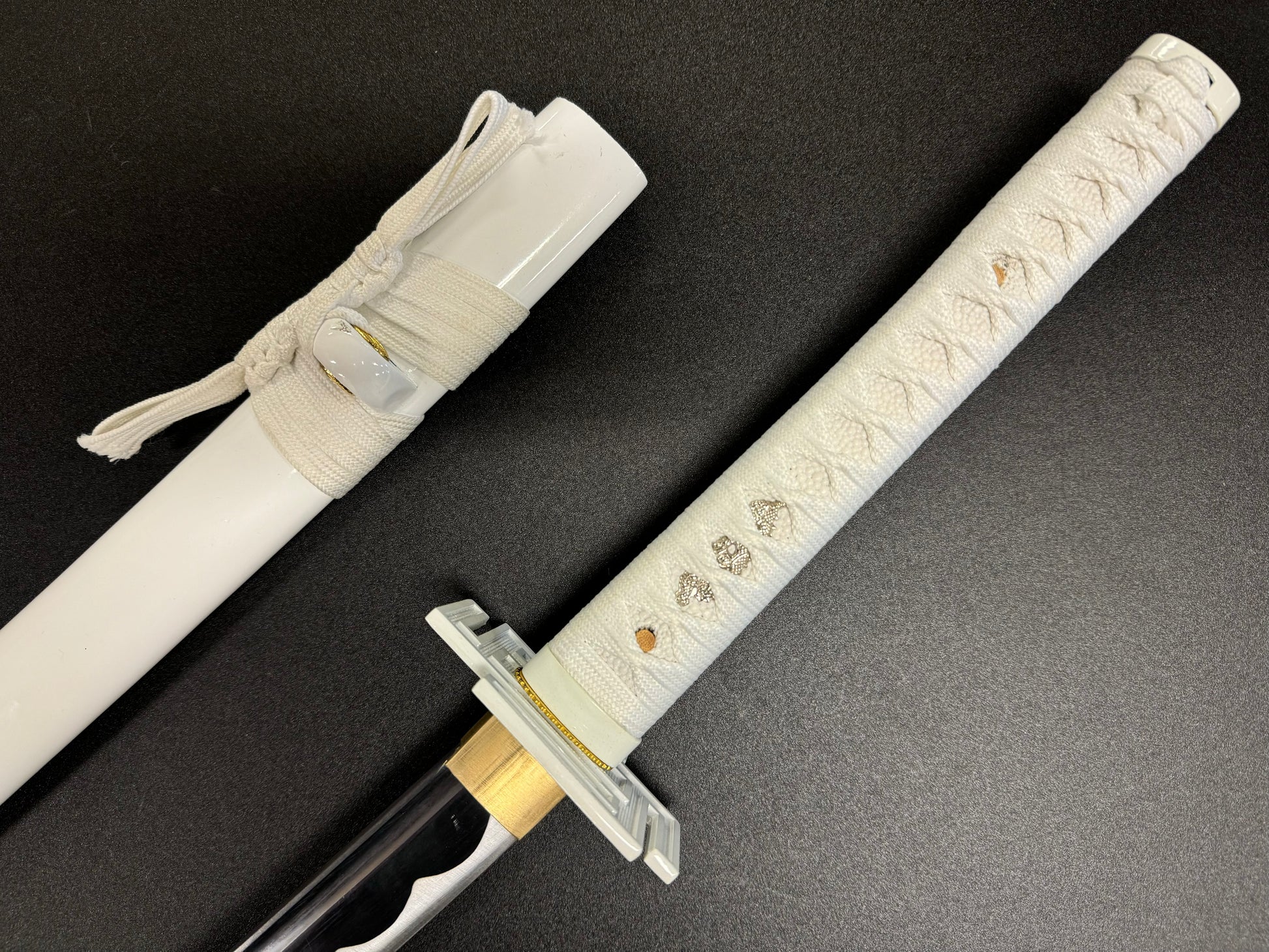 This stunning white Katana is a genuine replica of Ichigo's Bankai sword (Tensa Zangetsu) from the popular anime Bleach. Experience Ichigo Kurosaki’s epic battles against the Espadas and Aizen with its white 1045 steel blade and swastika guard designed faithful to the manga version.