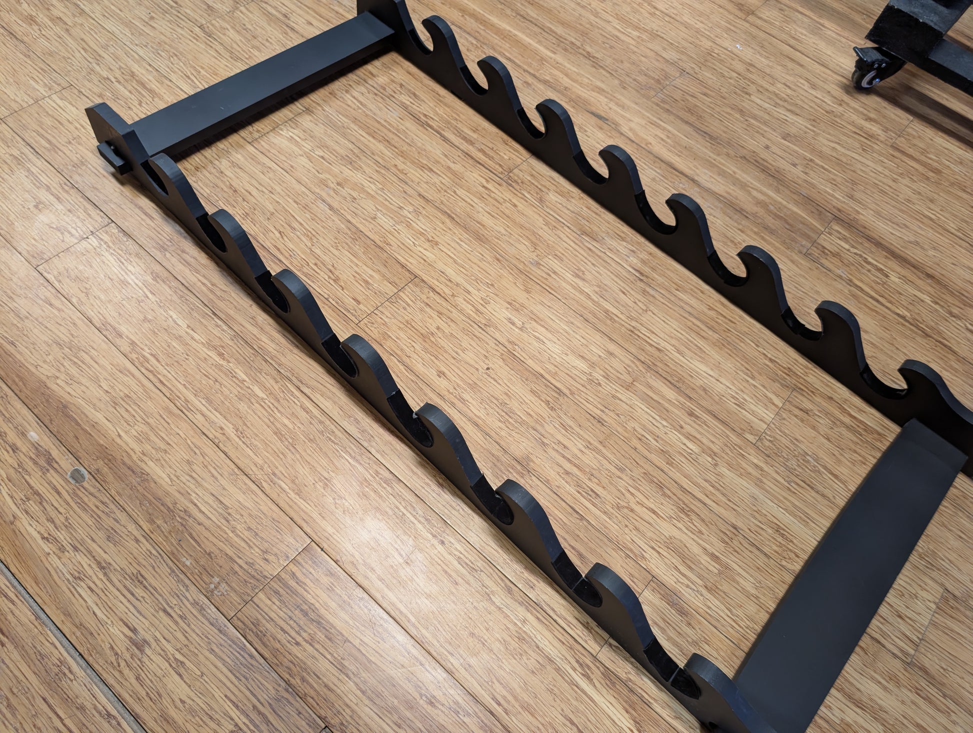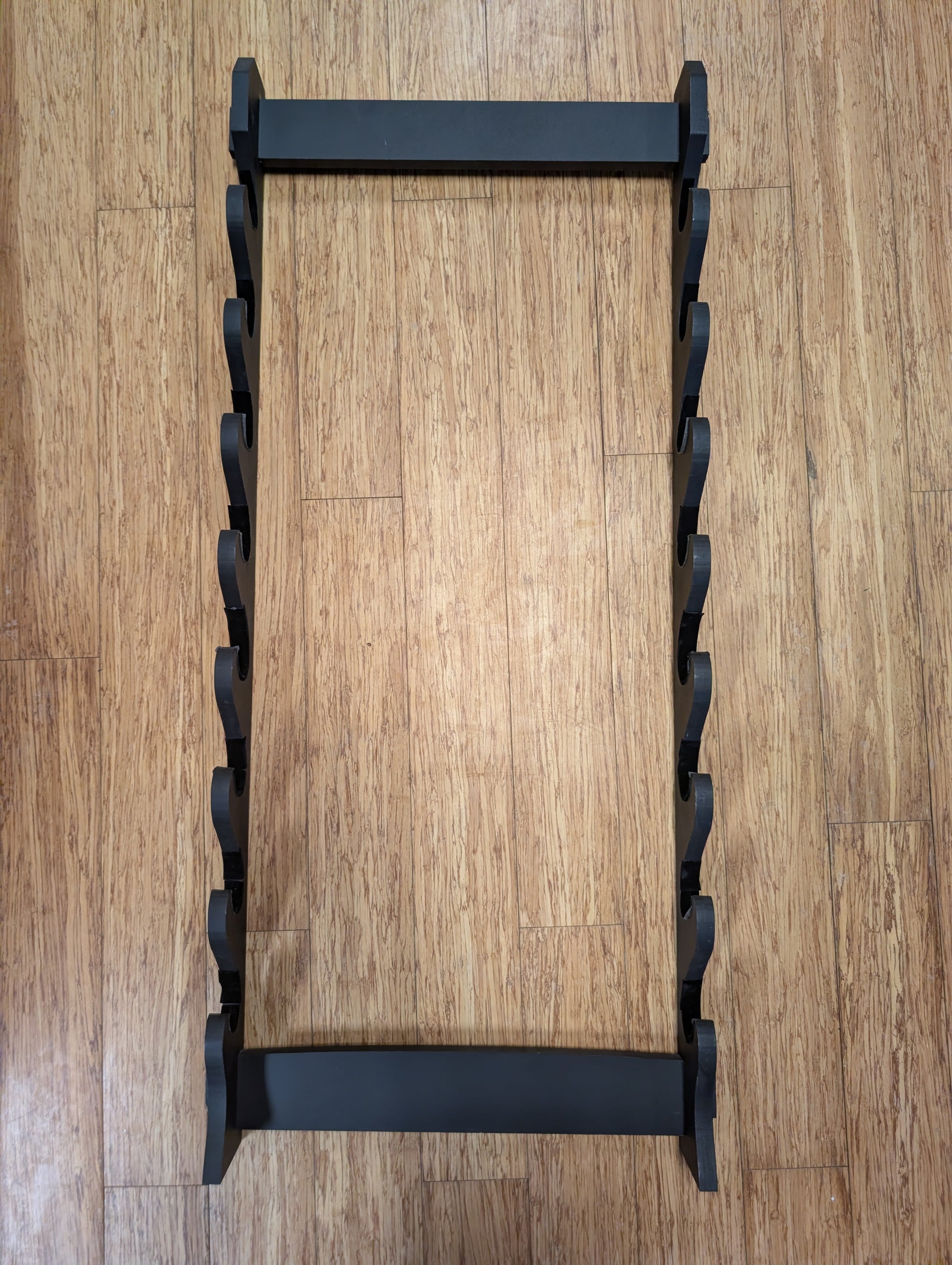 Show of your prized swords in style with this 8-tier rack from Phoenix Arms. It features a lattice-desiged top brace, with 8 tiers to protect your swords while on display. All assembly and installation hardware is included.