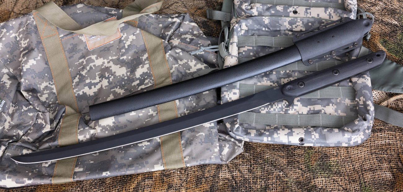 18 1/2" black oxide coated 9260 spring steel bladeFull tang, triple riveted G10 handleLight fiberglass scabbard with Molle compatible platformPP